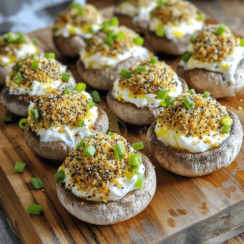 - 12 large cremini or button mushrooms - 4 oz cream cheese, softened - 1/4 cup shredded mozzarella cheese - 1/4 cup finely chopped green onions - 1/4 cup plain breadcrumbs - 2 tablespoons everything bagel seasoning - 1 tablespoon olive oil - Salt and pepper to taste You can add extras to make these mushrooms unique. Try: - Crumbled bacon for a savory twist. - Chopped spinach for more greens. - Different cheeses, like feta or cheddar. When picking mushrooms, look for these signs: - They should feel firm and plump. - Check for smooth, unblemished caps. - Avoid mushrooms that look slimy or shriveled. - Smell them; fresh mushrooms have a light, earthy scent. With these ingredients and tips, you’re set to make delightful Air Fryer Everything Bagel Stuffed Mushrooms! Start by warming your air fryer to 350°F (175°C). Next, grab your large cremini or button mushrooms. Gently clean each mushroom by wiping it with a damp cloth. This step is key to keeping them fresh. After cleaning, remove the stems from the caps. Finely chop these stems and set them aside for later. This will add great flavor to your filling. In a mixing bowl, combine the chopped mushroom stems, softened cream cheese, shredded mozzarella cheese, and finely chopped green onions. Add in the plain breadcrumbs and two tablespoons of everything bagel seasoning. Don’t forget a pinch of salt and pepper to taste. Mix everything well until it forms a smooth filling. This mixture is what makes your stuffed mushrooms so tasty. Now, it’s time to fill the mushrooms. Use a spoon to generously fill each mushroom cap with your creamy mixture. Once filled, drizzle the stuffed mushrooms with olive oil. Sprinkle the remaining everything bagel seasoning on top for extra flavor. Place the stuffed mushrooms in a single layer in the air fryer basket. Make sure they don’t touch each other. Cook them for 10 to 12 minutes. They should turn golden brown and the filling should be bubbly. After cooking, carefully take them out and let them cool for a few minutes. Enjoy these delicious snacks warm! To make sure your stuffed mushrooms cook evenly, follow these steps: - Preheat your air fryer to 350°F (175°C). - Clean mushrooms gently to avoid bruising. - Arrange mushrooms in a single layer. Do not stack them. - Leave space around each mushroom for air to flow. This helps them cook properly and get that nice golden color. Flavor is key in any dish. Here’s how to boost it in your stuffed mushrooms: - Use fresh ingredients. Fresh mushrooms and green onions add more taste. - Mix your filling well. This ensures every bite is full of flavor. - Don’t skip the everything bagel seasoning. It adds a unique taste that makes these special. - Drizzle a bit of olive oil on top before cooking. It helps with browning and flavor. Each of these tips will help create a delicious bite. These stuffed mushrooms shine as an appetizer or snack. Here are some ideas to serve them: - Plate them on a rustic wooden board for a nice look. - Garnish with extra green onions for color and freshness. - Serve warm with dipping sauces like ranch or marinara. - Pair them with a light salad for a full meal. These ideas will make your stuffed mushrooms even more enjoyable! {{image_2}} You can easily make these stuffed mushrooms vegetarian. Instead of cream cheese, try using a plant-based cream cheese. It adds the same creamy texture and taste without the dairy. You can also replace the mozzarella with vegan cheese. Look for options that melt well. This way, you keep the dish rich and tasty while making it plant-friendly. For those who are gluten-free, swap out the plain breadcrumbs. Use gluten-free breadcrumbs or almond flour instead. Both options will give you a nice crunch. Just make sure to check that your everything bagel seasoning is gluten-free too. This keeps the recipe safe for everyone while still being delicious. Experimenting with cheese can bring new flavors to your stuffed mushrooms. You can use goat cheese for a tangy kick. Feta cheese also works well, giving a salty and creamy bite. If you love a stronger flavor, try blue cheese. Each cheese choice offers a unique taste, so feel free to mix it up! After enjoying your Air Fryer Everything Bagel Stuffed Mushrooms, let them cool. Place any leftovers in an airtight container. Store them in the fridge for up to three days. This keeps them fresh and tasty for your next snack. If you want to save some for later, freezing works well. First, let the stuffed mushrooms cool completely. Then, arrange them in a single layer on a baking sheet. Freeze them for about two hours until firm. Once frozen, transfer them to a freezer-safe bag or container. You can keep them in the freezer for up to three months. To enjoy your stuffed mushrooms again, you have a few options. For the best results, reheat them in the air fryer. Set it to 350°F (175°C) and cook for about 5-7 minutes. This method keeps them crispy. You can also use a microwave, but they may lose some texture. Heat them for about 30-60 seconds, checking often so they don’t get too hot. Enjoy your delicious mushrooms! Yes, you can use other mushrooms. Try portobello, shiitake, or oyster mushrooms. Each type adds its own flavor. Portobello has a meaty taste, while shiitake offers a woodsy note. Oyster mushrooms have a soft texture and mild flavor. Just make sure the mushrooms are large enough to hold the filling. To cook these in the oven, preheat it to 375°F (190°C). Prepare the mushrooms as you would for the air fryer. Fill them with the cream cheese mix. Place them on a baking sheet lined with parchment. Bake for about 15-20 minutes until golden and bubbly. Keep an eye on them to avoid burning. Great dipping sauces include ranch, garlic aioli, or marinara. Ranch adds a cool, creamy touch. Garlic aioli gives a strong flavor punch. Marinara brings a nice, tangy contrast. You can also try a spicy sriracha mayo for a kick. Feel free to experiment with your favorite sauces! In