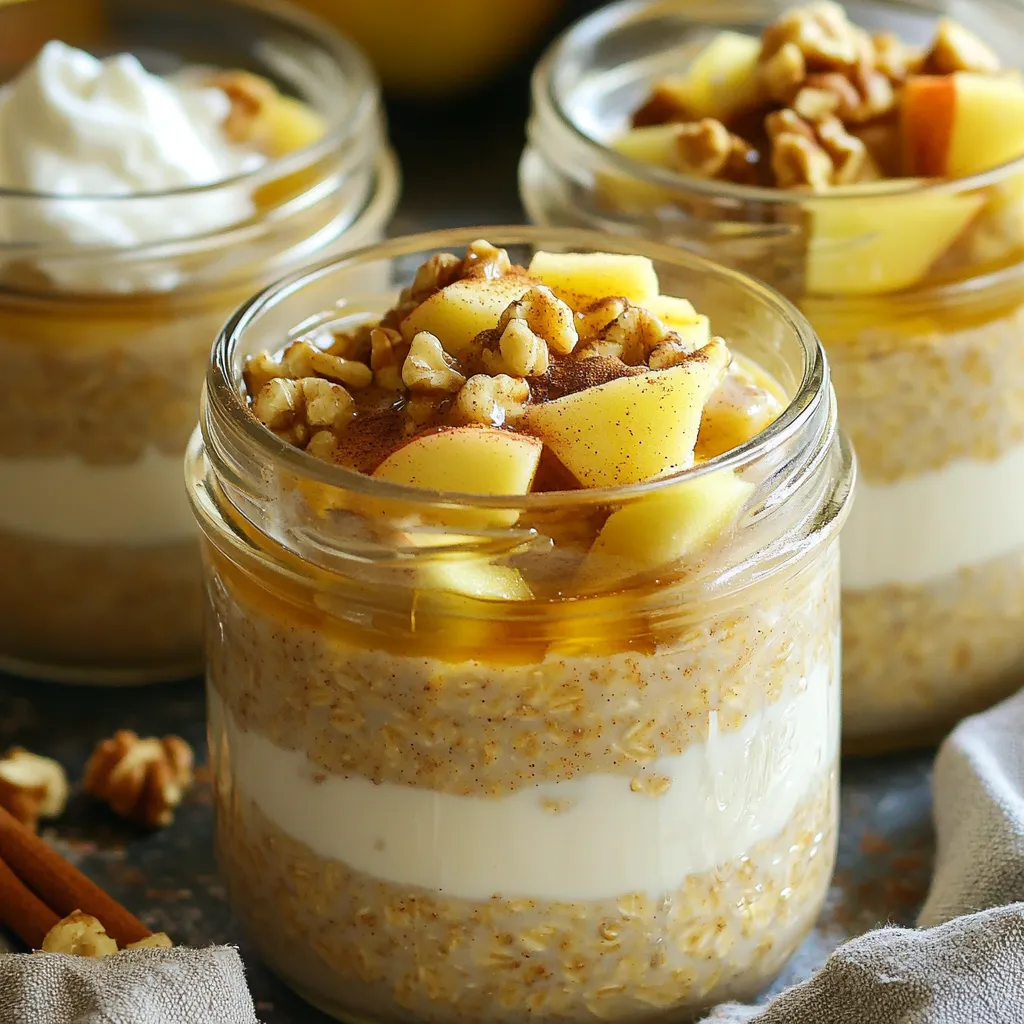 To make Apple Pie Overnight Oats, you need a few key ingredients. These create the base and flavor: - 1 cup rolled oats - 1 cup unsweetened almond milk (or any milk of your choice) - 1 medium apple, peeled and diced - 1 tablespoon maple syrup (adjust for sweetness) - 1 teaspoon vanilla extract - 1 teaspoon ground cinnamon - 1/4 teaspoon nutmeg - A pinch of salt These ingredients work together to mimic the warm, sweet taste of apple pie. You can enhance your oats with a few optional ingredients. These add creaminess and richness: - 2 tablespoons Greek yogurt (optional, for creaminess) Adding Greek yogurt makes the oats smooth and rich. It also boosts protein, making your breakfast more filling. When you serve your oats, toppings can add texture and flavor. Here are some great ideas: - Chopped walnuts or pecans for crunch - A sprinkle of cinnamon on top These toppings give your dish a delightful finish. They also make your breakfast look beautiful and inviting. Enjoy your Apple Pie Overnight Oats! To start, gather all your ingredients. In a medium bowl, combine: - 1 cup rolled oats - 1 cup unsweetened almond milk (or any milk of your choice) - 1 medium apple, peeled and diced - 1 tablespoon maple syrup (adjust for sweetness) - 1 teaspoon vanilla extract - 1 teaspoon ground cinnamon - 1/4 teaspoon nutmeg - A pinch of salt If you want creaminess, add 2 tablespoons of Greek yogurt. Mix everything well. This ensures all flavors blend nicely. You will smell the sweet spices and apples. That aroma will make you excited for tomorrow's breakfast! Once the mixture is ready, it's time to transfer it. Use individual jars or airtight containers. If you like, layer the oats for a fun look. Cover each container with a lid. Place them in the fridge. Let them soak overnight or for at least four hours. This soaking time allows the oats to soften and the flavors to meld together. In the morning, take the oats out of the fridge. Give them a good stir to mix everything again. Taste them and adjust the sweetness if needed. For a tasty crunch, top with chopped walnuts or pecans. If you want, sprinkle a bit more cinnamon on top. Now, you're ready to enjoy your apple pie overnight oats! To make your oats super creamy, use Greek yogurt. It adds richness and a nice texture. If you want a lighter version, skip the yogurt. Instead, let the oats soak longer. The longer they sit, the softer they get. Stir them well before eating to blend everything nicely. Sweetness is key to a great dish. Start with one tablespoon of maple syrup. After soaking, taste your oats. If you want more sweetness, add a little more syrup. You can also try honey or agave. Choose what you like best. The apple adds natural sweetness too, so keep that in mind. To get the best flavor, mix everything well. Make sure the spices and apple are evenly spread. Letting the oats soak overnight helps all the flavors blend. You can add a pinch of salt to boost the taste. Try adding extra spices like ginger or allspice for a twist. Don’t be afraid to experiment! {{image_2}} If you want to make this recipe healthier, swap dairy for plant-based options. Use almond milk or oat milk instead of regular milk. Both give a nice creamy texture. If you miss creaminess, add a scoop of coconut yogurt. It’s rich and tasty, and it keeps things dairy-free. To boost protein, add Greek yogurt or protein powder. Mix in two tablespoons of Greek yogurt for extra creaminess. If you like protein powder, add a scoop when you combine the oats. This keeps your breakfast filling and helps fuel your day. While apple pie is delicious, you can try other flavors too. Swap apples for ripe bananas for a tropical twist. Add a tablespoon of cocoa powder for a chocolate version. You can also mix in berries for a fresh and fruity taste. The options are endless! Explore flavors to keep your breakfast exciting. To keep your apple pie overnight oats fresh, use airtight containers. Glass jars work great. They prevent spills and keep the oats tasty. If you want to serve them later, store them in the fridge. This keeps them cool and safe to eat. Avoid leaving them out at room temperature. These oats stay good for about five days in the fridge. Each day, the flavors get better! If you want to enjoy them longer, check for signs of spoilage. Look for odd smells or changes in texture. If they seem off, it’s best to toss them. You can freeze your apple pie overnight oats for up to three months. Use freezer-safe containers or bags. When you want to eat them, take them out a day ahead. Place them in the fridge to thaw overnight. This way, your breakfast will be ready to enjoy! Yes, you can use quick oats. They will soak up liquid faster. This means your oats will be softer in the morning. However, they may not have the same chewy texture as rolled oats. If you like a creamier feel, quick oats can work well. You can use any milk you enjoy. Options include cow’s milk, soy milk, or oat milk. Each type of milk will change the flavor slightly. Choose one that fits your taste or dietary needs. Overnight oats last up to five days in the fridge. Make sure to store them in airtight containers. This keeps them fresh and prevents them from absorbing other smells. If you notice any odd smells or colors, it’s best to toss them out. Yes, you can make these oats vegan easily. Just use plant-based milk and skip the Greek yogurt. You can also use maple syrup as your sweetener. This keeps the oats tasty and vegan-friendly. Overnight oats offer many health benefits. They are high in fiber, which helps digestion. They also provide lasting energy for your morning. Oats can lower cholesterol and help control blood sugar levels. Adding fruits and nuts boosts the nutrition even more. This article guides you through making delicious apple pie overnight oats. We covered key ingredients, added flavors, and toppings to enhance your dish. I shared step-by-step instructions for preparation and tips for perfect creaminess. You 