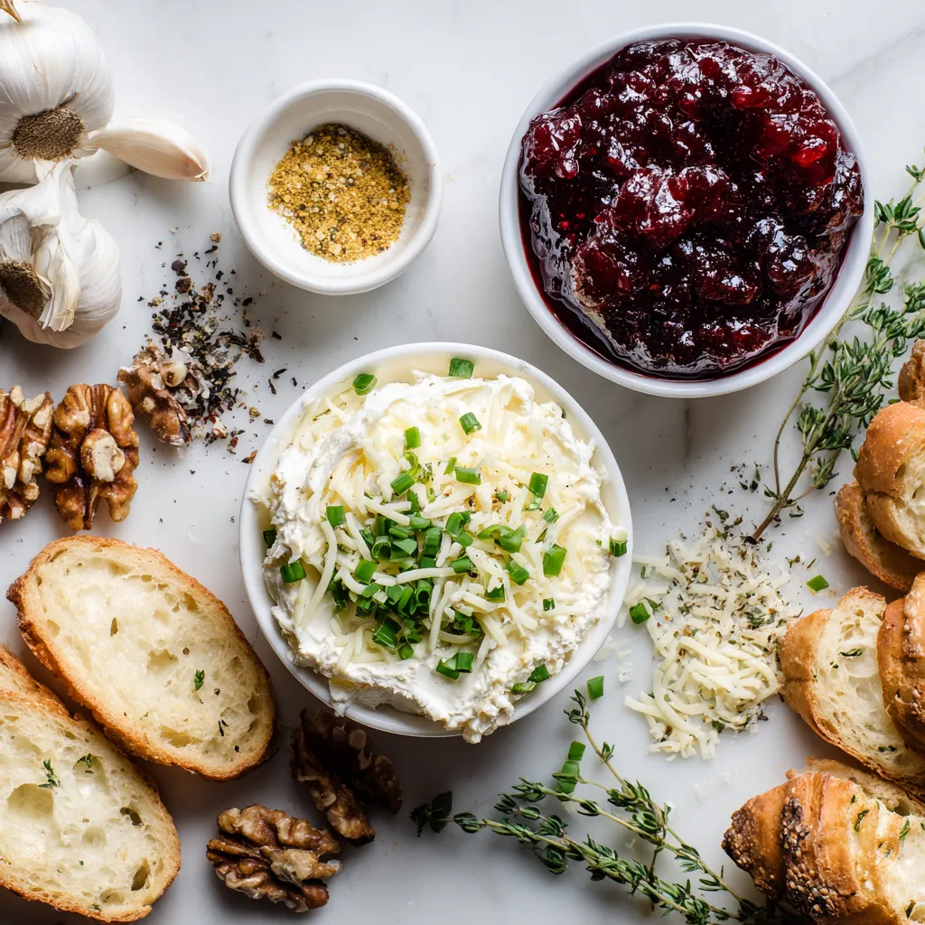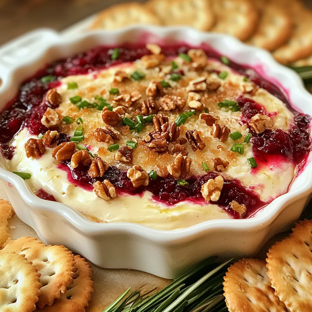 Here is a simple list of what you need for baked cranberry cream cheese dip: - 8 oz cream cheese, softened - 1 cup cranberry sauce - 1/2 cup shredded mozzarella cheese - 1/4 cup chopped green onions - 1/2 teaspoon garlic powder - 1/4 teaspoon black pepper - 1/2 teaspoon dried thyme - 1/2 cup chopped walnuts (optional) - Crackers or toasted baguette slices for serving Each ingredient plays a key role in this dish. The cream cheese forms the base, giving it a rich, creamy texture. The cranberry sauce adds a sweet and tart flavor that balances well with the cheese. Shredded mozzarella gives it a nice stretch and melts beautifully. Green onions add a fresh crunch, while garlic powder, black pepper, and dried thyme bring out robust flavors. If you want more crunch, add walnuts. Finally, serve this dip with your favorite crackers or toasted baguette slices to complete the experience. {{ingredient_image_1}} - Preheat your oven to 350°F (175°C). - In a medium mixing bowl, combine the softened cream cheese, cranberry sauce, shredded mozzarella, chopped green onions, garlic powder, black pepper, and dried thyme. Mix until well blended. - If you want more crunch, fold in walnuts at this stage. - Transfer the mixture into a small baking dish. Spread it evenly across the bottom. - Bake in the preheated oven for 25-30 minutes. Look for the dip to be bubbly and slightly golden on top. - Let the dip cool for a few minutes before serving. - Serve warm with crackers or toasted baguette slices for a tasty dip experience. To make your dip great, start with cream cheese at room temperature. This helps it blend well. Mix until smooth and creamy. Bake your dip until it is bubbly and golden on top. This gives it a nice texture and flavor. You can prepare the dip ahead of time. Just mix all the ingredients and put them in the fridge. This saves time when you are ready to bake. When it’s time to serve, bake it right from the fridge. If it’s cold, it may take a bit longer to heat through. Want to make your dip even better? Try adding herbs like rosemary or thyme. You can also mix in spices like cayenne for heat. Experiment with different cheeses too. Cheddar or goat cheese can add a unique twist to your dip. Enjoy the fun of creating your perfect flavor! Pro Tips Use Room Temperature Cream Cheese: This ensures a smoother texture and easier mixing, preventing any lumps in your dip. Experiment with Cheese: Feel free to substitute mozzarella with other cheeses like cheddar or gouda for a different flavor profile. Customize Your Toppings: Top the dip with extra walnuts, cranberries, or a drizzle of honey before serving for added visual appeal and flavor. Serve Immediately: This dip is best enjoyed warm, so serve it right after baking for the ultimate gooey experience. {{image_2}} You can swap out cream cheese for other cheeses. Try using goat cheese for a tangy taste. A blend of cream cheese and ricotta gives a light texture. For a richer flavor, use mascarpone. Nuts can also change the dip's crunch. Instead of walnuts, use pecans or almonds. Both add nice flavors and textures. If you want a nut-free option, skip them entirely. For gluten-free options, serve the dip with gluten-free crackers. You can also use veggie sticks like carrots or cucumbers for dipping. They add a fresh crunch and keep it healthy. If you want a vegan version, replace cream cheese with a plant-based cream cheese. Look for brands that taste good and have a smooth texture. This swap keeps the dip creamy and delicious. To kick up the heat, add diced jalapeños. Mix them in before baking for a spicy twist. They add a fun zing to the dip. You can also try different fruit sauces. Instead of cranberry sauce, use raspberry or cherry sauce for a new flavor. Each fruit brings its unique taste and sweetness, making the dip exciting. After you enjoy your Baked Cranberry Cream Cheese Dip, store any leftovers in the fridge. Place the dip in an airtight container. This helps keep it fresh. You can also use plastic wrap directly over the dish. The dip will stay good for about 3-4 days. You can freeze the dip if you want to keep it longer. First, let the dip cool completely. Then, transfer it to a freezer-safe container. Make sure to leave some space at the top for expansion. The dip can be frozen for up to 2 months. To thaw, move the dip to the fridge overnight. This helps it thaw slowly and safely. You can also thaw it in the microwave on low power for faster results. When you are ready to enjoy the dip again, reheat it carefully. The best method is to use the oven. Preheat your oven to 350°F (175°C). Place the dip in an oven-safe dish and cover it with foil. Heat for about 15-20 minutes. Check if it's warm and bubbly before serving. You can also use the microwave. Heat it in short bursts of 30 seconds. Stir in between each burst to keep the dip creamy. Avoid overheating to keep the dip's texture nice. The Baked Cranberry Cream Cheese Dip lasts about 3 to 5 days in the fridge. Store it in an airtight container to keep it fresh. If it sits out too long, it may spoil faster. Yes, you can make this dip ahead of time. Prepare it, then cover it tightly. You can keep it in the fridge for 1-2 days. Just bake it before serving to warm it up. You can use other fruit sauces, like raspberry or cherry sauce. You can also mix fresh cranberries with sugar and cook them down. This gives a similar sweet-tart flavor. Absolutely! To add spice, mix in some chopped jalapeños or red pepper flakes. Start with a small amount to test the heat level. You can always add more if you like it spicy. To make it healthier, use low-fat cream cheese. You can also reduce the amount of cheese and nuts. Adding more veggies, like diced bell peppers or spinach, boosts nutrition without adding many calories. This baked cranberry cream cheese dip is simple and fun to make. We covered ingredients, step-by-step instructions, tips, variations, storage, and common questions. You can use this r