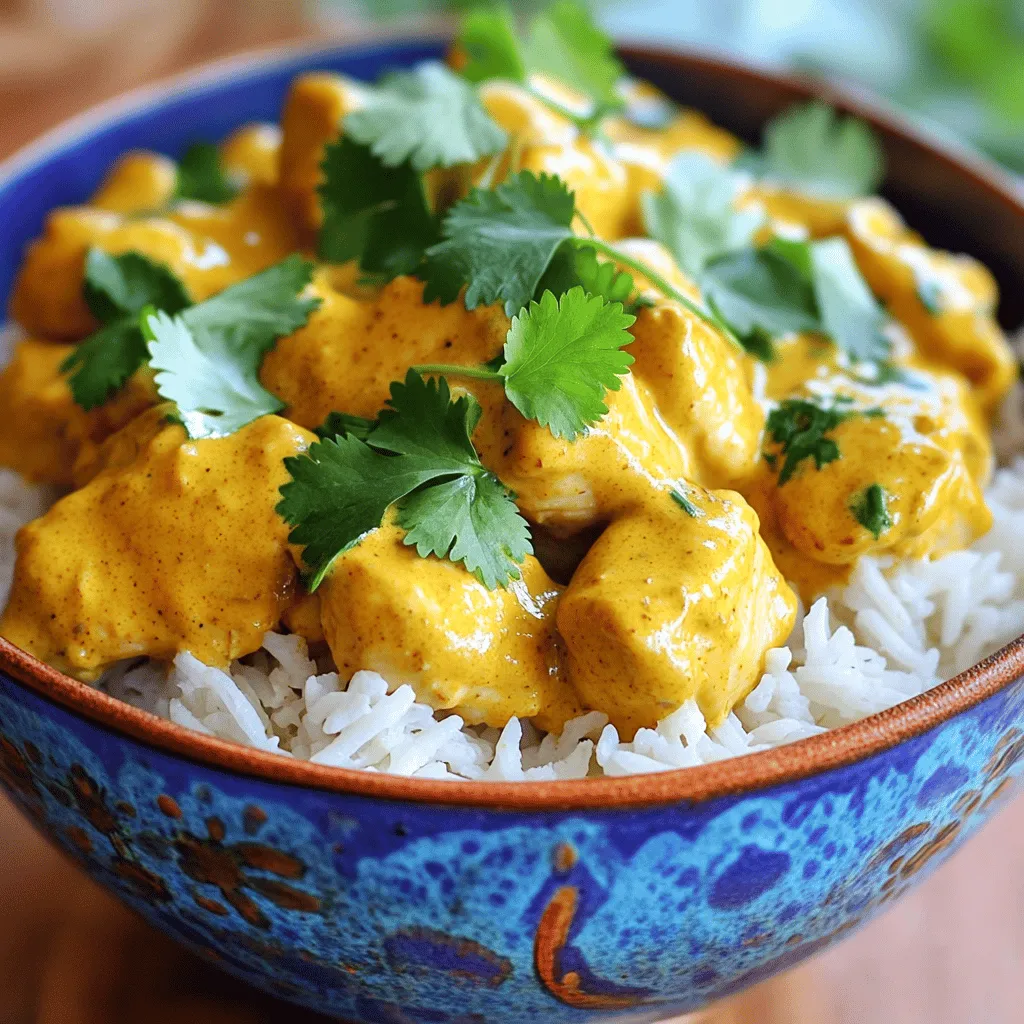 ![- 2 lbs boneless, skinless chicken thighs - 1 can (14 oz) coconut milk - 1/2 cup plain yogurt - Ginger, minced - Garlic, minced - Onion, finely chopped - Tomato paste - Curry powder - Garam masala - Turmeric - Cumin - Cayenne pepper To craft the best slow cooker butter chicken, you need key ingredients that create rich flavors. First, the chicken thighs are the star of the dish. They stay juicy and tender during cooking. Coconut milk adds a creamy texture. It also balances the spices well. The yogurt adds extra creaminess and tang. Next, we have aromatics. Minced ginger and garlic create a fresh, zesty base. Chopping the onion finely helps it blend into the sauce. This mix builds depth in flavor. We then add seasonings to bring the dish to life. Tomato paste gives you a nice richness. Curry powder and garam masala offer warmth and complex flavor. Turmeric adds a bright color and earthiness. Cumin brings a nutty touch, while cayenne pepper adds heat. Adjust these to your taste for the perfect balance. For a full guide on making this dish, refer to the Full Recipe. Each ingredient plays a role, making this meal flavorful and easy to prepare. You will love how these simple ingredients combine to create a delicious meal. Seasoning the Chicken Pieces Start with 2 lbs of boneless, skinless chicken thighs. Cut them into bite-sized pieces. In a large bowl, add salt, pepper, cumin, turmeric, and cayenne pepper. Toss the chicken well to coat it evenly. This step adds great flavor to each piece. Tips for Even Coating To ensure even coating, mix the spices first before adding them to the chicken. Use your hands or a spoon to rub the spices all over the chicken. Let it sit for a few minutes. This way, the flavors will soak in better. Best Practices for Onions, Garlic, and Ginger Next, focus on the aromatics. Chop one large onion finely. In a pan, add a tablespoon of oil over medium heat. Sauté the onion for about 5 minutes until it turns translucent. Then, add one tablespoon each of minced garlic and ginger. Cook for one more minute. This step builds a strong flavor base for the dish. Importance of Sautéing for Flavor Sautéing helps to release the natural oils and flavors in the onions, garlic, and ginger. This makes your butter chicken taste richer and more complex. Don’t rush this step; it’s key for a tasty dish. Transferring Ingredients to the Slow Cooker Now, transfer the sautéed onion mix to your slow cooker. Add the seasoned chicken, 2 tablespoons of tomato paste, 2 tablespoons of curry powder, 1 teaspoon of garam masala, and 1 can of coconut milk. Stir everything well to combine. Cooking Times: Low vs High Cover the slow cooker. Cook on low for 6-7 hours or on high for 3-4 hours. Choose low for a more tender chicken. Both methods will yield a mouthwatering dish. How to Adjust Spice Levels To control the spice, start with less cayenne pepper. You can always add more later. Taste as you go. If it’s too hot, add a bit of sugar or more coconut milk. This balances the heat well. Recommended Cooking Techniques for Better Texture Searing the chicken before adding it to the slow cooker is key. It gives a nice crust and deep flavor. If you skip this, the chicken may turn out soft and bland. Always sauté the onions, garlic, and ginger until fragrant. This step adds a rich base for your sauce. Adding Yogurt at the Right Time Add yogurt about 30 minutes before serving. This keeps the yogurt creamy and prevents curdling. Stir it gently into the sauce. Let it heat through but don’t let it boil. Alternatives to Yogurt for a Dairy-Free Version If you want a dairy-free option, try using coconut cream instead of yogurt. It gives a similar creaminess and flavor. You can also use cashew cream for a nutty twist. Best Accompaniments: Rice and Garnishes Serve this butter chicken over steamed basmati rice. The rice soaks up the sauce well. You can also add naan bread for dipping. Top with fresh cilantro for color and flavor. Presentation Tips for an Appealing Dish For a pretty presentation, use a shallow bowl. Add the rice first, then spoon the butter chicken over it. Sprinkle cilantro on top. This makes the dish pop and looks great for guests. For the full recipe, check [Full Recipe]. {{image_2}} You can switch up the protein in this butter chicken. Chicken thighs are juicy and tender. Chicken breasts are leaner but drier. If you want a lighter dish, breasts work well. Just remember to not overcook them. For a tasty vegetarian option, try tofu or cauliflower. Tofu absorbs flavors well, making it a great choice. Use firm tofu and cut it into cubes. Cauliflower gives a nice texture and taste too. Just roast it before adding to the slow cooker. The type of curry powder you use changes the flavor. Each brand has a unique taste. Try different blends to see what you like best. You can also mix your own for fun! Add vegetables like peas, spinach, or bell peppers for more nutrition. These veggies add color and taste to the dish. They make it heartier and more filling. Just toss them in during the last hour of cooking. While cilantro is classic, try other fresh herbs. Mint and parsley add a different taste. Chopped green onions give a nice crunch too. For extra texture, sprinkle nuts or seeds on top. Cashews or pumpkin seeds provide great crunch. These toppings make your meal look fancy and delicious. You can find the full recipe for creamy coconut butter chicken above! - How Long Will It Last in the Fridge? Your butter chicken will stay fresh in the fridge for about 3 to 4 days. Make sure it cools completely before you store it. This helps keep the flavors intact. - Best Storage Practices for Leftovers Use an airtight container to store your butter chicken. This prevents it from drying out. If you have a lot of leftovers, divide them into smaller portions. This makes reheating easier. - Can You Freeze Butter Chicken? Yes, you can freeze butter chicken. It freezes well and can last for up to 3 months. Just mak