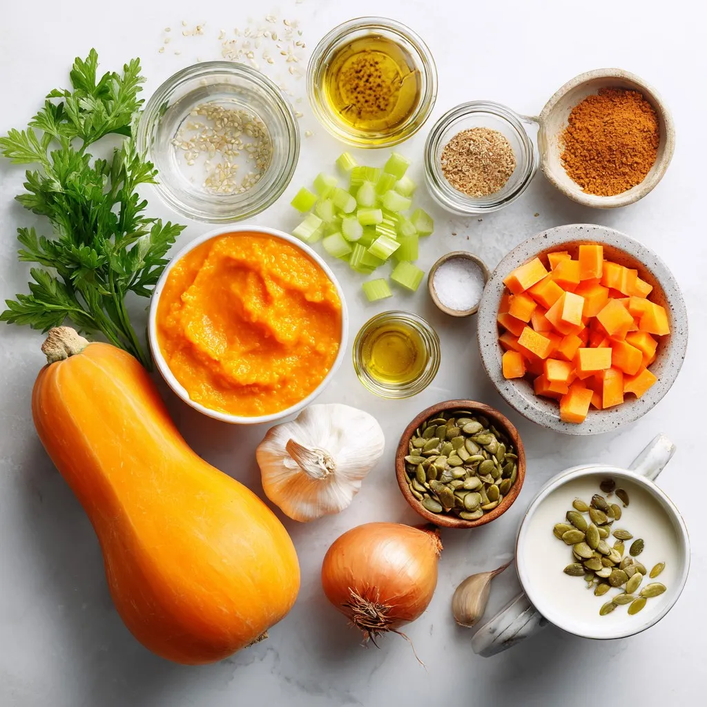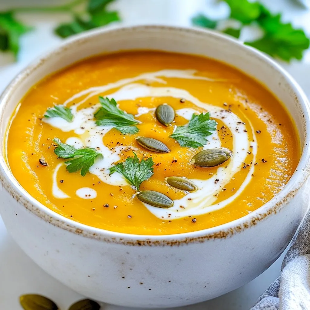 To make a warm bowl of butternut squash pumpkin soup, gather these ingredients: - 1 medium butternut squash, peeled and diced - 1 cup pumpkin puree (canned or fresh) - 1 medium onion, chopped - 2 cloves garlic, minced - 1 carrot, diced - 1 celery stalk, diced - 4 cups vegetable broth - 1 teaspoon ground cumin - 1 teaspoon ground cinnamon - 1/2 teaspoon nutmeg - Salt and pepper to taste - 2 tablespoons olive oil - 1 cup coconut milk (for creaminess) - Toasted pumpkin seeds and fresh parsley for garnish These ingredients create a rich and warming flavor. For more depth, consider these optional ingredients: - A pinch of cayenne pepper for heat - 1 apple, chopped for sweetness - Fresh herbs like thyme or sage These additions can enhance your soup and make it unique. You can switch out some ingredients if needed: - Use sweet potato instead of butternut squash - Swap coconut milk for cream or almond milk - Replace vegetable broth with chicken broth for more flavor These substitutions can cater to your personal taste or dietary needs. {{ingredient_image_1}} First, gather all your ingredients. You need: - 1 medium butternut squash, peeled and diced - 1 cup pumpkin puree - 1 medium onion, chopped - 2 cloves garlic, minced - 1 carrot, diced - 1 celery stalk, diced - 4 cups vegetable broth - 1 teaspoon ground cumin - 1 teaspoon ground cinnamon - 1/2 teaspoon nutmeg - Salt and pepper to taste - 2 tablespoons olive oil - 1 cup coconut milk - Toasted pumpkin seeds and fresh parsley for garnish Next, peel and dice the butternut squash. Dice the carrot and celery as well. Chop the onion and mince the garlic. When everything is ready, you can start cooking. In a large pot, heat the olive oil over medium heat. Add the chopped onion, garlic, carrot, and celery. Sauté for about 5-7 minutes. You want the veggies to soften and smell great. Now, add the diced butternut squash to the pot. Stir well and cook for another 5 minutes. This step helps to bring out the squash's natural sweetness. Sprinkle in the cumin, cinnamon, nutmeg, salt, and pepper. Mix everything well to coat the veggies in spices. This makes the soup flavorful. Pour in the vegetable broth and bring it to a boil. Once boiling, lower the heat and let it simmer for 20-25 minutes. Check if the squash is tender by poking it with a fork. Stir in the pumpkin puree and coconut milk. For a smooth soup, use an immersion blender to blend until creamy. If you don't have one, you can blend in batches in a regular blender. Taste the soup and adjust the seasoning if needed. If you want a thicker soup, simmer it uncovered for a few more minutes. Serve the soup hot. Garnish with toasted pumpkin seeds and fresh parsley. This adds a nice crunch and bright color. Enjoy your comforting bowl of butternut squash pumpkin soup! When making butternut squash pumpkin soup, some mistakes can ruin the dish. First, don't skip sautéing the onion, garlic, carrot, and celery. This step builds a tasty base. If you add these veggies raw, the soup will lack depth. Also, avoid overcooking the butternut squash. You want it tender, not mushy. Lastly, be careful with spices. Too much can overpower the soup’s natural sweetness. To make your soup even better, try adding a splash of lime juice. This brightens the flavors and adds a nice zing. You can also mix in fresh herbs like thyme or sage. They add warmth and complexity. If you like a bit of heat, a pinch of cayenne pepper works wonders. Don’t forget to taste as you go. Adjust salt and pepper to suit your palate. For a smooth and creamy soup, use an immersion blender. This tool makes blending easy and mess-free. If you don't have one, blend in small batches using a regular blender. Just be careful with hot liquids! If you want a chunkier texture, hold back some of the butternut squash. Stir it in after blending the rest of the soup. This adds a nice contrast and makes each spoonful interesting. Pro Tips Use Fresh Ingredients: Whenever possible, opt for fresh butternut squash and produce to enhance the flavor and nutrition of your soup. Adjust the Spices: Feel free to tweak the spice levels to your preference; adding a pinch of cayenne can give your soup a nice kick! Blend for Texture: For a smoother texture, blend the soup longer, or add more coconut milk for creaminess. Garnish Creatively: Experiment with different toppings like croutons, a drizzle of balsamic reduction, or even a dollop of yogurt for added flavor and presentation. {{image_2}} You can easily boost the protein in your Butternut Squash Pumpkin Soup. Here are some great ideas: - Chickpeas: Add one can of drained chickpeas for a hearty touch. - Lentils: Cook half a cup of lentils with the soup for extra fiber. - Chicken: Shredded rotisserie chicken adds flavor and protein. - Tofu: Use cubed, firm tofu for a plant-based option. These choices enhance nutrition and keep the soup filling. Try adding them during cooking for the best flavor. Spices can change the soup's taste. Here are some fun ideas: - Ginger: Add fresh ginger for a warm, zesty kick. - Curry powder: A teaspoon can give the soup a delightful twist. - Smoked paprika: This adds a smoky flavor that is rich and complex. - Herbs: Fresh thyme or sage can add a beautiful aroma. Feel free to mix and match spices to find your favorite blend! Garnishes can elevate your soup's look and taste. Consider these options: - Croutons: Crunchy croutons add texture and interest. - Yogurt: A dollop of yogurt or sour cream adds creaminess. - Chopped nuts: Almonds or walnuts can give a nice crunch. - Microgreens: These tiny greens add color and freshness. Experimenting with garnishes can make your dish more appealing and fun! To keep your butternut squash pumpkin soup fresh, store it in an airtight container. Let the soup cool first before sealing it. Place it in the fridge if you plan to eat it within a few days. It will stay good for about 3 to 5 days. Reheat your soup on the stove for the best results. Pour it into a pot a
