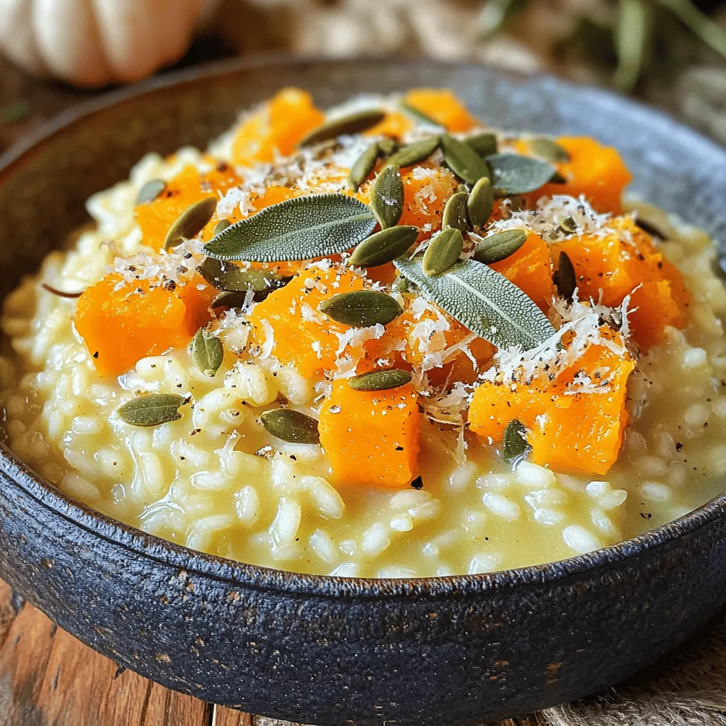 To make a delicious butternut squash sage risotto, you will need: - 1 cup Arborio rice - 2 cups butternut squash, diced - 4 cups vegetable broth - 1 small onion, finely chopped - 2 cloves garlic, minced - 1/2 cup grated Parmesan cheese (or nutritional yeast for a vegan option) - 2 tablespoons olive oil - 1 tablespoon fresh sage, chopped (or 1 teaspoon dried sage) - Salt and pepper to taste - 1 tablespoon butter (or plant-based butter for a vegan option) - Optional: pumpkin seeds for garnish When choosing butternut squash, look for ones that are firm and heavy for their size. The skin should be smooth and free of blemishes. A rich, orange color indicates ripeness. If it feels soft or has dark spots, it might not taste great. If you want a vegan version, replace the Parmesan cheese with nutritional yeast. For a dairy-free option, use plant-based butter. To make the dish gluten-free, ensure your broth is labeled gluten-free. This way, everyone can enjoy this creamy risotto! First, grab a medium saucepan. Pour in 4 cups of vegetable broth. Heat it over medium heat until it simmers. This keeps the broth warm for the risotto. Keeping it hot helps the rice cook evenly and absorb flavor. Next, take a large skillet and add 2 tablespoons of olive oil. Heat it over medium heat. Toss in 1 small chopped onion. Cook it for about 3-4 minutes until it turns soft and clear. Then, add 2 minced garlic cloves and 2 cups of diced butternut squash. Cook these for about 5 minutes. Stir often to prevent sticking. The squash should start to soften and smell great. Now, it's time for the rice. Add 1 cup of Arborio rice to the skillet. Stir it well, coating the rice with oil. Toast it for about 2 minutes until it looks slightly clear. Start adding the warm vegetable broth. Use one ladle at a time while stirring. Wait until most of the broth is absorbed before adding more. This process will take about 20-25 minutes. Keep stirring the rice as you go. It helps create that creamy texture we love. When the rice is creamy and just firm, remove the skillet from heat. Stir in 1/2 cup of grated Parmesan cheese. If you want a vegan option, use nutritional yeast instead. Add 1 tablespoon of butter or plant-based butter for richness. Mix until everything is melted and smooth. Taste the risotto and season with salt and pepper. You can also add more sage if you like. Serve it warm, and consider adding pumpkin seeds for a nice crunch. To get that creamy texture, use Arborio rice. This rice has more starch, which helps create creaminess. Stir often as you cook. This helps release the starch and makes the risotto smooth. Always add warm broth slowly. This gives the rice time to absorb the liquid. Keep an eye on the rice as it cooks. Stir frequently and check for doneness. The rice should be al dente, meaning it should have a little bite. If you cook it too long, it can turn mushy. Remove it from the heat as soon as it reaches your desired texture. You can add more flavor with herbs and spices. Try adding thyme or rosemary for a different taste. A sprinkle of nutmeg can add warmth, too. For a kick, consider a pinch of red pepper flakes. Taste as you go, and adjust the flavors to your liking. {{image_2}} You can switch butternut squash for other veggies. Seasonal options include pumpkin, sweet potatoes, or peas. Each brings its own taste and texture. For instance, pumpkin adds sweetness while peas add a fresh crunch. Just remember to adjust cooking times based on the vegetable you choose. To make risotto heartier, add a protein. Cooked chicken, shrimp, or even tofu works great. If using chicken or shrimp, add them in the last five minutes of cooking. For plant-based options, use chickpeas or lentils. This boosts flavor and makes the dish more filling. If you're looking for vegan options, swap out cheese and butter. Use nutritional yeast for a cheesy taste without dairy. Replace butter with plant-based butter or olive oil. The creamy texture will still shine through. This way, everyone can enjoy this comforting dish! To keep your butternut squash sage risotto fresh, store it in an airtight container. Let it cool down to room temperature. Then, place it in the fridge. It will last for about 3 to 5 days. If you have a lot left, portion it out. This makes for easy meals later. When you’re ready to eat the risotto, add a splash of broth or water. This helps bring back the creamy texture. Heat it in a saucepan over medium heat. Stir it often to avoid sticking. You can also use a microwave. Just cover it with a damp paper towel and heat in short bursts, stirring in between. If you want to freeze your risotto, use a freezer-safe container. Make sure to leave some space at the top, as it will expand. It can be frozen for up to 3 months. To thaw, move it to the fridge overnight. Reheat it gently on the stove or in the microwave. Add a bit of broth to restore creaminess. It takes about 35 minutes to cook butternut squash risotto. You first heat the broth, then sauté the veggies, and finally add the rice. Stirring is key during this time. The rice absorbs the broth slowly, creating a creamy texture. You can make risotto ahead of time, but it may not be as creamy when reheated. If you choose to do this, undercook the rice slightly. This way, it will not turn mushy when you reheat it. The best rice for risotto is Arborio rice. It has a high starch content, which helps create that creamy texture we all love. Other good options include Carnaroli or Vialone Nano, but Arborio is the most common. Yes, you can use chicken broth instead of vegetable broth. This will add extra flavor to your risotto. Just make sure to adjust the seasoning to fit your taste. You might need less salt if the broth is salty. Butternut squash risotto is a tasty dish that’s easy to make. We covered key ingredients and tips for selecting fresh squash. I shared how to prepare the broth, sauté veggies, and achieve that creamy texture. You can also switch up the recipe with 