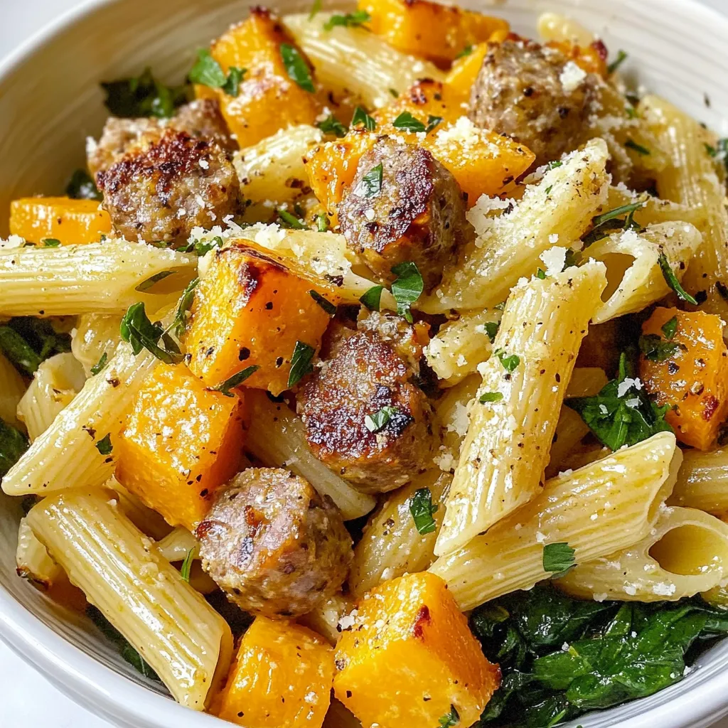 A delicious and hearty pasta dish featuring roasted butternut squash, Italian sausage, and fresh spinach.