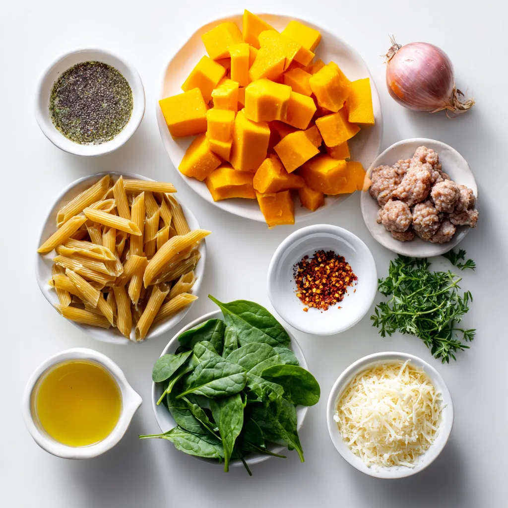 Gather these ingredients before starting. The pasta and sausage bring heartiness, while the squash adds sweetness. Fresh spinach gives a burst of color and nutrition. Keep garlic and onion handy; they boost the flavor. The red pepper flakes add a nice kick. Remember to have Parmesan cheese ready for a rich finish. You’ll also need olive oil, broth, salt, and pepper for cooking.