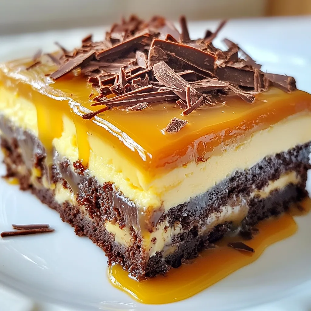 A decadent dessert combining rich brownie, creamy cheesecake, and luscious caramel sauce.