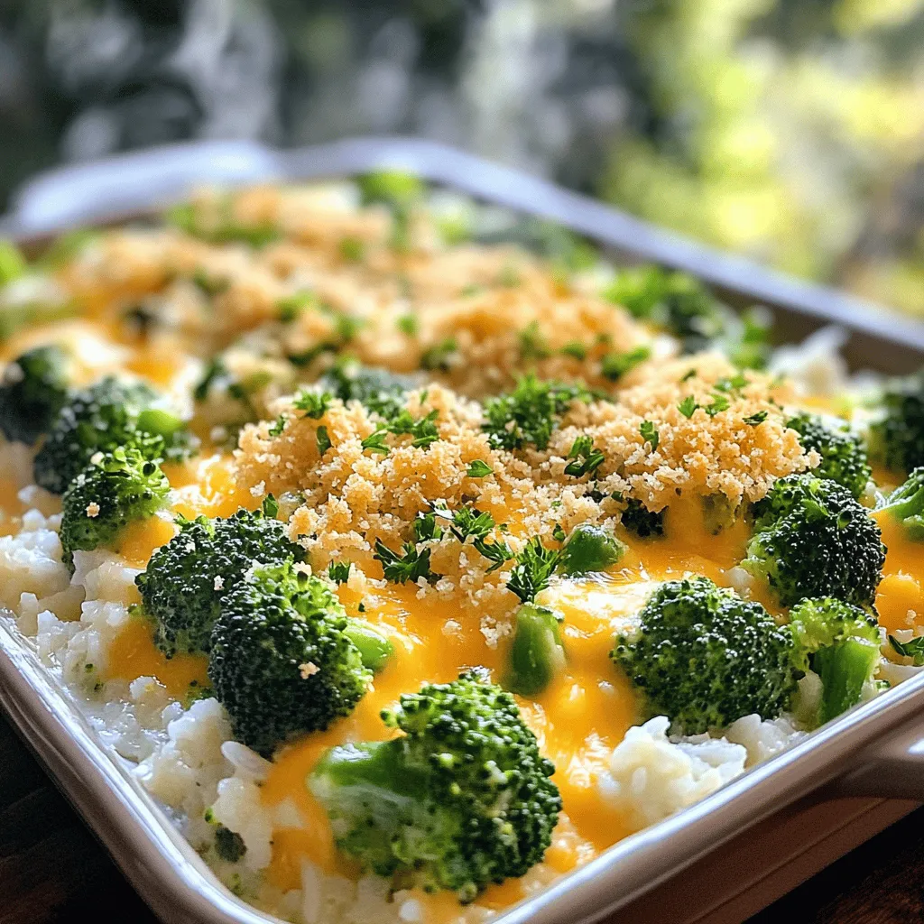 ![- 4 cups fresh broccoli florets - 2 cups cooked white rice - 1 cup sharp cheddar cheese, grated - 1 cup cream of mushroom soup (canned or homemade) - ½ cup milk - 1 small onion, finely chopped - 2 cloves garlic, minced - ½ teaspoon black pepper - ½ teaspoon salt - ½ teaspoon paprika - 1 cup panko bread crumbs - 2 tablespoons butter, melted These ingredients create a warm, cheesy hug in a dish. First, the fresh broccoli gives a nice crunch and bright color. The cooked rice makes it hearty and filling. Sharp cheddar cheese adds flavor and creaminess, while the cream of mushroom soup brings moisture. The milk helps smooth everything out, making it rich. Onions and garlic give a lovely aroma and depth. Simple spices like salt, pepper, and paprika enhance the dish without overpowering it. The panko bread crumbs add a crispy top, making each bite delightful. Finally, melted butter coats the crumbs for extra flavor. - Baking dish (9x13 inch) - Large mixing bowl - Pot for blanching broccoli - Measuring cups and spoons Using the right tools is key. A 9x13 inch baking dish holds all the goodness. A large mixing bowl gives you space to combine all the ingredients well. A pot for blanching the broccoli ensures it cooks quickly and evenly. Lastly, measuring cups and spoons help you get the amounts just right. For the full recipe, check out the detailed instructions that guide you through each step. - Preheat your oven to 350°F (175°C). - Blanch the broccoli florets in boiling water. Blanching helps keep the broccoli bright green and slightly tender. Place the florets in boiling water for about three minutes. Afterward, drain them and set them aside to cool. - Combine all ingredients in a mixing bowl. - Ensure everything is well mixed to ensure even distribution. In a large bowl, mix together the cooked rice, blanched broccoli, grated cheddar cheese, cream of mushroom soup, milk, chopped onion, minced garlic, black pepper, salt, and paprika. Stir until everything is well coated and evenly mixed. - Transfer mixture into a greased baking dish. - Top with panko and bake for 25-30 minutes. Pour the mixture into a greased 9x13 inch baking dish. Spread it out evenly. In a separate bowl, mix panko bread crumbs with melted butter. Sprinkle this on top of the casserole. Bake it in the oven for 25 to 30 minutes. Look for a golden brown top that bubbles slightly. To make the panko topping crunchy, mix it with melted butter. This helps it brown nicely. Spread the panko evenly over the top. It should cover the whole dish for great texture. When you bake it, the topping will get golden and crisp. When choosing broccoli, look for bright green florets. They should be firm, not soft or yellow. Fresh broccoli has a nice, strong smell. You want to avoid any limp or wilted stems. Always check for small dark spots, as they can signal age. If you want to switch the rice, try quinoa or cauliflower rice. Both options add unique flavors and textures. Quinoa has a nutty taste, while cauliflower rice is light and fluffy. They also lower carbs, which can be a bonus. For a dairy-free version, use plant-based cheese. You can also swap cream of mushroom soup for a homemade version made with nuts or coconut milk. This keeps the creaminess without dairy. You can add proteins for extra heartiness. Chicken or turkey work well. For a vegetarian option, add tofu or chickpeas. They soak up flavor and make the dish filling. Trying different cheeses can change the taste, too. Mozzarella gives a stretchy, gooey texture. Gouda adds a rich, smoky flavor. Feel free to mix and match your favorites! {{image_2}} To serve cheesy broccoli casserole, use a large spoon to scoop out portions. Place each serving on a plate. This dish is best served warm and straight from the baking dish. For a beautiful touch, sprinkle fresh parsley on top. The green color adds brightness and flavor. You can also use chives or thyme for added flair. Arrange the plates neatly for gatherings, making each serving look inviting. Cheesy broccoli casserole pairs well with a simple salad. A fresh green salad with a light vinaigrette works great. You can also serve it with crusty bread to soak up the rich flavors. For drinks, white wine like Sauvignon Blanc is a nice choice. If you prefer non-alcoholic options, lemonade or sparkling water complements the dish well. These sides and drinks bring out the best in your casserole. For the complete recipe, check out the [Full Recipe]. To store leftovers in the fridge, place the casserole in an airtight container. Make sure the container is sealed well to keep out air. Leftovers stay fresh for about 3 to 5 days. To enjoy the best taste, eat them within this time frame. To freeze the casserole, let it cool completely first. Then, wrap it tightly in plastic wrap and aluminum foil. This helps prevent freezer burn. You can keep it in the freezer for up to 3 months. When you're ready to eat, thaw the casserole in the fridge overnight. For reheating, place it in the oven at 350°F (175°C) until hot throughout. This method keeps the texture nice and creamy. Enjoy your cheesy broccoli casserole later with that same great taste! For the full recipe, check out the details above. Making cheesy broccoli casserole takes about 45 minutes in total. You will spend 15 minutes prepping and about 30 minutes cooking. Yes, you can make this casserole ahead of time. Prepare it up to the baking step. Cover it tightly and store it in the fridge for up to two days. When you are ready to bake, just pop it in the oven. It may need a few extra minutes to cook through. This casserole pairs well with many side dishes. Here are a few ideas: - A crisp green salad - Roasted chicken or turkey - Garlic bread - Steamed carrots or green beans For drinks, try a light white wine or a refreshing iced tea. You can now create a delicious cheesy broccoli casserole with ease. We covered the key ingredients, tools, and steps for preparation and baking. Don’t forget the