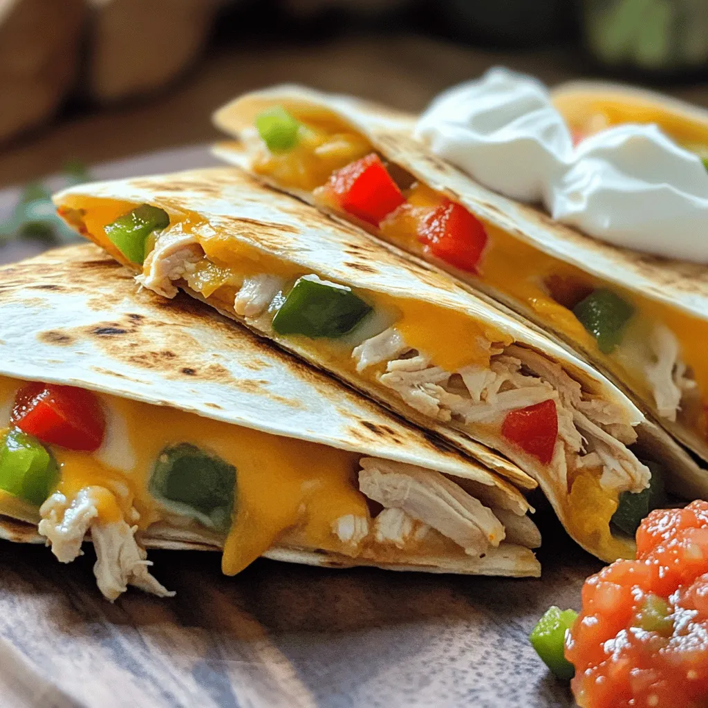 - 2 cups cooked chicken, shredded - 1 cup shredded mozzarella cheese - 1 cup shredded cheddar cheese - 1/2 cup cream cheese, softened - 1/2 cup bell peppers, diced (mix of red and green) - 1/2 cup red onion, diced For cheesy chicken quesadillas, the main ingredients are key. The shredded chicken gives it protein. Mozzarella and cheddar cheese melt beautifully and add rich flavor. Cream cheese makes the filling creamy and smooth. Adding bell peppers and red onion gives crunch and fresh taste. - 2 tablespoons taco seasoning - Optional spices for added flavor For this recipe, taco seasoning is a must. It adds a kick of spice and depth. You can also add optional spices like cumin or paprika for extra flavor. A pinch of garlic powder can also enhance the taste. Experiment to find your favorite mix! - 4 large flour tortillas When choosing tortillas, I recommend using large flour tortillas. They are soft and easy to fold. They also hold the filling well. You can use corn tortillas if you prefer a gluten-free option, but they may crack more easily. Brands like Mission or Tortilla Land work well for flour tortillas. To start, mix your filling well. In a bowl, combine: - 2 cups cooked chicken, shredded - 1 cup shredded mozzarella cheese - 1 cup shredded cheddar cheese - 1/2 cup cream cheese, softened - 1/2 cup bell peppers, diced (mix of red and green) - 1/2 cup red onion, diced - 2 tablespoons taco seasoning The right mix makes a big difference. Ensure even ratios of chicken to cheese. This balance gives the quesadillas great flavor and texture. Now, heat your skillet. Set it to medium heat. Add 1 tablespoon of olive oil. Cooking too hot can burn the tortillas. You want a nice golden brown. Place one tortilla in the skillet. Spread half of the chicken and cheese mixture over one half. Fold the tortilla in half. Cook for 3-4 minutes until the bottom is crispy. Flip it carefully. Cook the other side for another 3-4 minutes. You want the cheese melted and the tortilla crunchy. Repeat with the rest of the tortillas and filling. Keep adding olive oil as needed to avoid sticking. For sides, consider sour cream and salsa. These add zest and freshness. You can also serve with a simple salad or guacamole for a more filling meal. For plating, slice the quesadillas into wedges. Arrange them on a colorful plate. Add a dollop of sour cream and a small bowl of salsa. This makes your dish look good and inviting. For the full recipe, check out the complete guide! To make your cheesy chicken quesadillas even better, add fun ingredients. Try adding diced jalapeños for a spicy kick. You can also toss in fresh spinach for a pop of color and nutrition. For dips, sour cream and salsa work great. You might also enjoy guacamole or a zesty ranch dip. A crispy quesadilla is a must. To achieve this, use enough oil in the skillet. Heat it well before adding the tortilla. Cook each side for about 3-4 minutes. This helps create that golden brown crust. Avoid soggy tortillas by not overfilling them. A thin layer of filling keeps them crisp. If you plan to serve many people, this recipe scales easily. Just double or triple the ingredients. Use multiple skillets to speed up cooking. To keep quesadillas warm, place them in a low oven. Cover them with foil to keep the heat in. Enjoy your gathering with tasty food everyone will love! For the full recipe, check out the details shared earlier. {{image_2}} You can switch up the protein in your quesadillas. Try using beef, shrimp, or even tofu for a vegetarian option. If you go with beef, use ground beef or steak strips. For shrimp, cook them until pink and tender. Adjust your cooking times so all proteins are cooked well. Each protein brings its own flavor and texture. While mozzarella and cheddar are classic choices, don’t stop there! You can explore other cheese types like pepper jack for a spicy kick or gouda for a rich, smoky flavor. If you prefer dairy-free options, look for vegan cheese that melts well. These can give your quesadillas a unique twist. Want to spice things up? Consider adding international flavors to your quesadillas. BBQ chicken with a tangy sauce can be a hit. You can also try curry chicken for a warm, fragrant taste. Each flavor brings a new experience. Feel free to mix and match, and create your own global quesadilla masterpiece. For more ideas, check out the Full Recipe. To store leftover quesadillas, let them cool first. Place them in an airtight container. This keeps them fresh and tasty. You can stack them if needed. Use parchment paper between layers to prevent sticking. I recommend using glass or plastic containers with tight lids. Freezing quesadillas is easy for quick meals. Wrap each quesadilla in plastic wrap. Then, place them in a freezer-safe bag. Press out as much air as you can before sealing. For reheating, you can bake them in the oven. Preheat your oven to 375°F (190°C). Bake for about 15-20 minutes. You can also use a skillet on low heat for about 5-7 minutes. Quesadillas stay fresh in the fridge for about 3-4 days. If frozen, they last up to 2-3 months. Look for signs of spoilage, like a strange smell or mold. If they seem dry or tough, it's best to toss them out. Keeping track of freshness helps you enjoy every bite! For the full recipe, check out the earlier section. To make quesadillas crispy, use a hot skillet. Heat it over medium-high heat before adding oil. Olive oil works well for flavor and crisping. Ensure you don’t overcrowd the pan. Cook one or two quesadillas at a time. Flip them only when the bottom is golden brown. This helps to get that perfect crunch. Yes, you can use different tortillas. Flour tortillas are soft and easy to fold. They give a nice chewiness. Corn tortillas are crispy and have a stronger flavor. They are a good choice if you want a gluten-free option. However, corn tortillas can break more easily. Choose based on your taste and texture preference. You can serve quesadillas with many tasty sides. Sour cr