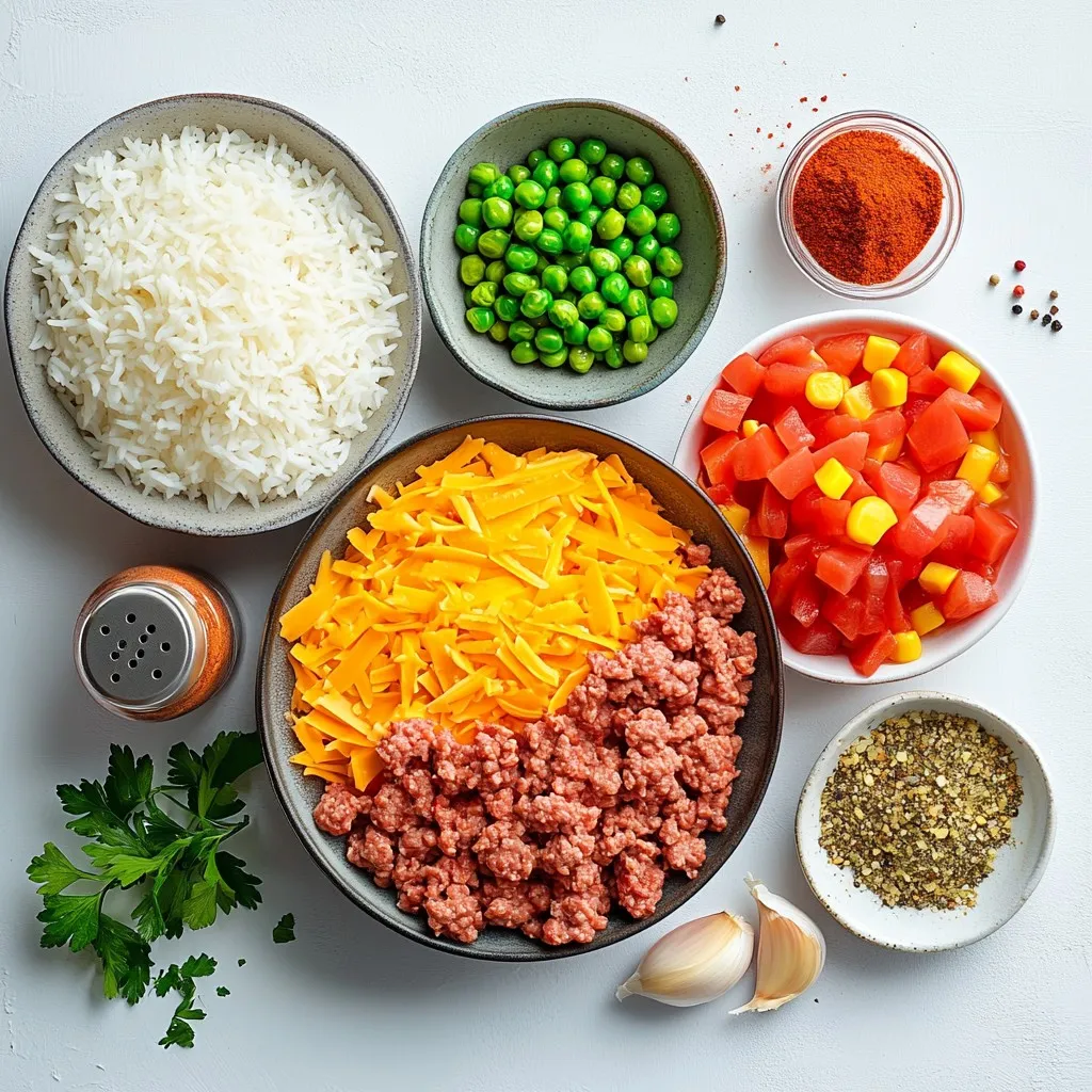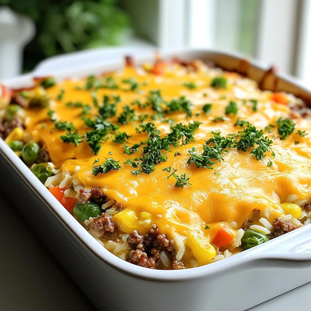 - 1 pound ground beef - 1 cup long-grain white rice - 2 cups beef broth - 1 can (14.5 oz) diced tomatoes, drained These main ingredients form the heart of the dish. The ground beef gives it a rich flavor, while the rice provides texture. The beef broth adds moisture, and the diced tomatoes bring a hint of sweetness. - 1 medium onion, diced - 2 cloves garlic, minced - 1 cup frozen mixed vegetables (peas, carrots, corn) - 1 teaspoon paprika - 1 teaspoon Italian seasoning - Salt and pepper to taste Adding these vegetables and seasonings brightens the casserole. The onion and garlic create a savory base, while the frozen vegetables add color and nutrients. Paprika and Italian seasoning enhance the overall taste, giving it depth. - 2 cups shredded cheddar cheese - Fresh parsley, chopped (for garnish) Cheddar cheese is the star here! It melts beautifully on top, making the dish gooey and delightful. Fresh parsley adds a pop of color and freshness, making the casserole more appealing to the eye. {{ingredient_image_1}} 1. First, preheat your oven to 350°F (175°C). This step gets your oven ready for baking. 2. Next, grab a large skillet. Heat it over medium heat. This is where the magic begins. 1. Add 1 pound of ground beef to the skillet. Brown it until fully cooked. Drain any excess fat. 2. Now, add 1 medium diced onion and 2 cloves of minced garlic. Sauté them until the onion turns translucent, about 5 minutes. 3. Stir in 1 cup of long-grain white rice. Cook for 2 minutes to lightly toast the rice. 4. Pour in 2 cups of beef broth, 1 can of drained diced tomatoes, and 1 cup of frozen mixed vegetables. Season with 1 teaspoon of paprika, 1 teaspoon of Italian seasoning, and salt and pepper to taste. 5. Mix everything well and bring it to a simmer. Cover the skillet and cook for about 15 minutes. The rice should be tender and absorb most of the liquid. 1. Remove the skillet from heat. Stir in 1.5 cups of shredded cheddar cheese until it melts and blends in. 2. Transfer the mixture to a greased 9x13 inch baking dish. Sprinkle the remaining 0.5 cup of cheddar cheese on top. 3. Bake in the preheated oven for 20-25 minutes. Look for bubbly and golden cheese on top. Enjoy this cheesy delight that warms the heart! To enhance the flavor of your Cheesy Hamburger Rice Casserole, consider these tips: - Seasoning Suggestions: Use salt and pepper to taste. Add a pinch of cayenne for some heat. You can also mix in some garlic powder for extra flavor. - Cheese Variations: While cheddar cheese is the star, you can try mozzarella for a milder taste. Pepper jack adds a spicy kick, while gouda gives a smoky twist. You can cook this casserole in different ways: - Skillet vs. Oven Cooking: The skillet method lets you watch the rice cook. It also allows for easy stirring. The oven method gives a nice, bubbly top. Both ways yield a delicious dish. - Alternative Cooking Methods: If you prefer slow cooking, combine all ingredients in a slow cooker. Cook on low for about 4 hours. This method creates tender rice and deep flavors. Pair your casserole with these ideas: - Complementary Side Dishes: Serve with a fresh green salad or garlic bread. Roasted vegetables also make a great side. - Garnishing Ideas: Top with chopped parsley for color. You can also sprinkle some extra cheese before serving for added flavor. Pro Tips Use Lean Ground Beef: Opt for lean ground beef to reduce excess grease in your casserole, ensuring a healthier dish without compromising flavor. Customize Your Vegetables: Feel free to swap in your favorite vegetables or whatever you have on hand, such as bell peppers or broccoli, to add more color and nutrition. Cheese Variations: Experiment with different types of cheese, like pepper jack for a spicy kick or mozzarella for a milder flavor, to personalize your casserole. Make Ahead: Prepare the casserole in advance and store it in the refrigerator overnight. Just pop it in the oven when you're ready to serve! {{image_2}} You can switch out ground beef for ground turkey or chicken. Both options are leaner and still tasty. If you like rice, try different types like brown rice or jasmine rice. Each type gives a unique texture and flavor to the dish. If you want a vegetarian version, use beans or lentils instead of meat. These add protein and fiber. You can also mix in extra vegetables like bell peppers, zucchini, or spinach. This makes the casserole colorful and packed with nutrients. For a spicy kick, add diced jalapeños to the mix. The heat balances well with the cheesy goodness. You can also explore different herbs. Fresh basil, cilantro, or thyme can bring in a bright taste that lifts the dish. Store your leftovers in a tight container. This keeps them fresh longer. You can enjoy the casserole for up to four days in the fridge. Just make sure it cools down before sealing it up. For freezing, use an airtight container or freezer bags. This helps avoid freezer burn. You can freeze the casserole for up to three months. When you're ready to eat, thaw it overnight in the fridge. Reheat it in the oven at 350°F (175°C) for about 30 minutes. Make sure it’s hot all the way through before serving. You can make this casserole ahead of time. Prepare it up to the baking step, then cover and chill. This is great for busy nights. For easy meals, portion the casserole into single servings. This way, you can grab a quick meal anytime. Just reheat as needed, and enjoy a comforting dish! Yes, you can make Cheesy Hamburger Rice Casserole ahead of time. This dish stores well in the fridge. To store, let it cool completely. Then, cover it tightly with plastic wrap or foil. It can last in the fridge for up to three days. When you're ready to eat, you can reheat it. Preheat your oven to 350°F (175°C). Place the casserole in the oven for about 20 minutes. If it feels dry, add a splash of broth. You can also microwave individual servings for a quick meal. To spice up your casserole, consider adding some heat. You can mix