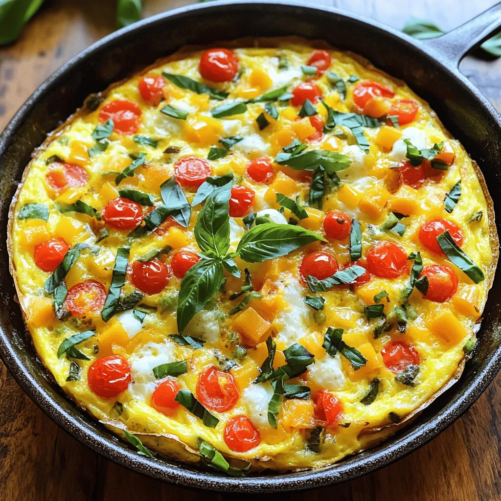 ![To make a tasty cheesy veggie frittata, you need some key ingredients. Start with: - 6 large eggs - 1 cup spinach, chopped - 1 cup bell peppers (mixed colors), diced - 1/2 cup onion, finely chopped - 1/2 cup cherry tomatoes, halved - 1 cup shredded cheese (cheddar and mozzarella blend) - 1/4 cup milk - 2 tablespoons olive oil These ingredients bring great flavor and color to your dish. The eggs and milk create a rich base. The fresh veggies add texture and nutrients. The cheese gives it that delicious gooeyness. Don’t forget to add some seasoning. Here’s what you need: - Salt and pepper to taste - Olive oil for cooking - Fresh herbs (like basil or parsley) for garnish Salt and pepper enhance the taste of your frittata. Olive oil helps cook the veggies nicely. Fresh herbs not only look pretty but also add a burst of flavor. For the full recipe, check out the recipe card! To start, you need to prep your oven and skillet. Preheat your oven to 375°F (190°C). This helps the frittata cook evenly. Use an oven-safe skillet for the best results. A cast-iron skillet works great for this recipe. Next, whisk the egg mixture. In a big mixing bowl, crack six large eggs. Add 1/4 cup of milk. Whisk until the mixture is smooth. Season it with salt and pepper to taste. This is where the flavor starts! Now, it’s time to sauté the vegetables. Heat 2 tablespoons of olive oil in your skillet over medium heat. Add 1/2 cup of finely chopped onion and 1 cup of diced bell peppers. Sauté them for about 3-4 minutes, until they soften. Next, combine the veggies with the egg mixture. Add 1 cup of chopped spinach and 1/2 cup of halved cherry tomatoes to the skillet. Cook for another 2-3 minutes. The spinach should wilt, and the tomatoes should soften a bit. Spread the veggies evenly across the skillet. Pour the egg mixture over the veggies. Make sure it covers everything well. Now, we bake the frittata. Sprinkle 1 cup of shredded cheese on top of the egg-vegetable mix. Cook it on the stovetop for about 3-4 minutes. You want the edges to start setting. Then, transfer the skillet to the preheated oven. Bake for 15-20 minutes. The frittata should puff up, and a toothpick should come out clean when inserted in the center. Once it's done, remove it from the oven and let it cool for a few minutes. Cut it into wedges and garnish with fresh herbs like basil or parsley. This adds a nice touch! Enjoy your cheesy veggie frittata as a tasty meal or snack. For the detailed recipe, check the Full Recipe section. To make your frittata fluffy, use fresh eggs. They help create a light texture. Whisk the eggs well with milk. This adds air and makes it rise. Avoid overcooking the frittata. If you cook it too long, it gets rubbery. Cook on medium heat and watch closely. Remove it from the oven when a toothpick comes out clean. Use fresh herbs like basil or parsley for bright flavor. They add a nice touch to your frittata. You can also try spices like paprika or garlic powder. These spices add depth and warmth. For cheese, mix it up! Use a blend of cheddar and mozzarella for creaminess. You can also try feta for a tangy twist. Adjust the cheese to match your taste. Use a good oven-safe skillet. Cast iron or non-stick works well. These skillets help cook evenly and make serving easy. Make sure your baking dish is oven-safe. This is key for a well-cooked frittata. If you don’t have an oven-safe skillet, transfer the mixture to a baking dish before baking. {{image_2}} You can easily swap ingredients in your frittata. If you want a twist, try using zucchini or mushrooms instead of bell peppers. Both add great texture and taste. You can also mix in other veggies, like broccoli or kale, depending on what you have at home. For cheese, consider using feta or goat cheese if you want something different. These cheeses offer a tangy taste that pairs well with the veggies. Feel free to mix different cheeses to find your favorite blend. Making your frittata vegan is simple! Replace the eggs with a mixture of silken tofu and a bit of turmeric for color. You can still add your favorite veggies and seasonings. For a vegetarian option, stick to the original recipe, but skip the cheese or use a dairy-free version. If you're watching carbs, you can skip the milk and use fewer starchy veggies. Focus on spinach, bell peppers, and tomatoes. This keeps your frittata light and healthy. Pair your frittata with fresh fruit or a light salad for a complete meal. A side of mixed greens adds nice crunch and flavor. You can also enjoy it with whole-grain toast for some extra fiber. If you’re busy during the week, this frittata is a great meal prep option. Cut it into wedges and store them in the fridge. You can quickly reheat a slice for breakfast or lunch. For more ideas, check the Full Recipe. To store leftovers, place the frittata in an airtight container. This keeps it fresh longer. You can keep it in the fridge for up to four days. Make sure to let it cool down first before sealing it. For reheating, you can use the microwave or the oven. If using a microwave, heat it in short bursts. Start with 30 seconds, then check if it's warm. For the oven, preheat it to 350°F (175°C). Place the frittata in an oven-safe dish for about 10-15 minutes. This gives it a nice texture. For meal prep, slice the frittata into portions. Store each piece separately for easy access. This way, you can enjoy it throughout the week. You can freeze portions of the frittata, too. Wrap each slice tightly in plastic wrap, then place them in a freezer bag. It can last up to three months in the freezer. When you’re ready to eat, thaw it in the fridge overnight. For cooking, reheat it in the oven at 350°F (175°C) until it’s hot all the way through. Enjoy your cheesy veggie frittata anytime! For the full recipe, check out the [Full Recipe]. A frittata can last about 3 to 4 days in the fridge. To store it, place it in an airtight container. This keeps it fresh and safe to eat