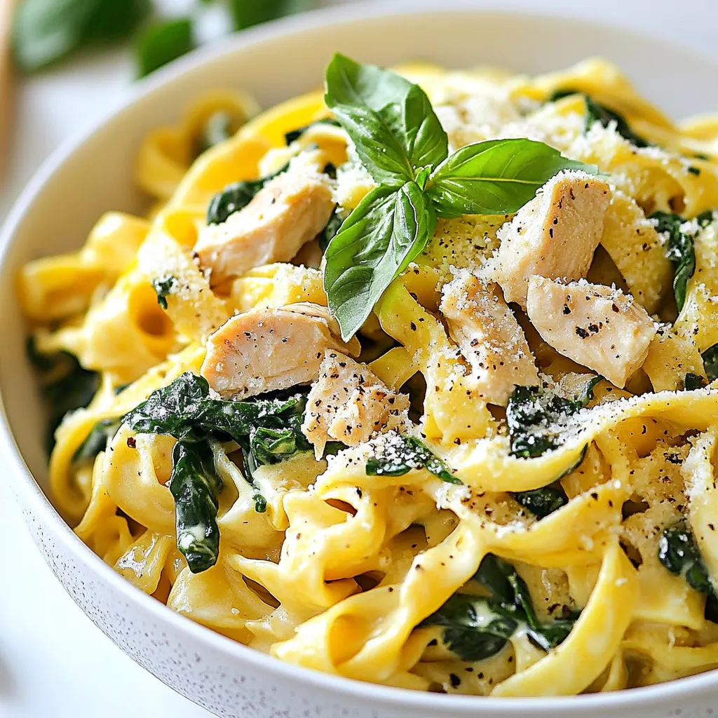 A delicious and creamy pasta dish with chicken and spinach, perfect for a comforting meal.