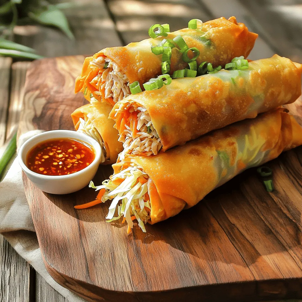 . In a large bowl, combine the following ingredients: - 1 cup cooked chicken breast, shredded - 1 cup shredded cabbage - 1 cup carrots, julienned - 1/2 cup bean sprouts - 2 green onions, finely chopped - 1 tablespoon soy sauce - 1 tablespoon sesame oil - 1 teaspoon ginger, grated - 1 teaspoon garlic, minced Mix these well until everything is coated and seasoned. You can adjust the salt and pepper to your taste. A good mix ensures each spring roll is packed with flavor. To soften the rice paper, fill a shallow dish with warm water. Submerge one wrapper for about 10-15 seconds. You want it soft but not too mushy. After soaking, lay it flat on a clean surface. Be gentle when handling; the wrappers can tear easily if you rush. Place about 2 tablespoons of the filling in the center of the wrapper. Fold the sides over the filling. Then, roll it tightly from the bottom up. This keeps the filling snug inside. Make sure the edges seal well to prevent any leaks during frying. Repeat this with the remaining wrappers and filling. Heat vegetable oil in a deep skillet or fryer over medium-high heat. I recommend about 350°F (175°C) for the best results. Fry the rolls in batches, making sure not to crowd the pan. Cook for about 3-4 minutes, or until they turn golden brown and crispy. Remove them and let them drain on paper towels. This helps keep them crunchy. Enjoy your crispy chicken spring rolls warm with a sweet chili sauce or soy sauce for dipping. To get that perfect crunch, you must pay attention to oil temperature. Heat your oil to about 350°F (175°C). This hot oil cooks the rolls fast, making them crispy. If the oil is too cool, the rolls soak up oil and become soggy. Always test a small piece first to check the heat. To avoid sogginess, do not overfill your rolls. If you add too much filling, the wrappers can break. This will let oil seep in during frying. Stick to about two tablespoons of filling per roll. This keeps the rolls light and crispy. One common mistake is overfilling the rolls. It might seem tempting, but it leads to messy spring rolls. Use just enough filling so you can fold and seal them easily. Another mistake is not sealing properly. Make sure to press the edges of the wrappers together tightly. If they are not sealed well, they can open up in the hot oil. Serve your crispy spring rolls with a side of sweet chili sauce or soy sauce for dipping. These sauces add a burst of flavor that pairs well with the rolls. The ideal serving temperature is warm, right after frying. This way, you enjoy the crunch and flavor at their best. You can also garnish with fresh herbs for added color and taste. {{image_2}} You can swap chicken for shrimp or tofu in your spring rolls. Shrimp adds a sweet flavor and a nice bite. Simply cook and chop the shrimp before mixing it with your veggies. Tofu is a great choice for a plant-based option. Use firm tofu, press it to remove water, then cube and sauté it. Both choices give you tasty and healthy rolls. For a meat-free version, focus on fresh veggies. Use these ingredients: - 1 cup shredded cabbage - 1 cup carrots, julienned - 1/2 cup bean sprouts - 2 green onions, finely chopped - 1 tablespoon soy sauce - 1 tablespoon sesame oil - 1 teaspoon ginger, grated - 1 teaspoon garlic, minced This mix is colorful and flavorful. You can add mushrooms or bell peppers for extra crunch. Just ensure to season well with soy sauce for a savory kick. Spice things up by adding different herbs or spices. Try fresh cilantro or mint for a refreshing twist. You can also mix in some chili flakes for heat. If you want a sweeter taste, add a dash of hoisin sauce. Mixing in different vegetables, like bell peppers or zucchini, keeps your rolls exciting every time you make them. For the full recipe, check out the Crispy Chicken Spring Rolls section. To keep your chicken spring rolls fresh, store them in the fridge. Wrap each roll in plastic wrap or place them in an airtight container. This keeps them from drying out. Make sure to eat leftovers within three days for the best taste. To reheat your spring rolls, use an oven or an air fryer. Preheat the oven to 375°F (190°C). Place the rolls on a baking sheet and heat for about 10-15 minutes. This method keeps them crispy. An air fryer works well too. Set it to 350°F (175°C) and cook for 5-7 minutes. Avoid microwaving, as it makes them soggy. You can freeze both uncooked and cooked spring rolls for later use. For uncooked rolls, lay them on a baking sheet and freeze until solid. Then, transfer them to a freezer bag. To freeze cooked rolls, let them cool completely first. Wrap each roll in plastic wrap, then place them in a bag. They last for about three months in the freezer. When ready to eat, you can fry them straight from the freezer. Just add a few extra minutes to the cooking time. For more details, check the Full Recipe. You can make chicken spring rolls by baking them. Preheat your oven to 400°F (200°C). After rolling your spring rolls, place them on a baking sheet. Brush them lightly with oil. Bake for about 20 minutes, flipping halfway through. This method gives you a crispy roll without frying. For chicken spring rolls, I recommend sweet chili sauce or soy sauce. These sauces add flavor and a nice kick. You could also try hoisin sauce or peanut sauce for a different twist. Each sauce brings a unique taste to your rolls. Yes, you can use other wrappers. Try using egg roll wrappers or wonton wrappers. They will give your rolls a different texture and flavor. However, rice paper offers a light and chewy bite that many love. Experiment to find your favorite! You can store chicken spring rolls in the fridge for up to three days. Keep them in an airtight container to maintain freshness. Make sure to eat them quickly for the best taste and texture. If they start to get soggy, it’s time to toss them. Spring rolls have roots in Chinese cuisine. They date back to the 4th century. Originally, they celebrated the spring ha