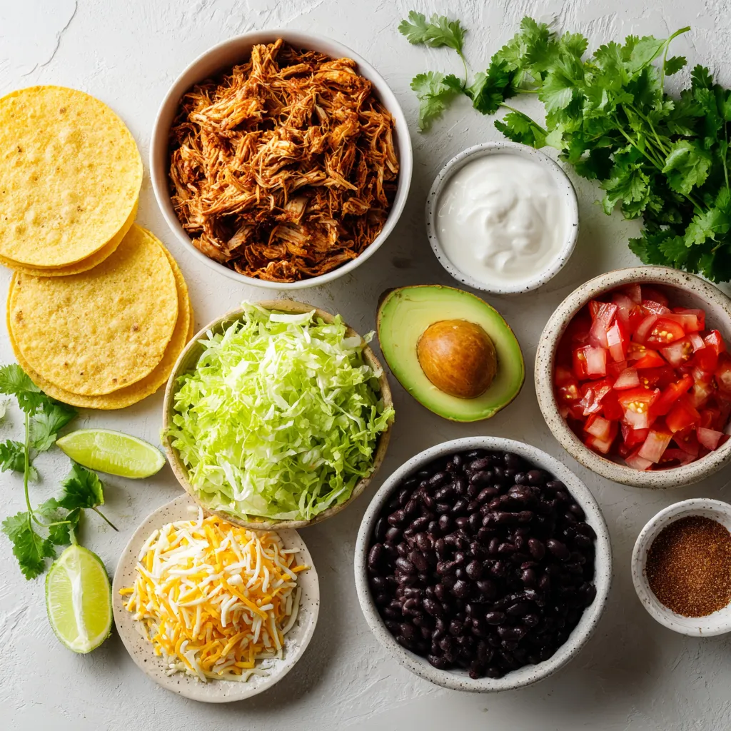 These ingredients come together to create a colorful and delicious meal. The cooked shredded chicken brings protein, while the beans add fiber and flavor. The tostada shells provide that perfect crunch.