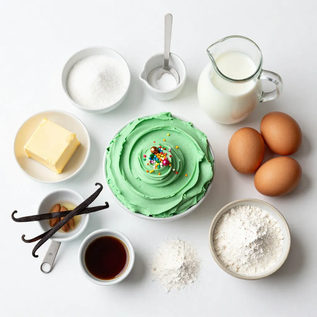 To make this Christmas Tree Sheet Cake, gather these ingredients first. I find it helps to lay everything out. The main cake uses simple items you likely already have. Flour, sugar, butter, and eggs create a soft base. The milk adds moisture, while baking powder helps it rise. Extracts bring rich flavor.