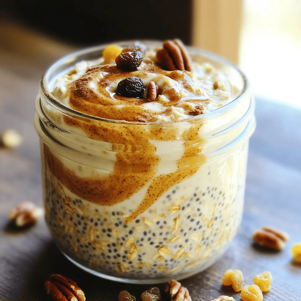 To make cinnamon roll overnight oats, gather these items: - 1 cup rolled oats - 1 cup almond milk (or any non-dairy milk) - 1 tablespoon chia seeds - 1 tablespoon maple syrup - 1 teaspoon vanilla extract - 1 teaspoon ground cinnamon - 1/4 cup Greek yogurt (or non-dairy yogurt) - 2 tablespoons raisins or chopped pecans (optional) - Extra cinnamon and maple syrup for topping Each ingredient adds something special. Here’s a quick look: - Rolled oats provide fiber and energy. - Almond milk is low in calories and lactose-free. - Chia seeds add omega-3 fats and protein. - Maple syrup gives natural sweetness. - Vanilla extract enhances flavor. - Ground cinnamon offers antioxidants and warmth. - Greek yogurt adds protein and creaminess. - Raisins or pecans contribute extra nutrients and texture. This mix not only tastes great but also fuels your day. If you need alternatives, consider these options: - Swap rolled oats for quick oats, but they may soften faster. - Use coconut milk or soy milk instead of almond milk for a different flavor. - Flax seeds can replace chia seeds for similar health benefits. - Honey or agave syrup can stand in for maple syrup. - If you want less dairy, go with coconut yogurt instead of Greek yogurt. - For crunch, try walnuts or sunflower seeds instead of pecans. These swaps let you cater to your taste and dietary needs. Start with a medium bowl. Add 1 cup of rolled oats. Pour in 1 cup of almond milk. You can use any non-dairy milk you like. Next, add 1 tablespoon of chia seeds. This helps thicken the oats. Then, mix in 1 tablespoon of maple syrup for sweetness. Add 1 teaspoon of vanilla extract and 1 teaspoon of ground cinnamon. Stir well until everything blends together. This base is the heart of your cinnamon roll overnight oats. Now, it’s time to add some creaminess. Take 1/4 cup of Greek yogurt and add it to the bowl. If you prefer a non-dairy option, use non-dairy yogurt instead. Mix the yogurt in until you achieve a smooth and creamy texture. This step gives your oats a lovely tang. It also boosts the protein content, making your breakfast more filling. Once your mixture is smooth, it’s time to portion it out. Divide the mixture into two airtight containers or jars. Make sure to seal them tightly. This keeps your oats fresh while they soak. Place the jars in the fridge. Let the oats soak overnight, or for at least 4 hours. This helps the oats and chia seeds absorb the liquid and soften perfectly. In the morning, give the oats a good stir. You can add a splash more almond milk if you like a thinner mix. Enjoy your delicious cinnamon roll overnight oats topped with extra cinnamon and a drizzle of maple syrup! To get the right texture, use rolled oats. They soak well and stay chewy. When mixing, ensure you combine the oats and almond milk well. Let the mix sit for a few minutes before sealing it up. This helps the oats absorb the liquid. If you like it thicker, add a little more yogurt. If you prefer it thinner, add extra almond milk before serving. To boost flavor, use fresh spices. Fresh ground cinnamon makes a big difference. Also, try different liquids. Almond milk is great, but coconut milk adds a nice twist. You can mix in a bit of nutmeg or ginger for extra warmth. Adding vanilla extract brightens the taste too. Don't forget to taste the mix before chilling. Adjust sweetness with more maple syrup if you need it. Presentation adds fun to your meal. Serve the oats in clear jars to show off the layers. Top with a sprinkle of cinnamon and a drizzle of maple syrup. You can also add fresh fruit, like sliced bananas or berries, for color. Try adding nuts or coconut flakes for a crunchy touch. Serve with a spoon and enjoy your tasty treat! {{image_2}} You can make your cinnamon roll overnight oats even better by adding fun toppings. Try fresh fruit like bananas or berries for sweetness. Nuts like walnuts or almonds add a nice crunch. You can also drizzle more maple syrup or honey on top for extra flavor. Don’t forget a sprinkle of extra cinnamon for that cozy touch. Each time you make it, you can create a new experience! If you want a non-dairy option, use almond milk or coconut milk. They work great and taste amazing. You can also swap Greek yogurt for non-dairy yogurt if needed. For extra flavor, mix in nutmeg or pumpkin spice. This gives your oats a unique twist. Try adding a spoonful of peanut butter or almond butter for richness. Seasons bring new tastes! In fall, add pumpkin puree and a dash of nutmeg. This makes a warm, cozy dish. In winter, try chopped dates or dried cranberries for a festive look. In spring, use fresh strawberries or mango for a bright, fruity vibe. Summer calls for peaches or cherries for a refreshing treat. Each season brings new fun to your breakfast! To store your cinnamon roll overnight oats, use airtight containers. Divide the oats into two jars. Make sure to seal them tightly. This keeps your oats fresh and tasty. Store them in the fridge. They are ready to eat in the morning. Your overnight oats will stay good for up to five days in the fridge. To keep them fresh, avoid adding toppings until you are ready to eat. This helps prevent sogginess. If you notice any off smells or changes in texture, it’s best to throw them out. You can enjoy overnight oats cold, straight from the fridge. If you prefer them warm, simply microwave them. Heat for about 30 to 60 seconds. Stir and check the temperature before eating. You can add a splash of almond milk if they seem too thick after heating. Yes, you can easily make cinnamon roll overnight oats vegan. Use almond milk or any plant-based milk. For yogurt, choose a non-dairy yogurt. Maple syrup is already vegan, so you are all set! You can keep overnight oats in the fridge for up to five days. Just make sure they stay in an airtight container. This makes them a great meal prep option! You can use quick oats, but the texture will be different. Quick oats absorb liquid faster, making them so