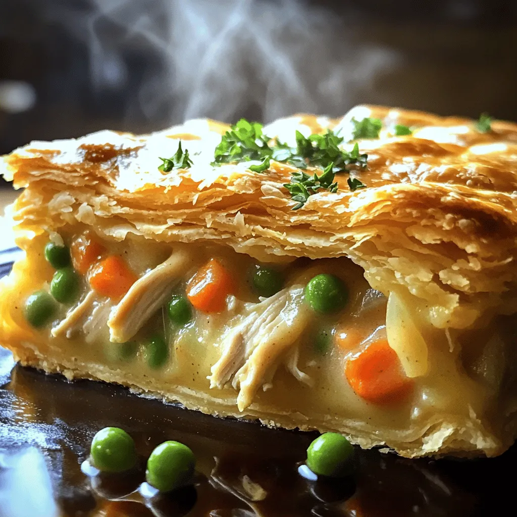 To make a tasty chicken pot pie, you need these main ingredients: - 2 cups cooked chicken, shredded - 1 cup carrots, diced - 1 cup peas (fresh or frozen) - 1 cup potatoes, diced - 1/2 cup celery, diced - 1/2 cup onion, chopped - 3 tablespoons butter - 3 tablespoons all-purpose flour - 2 cups chicken broth - 1 cup milk - 1 teaspoon garlic powder - 1 teaspoon thyme (dried or fresh) - Salt and pepper to taste - 1 package (2 crusts) refrigerated pie pastry (or homemade pie crust) - 1 egg, beaten (for brushing on crust) These ingredients come together to create a warm hug in a pie. The chicken gives protein, while the veggies add color and nutrients. The mix of broth and milk makes the filling creamy and rich. If you want to make changes, you can! For the chicken, try turkey or tofu for a twist. Use frozen veggies if fresh ones are not available. If you want a lighter option, swap the milk for unsweetened almond milk. For the crust, you can use whole wheat or gluten-free options. These swaps help you adjust the recipe to fit your taste or diet. Want to boost the flavor? Add some optional ingredients: - 1 cup mushrooms, sliced - 1 tablespoon fresh herbs like parsley or rosemary - 1/2 cup corn, fresh or frozen - A dash of hot sauce for a kick These extras can elevate your dish. Fresh herbs brighten the filling, while mushrooms add umami. Corn brings a nice sweetness, and hot sauce can spice things up. Feel free to mix and match according to your preferences. For the full recipe, check out the complete guide! First, gather your ingredients. You need: - 2 cups cooked chicken, shredded - 1 cup carrots, diced - 1 cup peas (fresh or frozen) - 1 cup potatoes, diced - 1/2 cup celery, diced - 1/2 cup onion, chopped - 3 tablespoons butter - 3 tablespoons all-purpose flour - 2 cups chicken broth - 1 cup milk - 1 teaspoon garlic powder - 1 teaspoon thyme (dried or fresh) - Salt and pepper to taste - 1 package (2 crusts) refrigerated pie pastry (or homemade pie crust) - 1 egg, beaten (for brushing on crust) Start by washing and chopping your vegetables. Dice the carrots, potatoes, celery, and onion. This helps them cook evenly. Next, melt the butter in a large saucepan over medium heat. Add the onion and celery, followed by the potatoes. Sauté these for about 5 minutes. You want them to soften but not brown. After this, sprinkle the flour over the veggies. Stir it in well. This helps thicken our filling. Cook it for another minute. Then, whisk in the chicken broth and milk slowly. Stir in the garlic powder, thyme, salt, and pepper. Keep cooking until the mixture thickens. This takes about 5 to 7 minutes. Once thickened, mix in the shredded chicken, diced carrots, and peas. Remove it from the heat and let it cool for a bit. Roll out one pie crust into your pie dish. Trim any extra crust hanging over the edges. Pour your chicken filling into the crust. Spread it out evenly. Next, roll out the second pie crust and place it over the filling. Trim the edges and crimp them to seal the pie. Cut a few slits in the top crust. This lets steam escape while it bakes. Before baking, brush the top crust with the beaten egg. This gives it a nice golden color. Bake your pie in a preheated oven at 425°F (220°C) for 30 to 35 minutes. Look for a golden brown crust and bubbly filling. Once done, let the pie cool for a few minutes before slicing. Serve it warm and enjoy your comforting meal. For the full recipe, check below. To get a flaky and golden crust, start with cold butter. Cut the butter into small pieces and mix it into the flour. Use a pastry cutter or your fingers to break it up. Aim for pea-sized clumps. This method helps create layers in your crust. Chill the dough for at least 30 minutes before rolling it out. This keeps the butter cold and helps with flakiness. Taste is key in any dish. Start with salt and pepper, but don’t stop there. Add fresh herbs like parsley or thyme for a burst of flavor. Garlic powder gives a warm depth, and you can play with spices too. If you like a bit of heat, a dash of cayenne can add excitement. Always taste your filling before sealing the pie. Adjust seasoning as needed to make it just right. One mistake is not pre-cooking the filling. Raw veggies will not soften enough while baking. Also, avoid overworking your dough. This can lead to a tough crust. Be careful not to skip the egg wash on top. It gives your pie a beautiful shine. Lastly, remember to cut slits in the top crust. This allows steam to escape and keeps the pie from getting soggy. If you want to dive deeper, check out the Full Recipe for more details! {{image_2}} You can make a tasty vegetarian chicken pot pie by swapping out the chicken. Use plant-based chicken or skip the meat entirely. Fill the pie with hearty veggies like mushrooms, zucchini, or bell peppers. These ingredients add great flavor and texture. You can still use the same creamy sauce, making it rich and comforting. Feel free to get creative with your vegetable choices. Instead of carrots and peas, try green beans, corn, or even sweet potatoes. Each vegetable brings its own taste and unique texture. Mixing up the veggies also makes your pot pie colorful and fun. Just remember to chop them into small pieces for even cooking. You can switch up your crust for a different twist. Instead of the classic pie crust, try puff pastry for a lighter, flakier texture. You can also make a biscuit topping for a hearty, comforting feel. If you’re in a hurry, use store-bought phyllo dough for a crispy, layered crust. Each option gives your pot pie a new look and taste. For the full recipe, check out Cozy Chicken Pot Pie. It’s a great starting point for your pot pie journey! You can store leftover chicken pot pie in an airtight container. Let it cool first. Place it in the fridge if you plan to eat it within three days. For longer storage, freezing is best. To reheat chicken pot pie, preheat your oven to 350°F (175°C). Cover the pie with foil to keep it moist. H