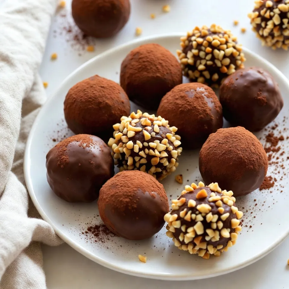 - 1 cup semi-sweet chocolate chips - 1/2 cup sweetened condensed milk - 1 tablespoon unsalted butter - 1 teaspoon vanilla extract - 1/4 cup cocoa powder - 1/4 cup chopped nuts (hazelnuts, almonds, or walnuts) - A pinch of sea salt The main ingredients create a rich base for these truffles. First, the semi-sweet chocolate chips add a deep, sweet flavor. Sweetened condensed milk makes the truffles creamy and smooth. Unsalted butter adds richness, while vanilla extract gives a warm aroma. Cocoa powder coats the truffles, providing a chocolatey bite. Chopped nuts add a crunchy texture, and sea salt enhances all the flavors. - Flavorings (e.g., almond extract, espresso powder) - Toppings (e.g., shredded coconut, sprinkles) You can customize the truffles with optional add-ins. For flavorings, almond extract gives a nutty taste. Espresso powder adds a coffee kick that pairs well with chocolate. Toppings like shredded coconut or sprinkles add fun and color. These choices let you create a unique twist on a classic treat. {{ingredient_image_1}} 1. In a medium saucepan, add the semi-sweet chocolate chips, sweetened condensed milk, and unsalted butter. 2. Heat the mixture over low to medium heat. Stir constantly. 3. Keep stirring until the chocolate melts and the mixture is smooth. 4. Remove the saucepan from heat. Stir in the vanilla extract and a pinch of sea salt. Mix well. 1. Let the mixture cool slightly at room temperature. 2. Cover the saucepan with plastic wrap. Refrigerate for about 1-2 hours. 3. Check if the mixture is firm enough to handle. 4. Use a small cookie scoop or your hands to make bite-sized balls. Aim for about 1 inch in diameter. 1. Roll each truffle in cocoa powder or chopped nuts. 2. Make sure they are fully coated. 3. Place the coated truffles on a baking sheet lined with parchment paper. 4. Refrigerate for an additional 30 minutes to set. Enjoy your delicious homemade truffles! Cooling time is key for great truffles. After mixing, let the mixture chill in the fridge. This helps it firm up. Aim for about 1-2 hours. If you skip this step, the truffles may be too soft to shape. When handling the mixture, use clean hands. If it sticks, keep your hands damp. This keeps the chocolate from clumping. A small cookie scoop works well for even balls. Presentation matters. Place your truffles in a cute box or on a nice platter. You can also sprinkle some cocoa powder on top. For a fun touch, try adding extra chopped nuts. It makes them look fancy and inviting. If your mixture is too soft, chill it longer. The cold helps it set. You can also add a bit more cocoa powder to thicken the mix. If the chocolate won't set, it may need more time. Give it a few more minutes in the fridge. Sometimes, gentle heat can help remelt and reset the chocolate. Just be careful not to overheat it. Pro Tips Use Quality Chocolate: Selecting high-quality semi-sweet chocolate chips will enhance the flavor of your truffles significantly. Chill for Firmer Truffles: If the mixture is too soft to form into balls, chilling it longer will help it firm up for easier handling. Experiment with Coatings: Try rolling your truffles in different coatings such as shredded coconut, crushed candy canes, or sprinkles for a fun twist. Store Properly: Keep your truffles in an airtight container in the refrigerator to maintain their freshness and texture. {{image_2}} You can change the flavor of your truffles with a few simple tricks. Adding different extracts gives you a fun twist. Try a splash of mint extract for a cool kick. A drop of orange extract brings bright citrus notes. You can also mix in spices. A pinch of cinnamon adds warmth. For a bit of heat, use chili powder. These flavor changes make your truffles unique and exciting. Coatings can transform your truffles. Instead of cocoa powder, you can roll them in crushed cookies. Think Oreos or graham crackers for a fun crunch. You could also use candy like sprinkles or crushed mints for a colorful look. Rolling in powdered sugar offers a sweet touch and a snowy finish. These coatings add texture and visual appeal to your truffles. If you need dietary options, I have you covered. You can make vegan truffles using dairy substitutes. Swap the unsalted butter for coconut oil and use dairy-free chocolate chips. This way, everyone can enjoy them. For gluten-free variations, choose certified gluten-free products. This ensures that your truffles stay friendly for all diets. To keep your truffles fresh, store them in the fridge. They stay good for about two weeks. If you prefer room temperature, place them in a cool spot. However, they last only a few days this way. For best results, use an airtight container. This helps prevent them from drying out. It also keeps other smells from getting into your truffles. You can freeze your truffles for longer storage. To freeze, place them on a baking sheet. Make sure they are not touching each other. Once frozen, transfer them to a freezer-safe bag. Remove as much air as you can. When you're ready to eat them, take out the number you want. Let them thaw in the fridge for a few hours. This keeps their texture smooth and creamy. Avoid thawing at room temperature to prevent them from getting too soft. Yes, you can use milk chocolate. It will make the truffles sweeter and creamier. The flavor will shift from rich and deep to lighter and more milky. If you love milk chocolate, this could be a fun twist! Just remember that the sweetness level will change. To lower the sweetness, try a few tricks. First, use dark chocolate instead of semi-sweet. Dark chocolate has less sugar and a richer taste. You can also reduce the amount of condensed milk. Start with 1/3 cup instead of 1/2 cup. Lastly, add a pinch of sea salt. It balances the sweetness and enhances flavor. Gifting truffles is fun and easy! Try placing them in a small, decorative box. You can also use a clear jar tied with a ribbon. Add a personal note for a special touch. For an elegant look, sp