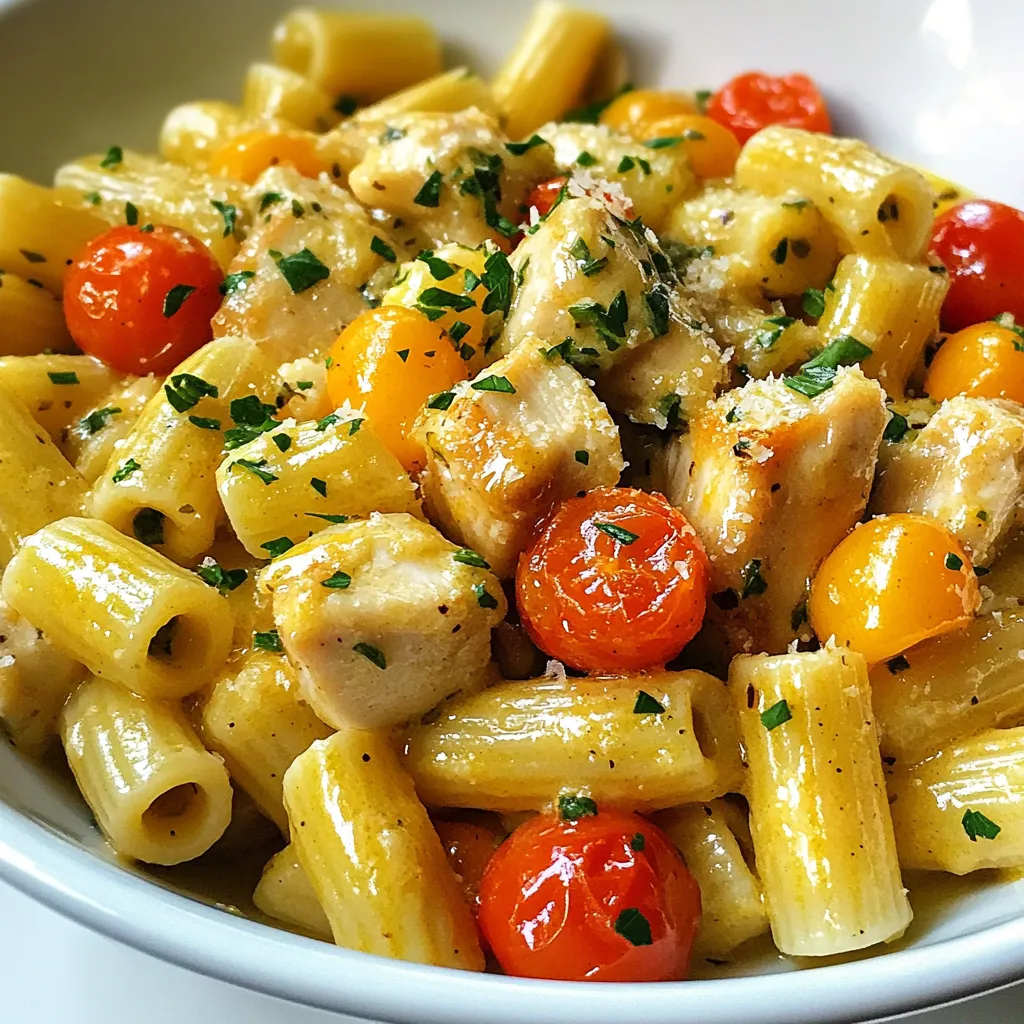 A delicious and creamy pasta dish featuring diced chicken, garlic, and fresh herbs, all tossed together for a comforting meal.