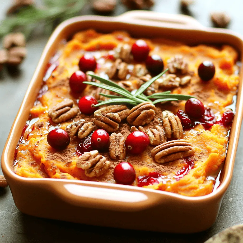 To create a tasty Cranberry Pecan Sweet Potato Casserole, gather the following ingredients: - 4 medium sweet potatoes, peeled and chopped - 1/2 cup brown sugar - 1/4 cup milk (or almond milk for a dairy-free option) - 1/4 cup unsalted butter, melted - 1 teaspoon vanilla extract - 1/2 teaspoon cinnamon - 1/4 teaspoon nutmeg - 1 cup fresh or frozen cranberries - 1 cup pecans, chopped - 1/4 cup maple syrup - Pinch of salt These ingredients work together to create a comforting dish. The sweet potatoes provide a creamy base. The brown sugar adds sweetness, while the milk makes it rich. Butter and vanilla bring warmth and depth. The spices like cinnamon and nutmeg give a cozy feel. Cranberries add a burst of tartness, balancing the sweetness. Pecans offer a nice crunch and nutty flavor. Maple syrup adds a touch of earthiness. Finally, a pinch of salt enhances all the flavors. You can mix and match these ingredients based on your taste. If you like it sweeter, add more brown sugar or maple syrup. For a richer flavor, use more butter. This dish is not just food; it’s an experience. Enjoy the process and the delicious results! - Preheat your oven to 350°F (175°C). - Peel and chop the sweet potatoes into small pieces. - Boil the sweet potatoes in a large pot for 15-20 minutes. They should be tender when done. - Drain the water and let the potatoes cool slightly. - In a large bowl, mash the sweet potatoes until smooth. - Add brown sugar, milk, melted butter, vanilla, cinnamon, nutmeg, and a pinch of salt. Mix until well combined. - Gently fold in the cranberries and half of the chopped pecans. - Transfer the sweet potato mixture to a greased 9x13 inch baking dish. Spread it evenly. - In another bowl, mix the remaining pecans with maple syrup. Toss them to coat well. - Sprinkle the pecan mixture over the sweet potato layer. - Bake for 25-30 minutes until heated through and the top is slightly crispy. - Remove from the oven and let it cool for a few minutes before serving. To make the best sweet potato casserole, start with the right potatoes. Choose medium sweet potatoes. Peel and chop them into even pieces. This helps them cook evenly. Boil them for 15 to 20 minutes until they are tender. You can check by poking with a fork. Drain and let them cool slightly before mashing. If you want a dairy-free option, use almond milk instead of regular milk. The flavor stays rich and creamy. You can also swap the butter for a dairy-free spread. This keeps the dish tasty without dairy. Timing is key when baking. Preheat your oven to 350°F (175°C) before you start mixing. This ensures your casserole cooks evenly. Bake for 25 to 30 minutes. It should be hot and have a slight crisp on top. Garnishing adds flair to your dish. A sprig of fresh rosemary looks great on top. You can also sprinkle extra cinnamon for added flavor. Pair the casserole with roasted turkey or glazed ham. This dish brings both sweet and savory flavors to your meal. It works well with green beans or a fresh salad. For presentation, serve the casserole warm. Use a nice baking dish to show off the colors. A deep dish allows the layers to shine. You can also add a drizzle of maple syrup on top just before serving to make it even more inviting. {{image_2}} You can try different nuts like walnuts or almonds. Each brings a unique crunch. Walnuts add a rich, earthy taste. Almonds offer a milder flavor. You can also switch up the fruits. Try adding diced apples or pears instead of cranberries. For sweeteners, consider using honey or agave syrup. Both can add a new sweetness level to your dish. If you want a slow cooker version, it works well. Just combine all the ingredients in the slow cooker. Set it on low for about four hours. This makes it easy for gatherings. For smaller servings, halve the recipe and use an 8x8-inch dish. You can also double the recipe for larger groups. Just make sure to adjust the baking time. Add seasonal spices like ginger or cloves for a warm touch. They enhance the dish's flavor profile. During holidays, consider topping the casserole with mini marshmallows. They add sweetness and a fun texture. You can also use fresh herbs like rosemary or thyme as a garnish. These bring a lovely aroma to your table. To store your leftover casserole, use airtight containers. Glass or plastic containers work well. Make sure the casserole is cool before sealing. In the fridge, it lasts about 3 to 5 days. If you want to keep it longer, freeze it. In the freezer, it stays good for about 2 to 3 months. Just remember to label your containers with the date. When it’s time to eat leftovers, you can reheat them in several ways. The oven gives the best results. Preheat the oven to 350°F (175°C). Place the casserole in a baking dish, cover it with foil, and heat for about 20 minutes. You can also use the microwave for quick reheating. Just heat it in short bursts, stirring in between. To keep the texture and flavor, avoid overheating. If it seems dry, add a splash of milk or water before reheating. Enjoy every bite of your delicious casserole! Can I prepare the casserole ahead of time? Yes, you can prepare the casserole a day before. Just cover it and store it in the fridge. When you are ready, bake it at 350°F for about 25-30 minutes until hot. What can I substitute for pecans? If you cannot use pecans, try walnuts or almonds. Both give a nice crunch. You can also skip nuts for a nut-free version. Is this recipe suitable for vegans? Yes, this recipe can be vegan. Use almond milk and replace the butter with vegan butter. The dish will still taste great! How do I know when the sweet potatoes are done? The sweet potatoes are done when they are tender. You can poke them with a fork. If it goes in easily, they are ready. Can I use canned sweet potatoes instead? You can use canned sweet potatoes, but it may change the texture. Drain them well and mash them before mixing with other ingredients. What goes well with sweet potato casserole? Sweet p