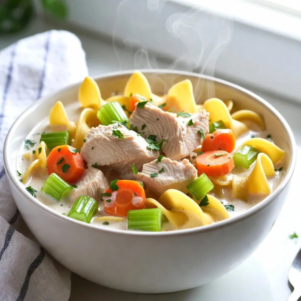 A quick and delicious chicken noodle soup that is creamy and comforting.