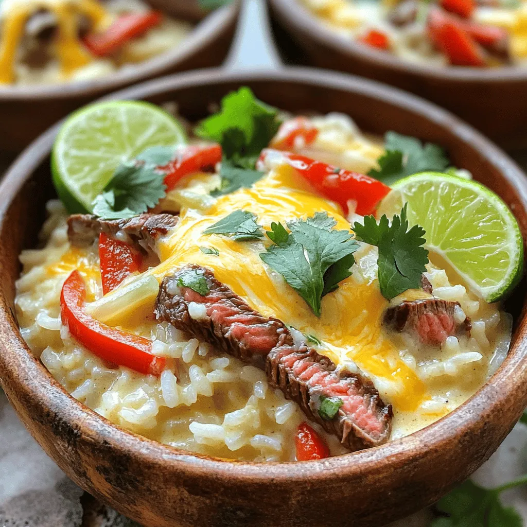 Jasmine rice gives a lovely aroma and texture. You can swap it with basmati rice if you like. Chicken broth adds depth, but vegetable broth works too. The queso cheese sauce is key for creaminess. You can make it at home or buy it ready-made. For steak, sirloin or flank is great, but chicken or shrimp can also work. Bell peppers add color and sweet flavor, while onion and garlic bring richness. For spice, chili powder and cumin are perfect; adjust to your taste. Fresh cilantro and lime add freshness and zesty notes at the end.