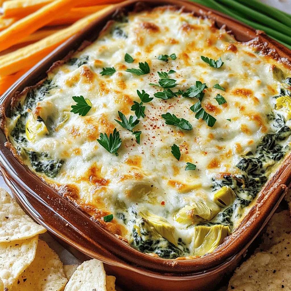 - 1 cup frozen spinach, thawed and drained - 1 cup canned artichoke hearts, chopped - 1 cup cream cheese, softened - ½ cup sour cream - ½ cup mayonnaise - 1 cup shredded mozzarella cheese - ½ cup grated Parmesan cheese - 2 cloves garlic, minced - ½ teaspoon onion powder To make creamy spinach artichoke dip, you need simple yet flavorful ingredients. First, frozen spinach works great. Make sure to thaw and drain it well. Canned artichoke hearts add a nice touch. They are soft and easy to chop. Cream cheese is the base. It gives the dip its rich texture. Sour cream and mayonnaise balance the creaminess. Use full-fat versions for the best taste. Don't forget the cheeses! Mozzarella makes it gooey and stretchy, while Parmesan adds depth. Minced garlic brings a bold flavor. Finally, onion powder adds a subtle hint of sweetness. - Salt and pepper to taste - Optional: Red pepper flakes for heat Season the dip with salt and pepper. This step enhances all the flavors. If you like a kick, add red pepper flakes for heat. Just a pinch can elevate the dish. - Alternative cheeses - Healthier substitutes for sour cream and mayonnaise You can swap out the cheeses if you prefer. Try using cheddar or goat cheese for a different flavor. For a healthier option, use Greek yogurt instead of sour cream or mayonnaise. This switch cuts calories while keeping the dip creamy. First, you need to thaw and drain the spinach. I like to use frozen spinach. After it thaws, squeeze out the extra water. This keeps the dip from getting too watery. Next, chop the canned artichoke hearts. You want them in small pieces. Finally, mince two cloves of garlic. The garlic adds a great flavor to the dip. Now, let's mix the dip. In a large bowl, combine the softened cream cheese, sour cream, and mayonnaise. Stir until it is smooth and creamy. Then, add in the drained spinach, chopped artichokes, minced garlic, and both cheeses. This includes shredded mozzarella and grated Parmesan. Next, sprinkle in the onion powder, salt, and pepper. If you want some heat, add red pepper flakes. Mix everything well until it is fully combined. Before baking, preheat your oven to 375°F (190°C). Grease a baking dish lightly. This helps the dip come out easily. Transfer the dip mixture into the dish and spread it evenly. Bake in the oven for about 25-30 minutes. You want it to be bubbly and golden on top. Once it’s ready, take it out and let it cool for a few minutes before serving. You can find the full recipe in the section above. To make your dip extra creamy, use soft cream cheese. Softening is easy. Just take it out of the fridge and let it sit for 30 minutes. You can also microwave it for 10-15 seconds. This helps it mix better with other ingredients. A smooth base makes a big difference. Temperature matters! Make sure your other ingredients are at room temperature too. Sour cream and mayonnaise blend more easily when warm. This will help create that velvety texture we all love. Adding herbs or spices can really boost the flavor. Try mixing in some garlic powder, Italian seasoning, or fresh basil. Each addition brings a new twist to the dip. If you like a kick, add some red pepper flakes. Cheese combinations are fun to explore. You can use sharp cheddar for a tangy taste. Mixing mozzarella with provolone adds depth. Experiment with what you have on hand for unique flavors. When it comes to dippers, think beyond chips! Fresh veggies like carrots and bell peppers add a nice crunch. Sliced baguette is also a great choice. It soaks up the dip well and tastes fantastic. Presentation is key! Serve the dip in a nice bowl, and don't forget to garnish. A sprinkle of Parmesan cheese or fresh parsley can make it pop. You want your dip to look as good as it tastes! {{image_2}} You can easily make a vegan version of this dip. For dairy-free substitutes, use cashew cream instead of cream cheese. Cashew cream gives a rich texture and flavor. Blend soaked cashews with water until smooth. Add nutritional yeast for that cheesy taste. It adds a nice depth without dairy. Want to spice things up? Try adding sun-dried tomatoes or crispy bacon. Both add a punch of flavor that makes the dip special. If you like heat, mix in some jalapeños. They give a nice kick that pairs well with the creamy base. If you prefer a cold dip, it's easy to adjust the recipe. Just skip the baking part and chill the mixture in the fridge. Serve it with fresh veggies or crackers. It’s a refreshing option for parties. For a nice touch, add a sprinkle of fresh herbs on top before serving. Explore the full recipe for more details on making this tasty dip! To store leftovers, let the dip cool down. Place it in an airtight container. This keeps the dip fresh for longer. I like to use glass containers. They don’t stain and are easy to clean. Make sure to seal the lid tightly before putting it in the fridge. You can freeze this dip for later use. First, let it cool completely. Then, transfer it to a freezer-safe container. Leave some space at the top. The dip will expand as it freezes. When you're ready to eat it, take it out and let it thaw in the fridge overnight. To reheat, bake it at 350°F (175°C) for about 25 minutes. Stir occasionally for even heating. In the fridge, this dip lasts for about 3 to 5 days. If you freeze it, it can last for up to 3 months. Check for signs of spoilage before eating. If it has an off smell, or if you see mold, throw it away. Always trust your senses when it comes to food safety. Yes, you can make this dip ahead of time. Prepare it up to a day before. Store it in a covered dish in the fridge. When you're ready to serve, just bake it. This saves time and makes it easier for parties. You can use Greek yogurt or silken tofu instead of cream cheese. Both will give a creamy texture. Greek yogurt adds a tangy flavor, while silken tofu keeps it neutral. Choose based on your taste and dietary needs. Yes, this dip is gluten-free. All its ingredients are natura
