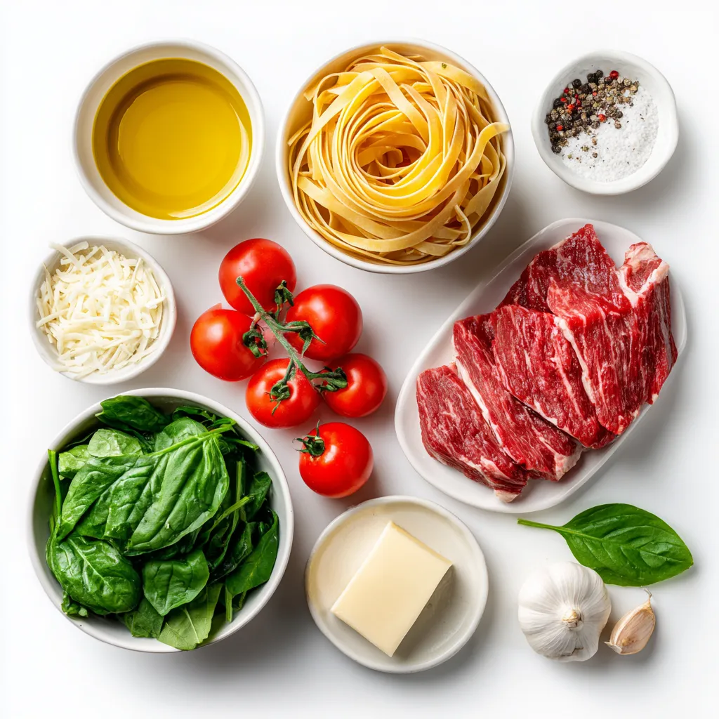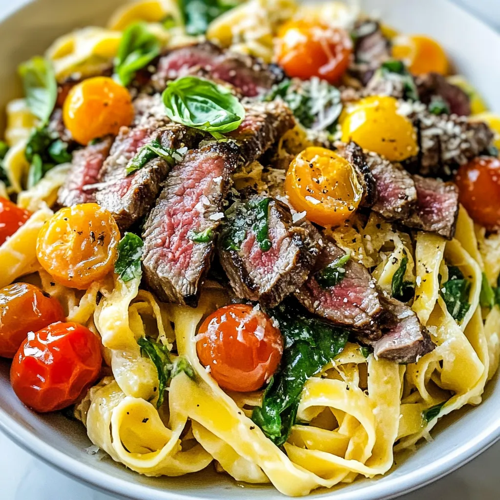 Now, add 1 cup of halved cherry tomatoes and 1 cup of fresh spinach to the sauce. Stir them in and let them cook for about 2-3 minutes. The spinach will wilt, and the tomatoes will soften. Once that’s done, return the seared steak to the skillet along with the cooked fettuccine. Toss everything together, adding the reserved pasta water a little at a time. Mix until the sauce reaches your desired thickness.