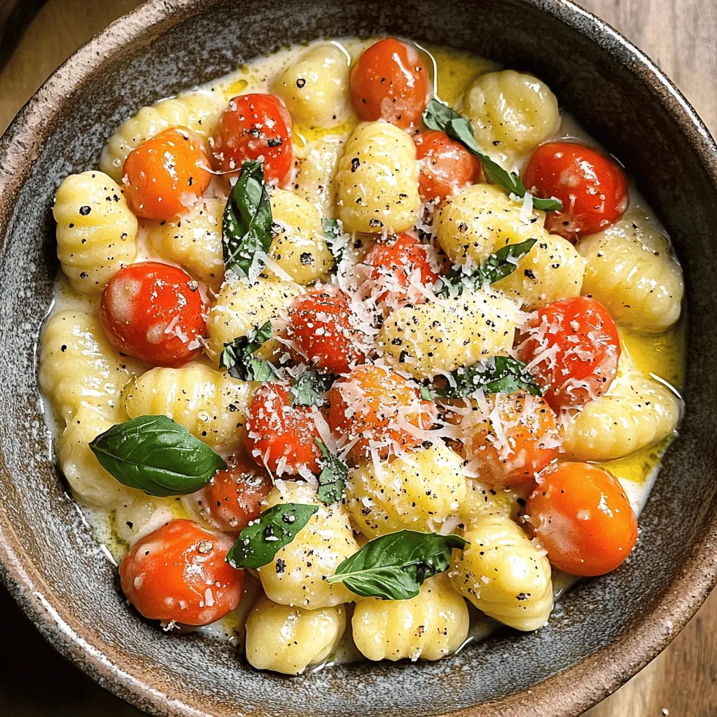 To make the creamy tomato basil gnocchi, gather these key items: - 1 package (16 oz) gnocchi - 2 cups cherry tomatoes, halved - 1 medium onion, diced - 3 cloves garlic, minced - 1 cup vegetable broth - 1 cup heavy cream (or coconut cream for a dairy-free option) - 1 cup fresh basil, chopped - 1 teaspoon dried oregano - 1 tablespoon olive oil - Salt and pepper to taste - Grated Parmesan cheese for serving (optional) These ingredients create a rich and creamy dish filled with flavor. You can personalize this dish by adding: - Spinach or kale for extra greens - Red pepper flakes for a spicy kick - Lemon zest for a fresh twist - Cooked chicken or shrimp for added protein These extras can enhance the meal and make it your own. If you have dietary needs, here are some easy swaps: - Use gluten-free gnocchi for a gluten-free meal. - Coconut cream works well for dairy-free diets. - Swap heavy cream with cashew cream for a lighter option. These substitutions keep the taste while fitting your dietary choices. Gather all your ingredients first. This makes cooking easier. You will need: - 1 package (16 oz) gnocchi - 2 cups cherry tomatoes, halved - 1 medium onion, diced - 3 cloves garlic, minced - 1 cup vegetable broth - 1 cup heavy cream (or coconut cream for a dairy-free option) - 1 cup fresh basil, chopped - 1 teaspoon dried oregano - 1 tablespoon olive oil - Salt and pepper to taste - Grated Parmesan cheese for serving (optional) Now, prepare your workspace. Chop and dice the onion and garlic. Halve the cherry tomatoes. This way, you have everything ready when you start cooking. Heat the olive oil in a large pot over medium heat. Add the diced onion. Sauté for about 3 to 4 minutes until the onion turns soft and clear. Next, add the minced garlic. Cook it for just 1 minute. This will make your kitchen smell great! Now, stir in the halved cherry tomatoes. Cook them for about 5 minutes. You want them to soften and release their juices. After that, pour in the vegetable broth. Bring it to a simmer, which means small bubbles should form. Add the gnocchi to the pot. Stir well to mix everything. Cook the gnocchi according to the package instructions, usually 2 to 3 minutes. Once the gnocchi is soft, lower the heat. Stir in the heavy cream and dried oregano. Mix everything well, and cook for another 2 to 3 minutes. This helps the sauce thicken up nicely. Now it’s time to add the fresh basil. Stir it in gently. Season with salt and pepper to taste. Remove the pot from heat. Serve your creamy tomato basil gnocchi right away. For a special touch, sprinkle grated Parmesan cheese on top if you like. For a beautiful presentation, serve in bowls. Add a few extra basil leaves and a drizzle of olive oil on top. This makes your dish look colorful and appetizing! Enjoy your delightful meal! To make your creamy tomato basil gnocchi extra tasty, use fresh ingredients. Fresh basil brings a bright flavor. Try adding a splash of lemon juice for a tangy twist. A pinch of red pepper flakes will add a nice kick. When you cook the garlic, let it become fragrant but not brown. This keeps the flavor fresh and mild. If your sauce is too thick, add a little vegetable broth. This will loosen it up without losing flavor. In case your sauce tastes bland, add more salt or a dash of vinegar. If the gnocchi sticks together, stir gently but often while cooking. This helps keep them separated and tender. A large pot or Dutch oven is best for this recipe. It allows even cooking and easy stirring. A good chef's knife will help you chop the onion and garlic quickly. Use a wooden spoon to stir the mixture well. For serving, a ladle can help dish out perfect portions. Keep a measuring cup handy for broth and cream to ensure accuracy. {{image_2}} You can easily make this dish vegan. First, swap the heavy cream for coconut cream. This gives a rich flavor without dairy. Use vegetable broth to keep it plant-based. Make sure to check the gnocchi package for any hidden dairy. Many brands offer vegan-friendly options. Want more protein in your meal? Add cooked chickpeas or lentils. They blend well with the sauce and add texture. You can also toss in some sautéed mushrooms or spinach. These not only boost protein but also add depth to the dish. Use seasonal ingredients to change things up. In summer, fresh zucchini or bell peppers work great. In fall, roasted butternut squash adds a sweet touch. You can even replace cherry tomatoes with diced ripe tomatoes in the summer months. This keeps the dish fresh and exciting! To store leftovers, let the gnocchi cool down. Transfer it to an airtight container. Keep it in the fridge. It stays fresh for up to three days. You can also add a little extra cream to keep it moist. Reheat the gnocchi on the stove for the best taste. Use a medium heat and add a splash of broth or cream. Stir gently until it warms through. You can also microwave it in short bursts. Cover it to keep moisture in. To freeze, place the cooled gnocchi in a freezer-safe container. It can last up to three months in the freezer. When ready to eat, thaw overnight in the fridge. Reheat it on the stove or oven. The texture may change slightly, but it will still taste great. You can serve creamy tomato basil gnocchi with a fresh salad. A simple green salad adds crunch and freshness. Garlic bread pairs well too, giving a nice touch of flavor. You could also serve it with grilled chicken or shrimp for extra protein. The rich sauce of the gnocchi complements these sides perfectly. Yes, you can make creamy tomato basil gnocchi ahead of time. Cook it as the recipe says, then cool it down. Store it in an airtight container in the fridge for up to two days. When you are ready to eat, just reheat it on the stove. Add a splash of broth or cream to keep it creamy. Yes, you can make a gluten-free version of creamy tomato basil gnocchi. Look for gluten-free gnocchi made from potato or rice flour. The rest of the recipe stays the same. Use the same fresh 