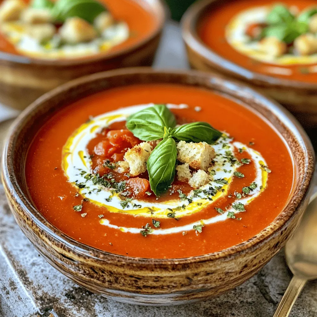 - 2 tablespoons olive oil - 1 medium onion, diced - 3 cloves garlic, minced - 2 cans (14 oz each) diced tomatoes (or 4 cups fresh tomatoes, chopped) - 2 cups vegetable broth - 1 cup heavy cream (or coconut cream for a dairy-free option) - 1/4 cup fresh basil, chopped - 1 teaspoon sugar (optional, to balance acidity) - Salt and pepper to taste - Croutons and additional basil for garnish The first step in making creamy tomato basil soup is gathering your ingredients. Each item plays a crucial role in building rich, tasty flavors. Olive oil gives the soup a nice base. I always choose good quality oil. The onion adds sweetness and depth. Diced tomatoes bring acidity and brightness. I often use canned tomatoes for ease, but fresh tomatoes work too. The vegetable broth adds a savory touch. Heavy cream makes the soup rich and creamy. For a lighter option, coconut cream is a fantastic choice. Fresh basil gives the soup its signature flavor. A little sugar can help balance the acidity if needed. Finally, salt and pepper bring everything together. - Calories per serving: Approximately 350 calories - Breakdown of macronutrients: - Carbohydrates: 25g - Protein: 6g - Fat: 24g Knowing the nutritional value helps you make informed choices. This soup packs a hearty flavor while still providing good energy. Enjoy it as a meal or a starter! You can find the full recipe linked to create your own version. 1. Start by heating the olive oil in a large pot over medium heat. 2. Add the diced onion and sauté for about 5 minutes. The onion should become soft and clear. 3. Next, stir in the minced garlic. Cook for about 1 minute. Watch it closely so it does not burn. 4. Pour in the diced tomatoes and their juices, along with the vegetable broth. 5. If you want, add 1 teaspoon of sugar. This will help balance the tomato's acidity. 6. Bring the mixture to a low boil. Then, lower the heat and let it simmer. Let it cook for about 15 to 20 minutes. This helps the flavors combine well. 7. For a smooth soup, use an immersion blender. Blend until the soup is creamy. If you do not have one, transfer the soup to a blender. Blend in small batches and be careful with the hot liquid. 8. If you used a blender, pour the soup back into the pot. Now, stir in the heavy cream or coconut cream. Heat this on low for about 5 minutes. 9. Toss in the fresh chopped basil. Add salt and pepper to taste. Let it cook for another 2 minutes. 10. Serve the soup hot. Garnish with croutons and some extra basil. - The total cooking time for this creamy tomato basil soup is about 40 minutes. - If you want a thicker soup, let it simmer a bit longer. For a thinner soup, add more broth. Using an immersion blender makes this process easier. It cuts down on mess and saves time. You can blend the soup right in the pot. Just be careful not to splash yourself! If you prefer, you can also use a regular blender. Just remember to let the soup cool slightly before blending. This keeps you safe from burns. Enjoy your creamy tomato basil soup! To make your creamy tomato basil soup extra tasty, try these tips: - Add a pinch of red pepper flakes for heat. - Use fresh basil for a bright flavor. - Roast the garlic before adding it to deepen the taste. - Sauté the onions until they caramelize for a sweeter base. Balancing acidity is key in a tomato soup. If your soup tastes too tangy, add one teaspoon of sugar. It can smooth out sharp flavors. This little trick works wonders with canned tomatoes, which can sometimes be more acidic. Presentation matters, even for soup! Here are some ideas: - Serve in rustic bowls for a cozy feel. - Drizzle extra cream on top for a pretty swirl. - Add a sprig of fresh basil for a pop of color. - Top with homemade croutons for a crunchy bite. For sides, pair your soup with grilled cheese or a fresh salad. This makes for a warm and comforting meal. Enjoy every bite! {{image_2}} If you want a dairy-free soup, you can use coconut cream instead of heavy cream. It adds a nice richness. Other options include cashew cream or almond milk for a lighter version. Both will keep the soup creamy and tasty. Just blend soaked cashews with water until smooth. This way, you can enjoy a creamy texture without dairy. You can boost the soup with extra veggies or proteins. Try adding spinach or kale for greens. Carrots or bell peppers will add sweetness and color. If you want protein, consider adding cooked chicken or white beans. Both will make the soup heartier. Remember to adjust the cooking time slightly if you add raw proteins. Using seasonal ingredients can change the soup's flavor. In summer, add fresh corn or zucchini for sweetness. In fall, consider roasted butternut squash for a warm taste. You can also use herbs like thyme or oregano when basil is not in season. This keeps the soup fresh and exciting throughout the year. For the full recipe, check out the Creamy Tomato Basil Bliss section. To store leftovers, let the soup cool first. Pour it into an airtight container. Seal it tightly to avoid air exposure. You can keep it in the fridge for up to four days. This soup tastes even better the next day as the flavors mix. To freeze the soup, cool it completely before packing it. Use freezer-safe containers or bags. Leave some space at the top, as the soup will expand. You can freeze it for up to three months. Thaw it overnight in the fridge before reheating. The best way to reheat the soup is on the stove. Pour the soup into a pot over medium heat. Stir often to prevent sticking. You can also use a microwave in a safe bowl. Heat in short bursts and stir in between. Always check that it is hot throughout before serving. Enjoy with fresh croutons or a sprinkle of basil! To make creamy tomato basil soup, follow these simple steps: 1. Heat olive oil in a large pot. 2. Add diced onion and sauté for 5 minutes. 3. Stir in minced garlic for 1 minute. 4. Pour in diced tomatoes and vegetable broth. 5. Bring to a low boil, then simmer for 15-20 minutes. 6. Bl