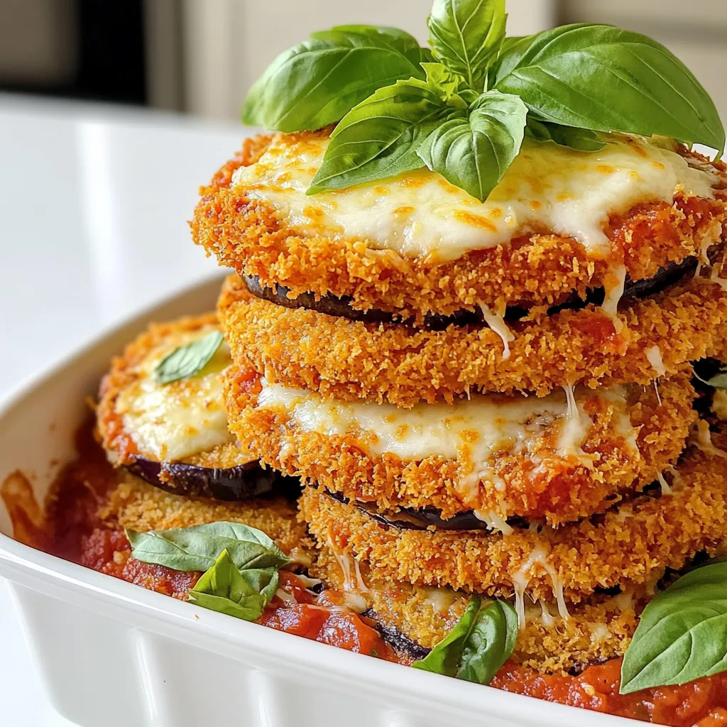 Now, it’s time to assemble. Spread a thin layer of marinara sauce in a baking dish. Layer half of the crispy eggplant slices on top. Add half of the remaining marinara sauce. Then, sprinkle half of the shredded mozzarella cheese and half of the grated Parmesan cheese. Repeat these layers with the rest of the ingredients.