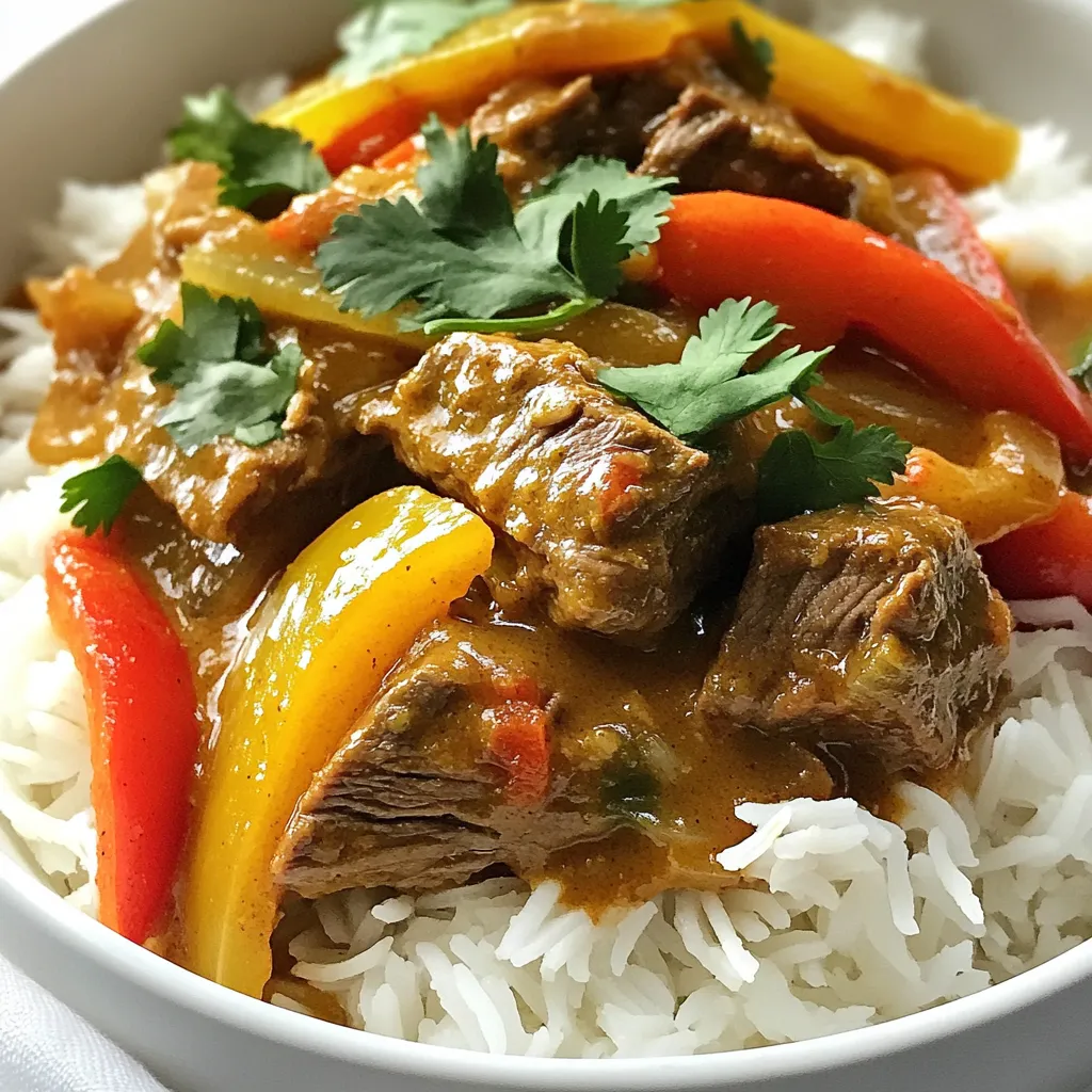 A rich and flavorful beef curry cooked slowly in a crockpot with coconut milk and vegetables.