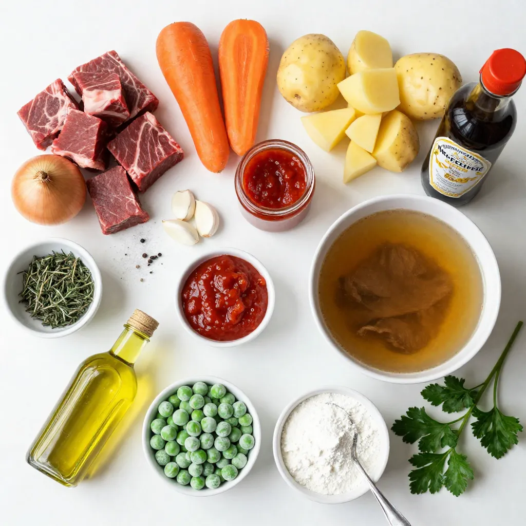For liquids, beef broth is key. It gives the stew depth. Tomato paste adds a nice tang, and Worcestershire sauce brings umami.