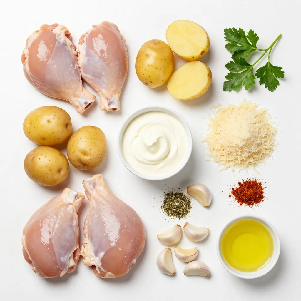 Here is what you need to make Crockpot Garlic Parmesan Chicken & Potatoes: - 4 boneless, skinless chicken thighs - 1.5 lbs baby potatoes, halved - 1 cup heavy cream - 1 cup grated Parmesan cheese - 4 cloves garlic, minced - 1 teaspoon Italian seasoning - 1 teaspoon smoked paprika - Salt and pepper to taste - 2 tablespoons olive oil - Fresh parsley, chopped (for garnish) These ingredients create a rich and creamy dish. The chicken thighs add tenderness, while the baby potatoes soak up all the tasty flavors. Heavy cream and Parmesan cheese bring a nice richness to the mix. The minced garlic gives a great aroma, and the spices make it pop. Using fresh parsley as a garnish not only looks nice but adds a fresh taste too. This dish is simple yet full of flavor. You can find all these ingredients easily at your local store. Enjoy the process of gathering them; it sets the stage for a great meal! {{ingredient_image_1}} To start, heat olive oil in a skillet over medium heat. While that heats, season the chicken thighs with salt, pepper, smoked paprika, and Italian seasoning. This adds great flavor. Once the oil is hot, brown the chicken for about 3-4 minutes on each side. It should turn golden. After browning, remove the chicken from the skillet and set it aside. Next, grab your slow cooker. Add the halved baby potatoes. Sprinkle them with salt and pepper, then give them a good stir to coat evenly. This step helps the potatoes absorb flavor. Now, let’s make the creamy sauce. In a mixing bowl, combine 1 cup of heavy cream, 1 cup of grated Parmesan cheese, and 4 cloves of minced garlic. Stir well until everything mixes nicely. This rich sauce will be the star of the dish. It's time to layer the ingredients in the slow cooker. Pour the creamy sauce over the potatoes. Place the browned chicken thighs on top of the potatoes and sauce. Make sure the chicken is partially submerged for even cooking. Cover the slow cooker with its lid. You can cook on low for 6-7 hours or on high for 3-4 hours. The chicken should be cooked through and tender. The potatoes should also be fork-tender. Once cooked, give the mixture a gentle stir to combine the flavors. Now it’s ready to serve! Using fresh garlic gives a stronger taste. It brightens up the dish. Garlic powder lacks that fresh kick. For this recipe, fresh garlic is best. Mince the cloves finely to spread the flavor. For potatoes, baby potatoes are perfect. They cook well and keep their shape. They are creamy inside and crispy on the outside. You can use red or yellow baby potatoes. They add color and flavor. To make your dish look great, use shallow bowls. Place the chicken and potatoes in the center. Drizzle the creamy sauce over everything. Finish with chopped parsley for color. This makes a simple but beautiful meal. For sides, consider a fresh salad. A light green salad pairs well. You can also serve crusty bread. It soaks up the sauce nicely. Another option is steamed veggies for a healthy touch. You can prep this dish earlier in the day. Season the chicken and brown it. Place it in the fridge until you’re ready to cook. You can also cut the potatoes ahead. Just keep them in water to prevent browning. In the morning, add everything to the slow cooker. Set it on low and let it cook. When you come home, a warm meal awaits you. This makes weeknight dinners easy and stress-free. Pro Tips Choose the Right Cut: For the best texture and flavor, use boneless, skinless chicken thighs instead of breasts. They remain tender during the long cooking time. Perfect Potato Prep: Halve the baby potatoes for even cooking and to allow them to absorb more of the creamy sauce flavor. Slow Cooker Tips: Avoid lifting the lid during cooking as it can significantly increase cooking time. Keep it closed for the best results! Garnish for Flavor: Always finish with a sprinkle of fresh parsley before serving to enhance the dish's appearance and add a fresh flavor contrast. {{image_2}} You can change the protein in this dish. Try chicken breasts or even pork. Both options will still soak up all the tasty flavors. If you want a lighter dish, swap heavy cream for half-and-half or Greek yogurt. These swaps keep the dish creamy while cutting some calories. Add more veggies to the mix for extra nutrition. Carrots or peas work great in this recipe. You can also adjust the spices to fit your taste. Want it spicier? Add some red pepper flakes. Prefer a sweeter taste? Try adding a bit of honey. Each small change can make a big difference! Store leftovers in airtight containers. Glass or plastic containers work best. Make sure they seal well. If you plan to eat them soon, keep them in the fridge. They will stay fresh for up to three days. For longer storage, freeze the leftovers. They can last up to three months in the freezer. Label your containers with the date to track freshness. To reheat, use the microwave for quick warming. Place the dish in a microwave-safe bowl. Cover it with a lid or plastic wrap to keep moisture. Heat for two to three minutes, stirring halfway through. For the best texture, use the oven. Preheat to 350°F (175°C). Place the chicken and potatoes in a baking dish and cover with foil. Heat for about 15-20 minutes. Check that it is warm throughout before serving. You can serve this dish with a green salad or steamed veggies. Garlic bread pairs well too. For a hearty meal, try it with rice or crusty rolls. Each side adds a nice touch and balances the meal. Yes, you can use frozen chicken. Just add extra cooking time. Thawing the chicken first is best for even cooking. If you cook from frozen, ensure it reaches a safe temperature. The chicken is done when it reaches 165°F. Use a meat thermometer to check this. The meat should be tender and juices should run clear. If it's pink, cook it longer. Yes, you can cook it on the stovetop. Brown the chicken in a pan. Then add the potatoes and sauce. Simmer on low heat for about 30-40 minutes until everything is cooked. Absol