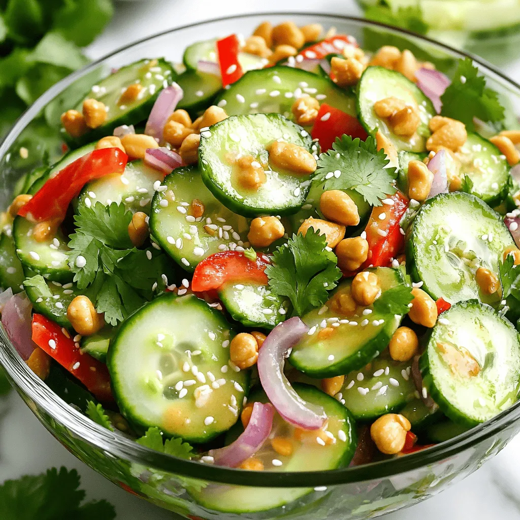 - 2 large cucumbers, thinly sliced - 1 cup roasted peanuts, roughly chopped - 1 red bell pepper, diced - 1 small red onion, thinly sliced - 1/4 cup fresh cilantro, chopped - 1 tablespoon sesame oil - 3 tablespoons soy sauce (low-sodium) - 1 tablespoon rice vinegar - 1 tablespoon honey or agave syrup - 1 teaspoon grated ginger - 1-2 teaspoons sriracha sauce (optional) - Additional vegetables (e.g., carrots or radishes) - Fruits (e.g., oranges or mango) - Spices for extra flavor The key to a great cucumber peanut salad is its fresh and crunchy ingredients. You start with fresh cucumbers, which give a nice crispness. I love using large cucumbers and slicing them thin. The red bell pepper adds a sweet twist, while the red onion brings a bit of sharpness. Roasted peanuts are a must. They add a nutty taste and crunch. Fresh cilantro ties all these flavors together with its bright notes. For the dressing, I mix sesame oil, low-sodium soy sauce, and rice vinegar. Honey or agave syrup balances the salty and tangy flavors. Grated ginger gives it a spicy kick, and sriracha can add more heat if you like. You can also add more veggies or fruits. Carrots add sweetness, while oranges or mango bring a juicy surprise. This salad is flexible. You can make it your own. You can find the full recipe to make this salad easily at home. Enjoy experimenting with different ingredients and flavors! Start by prepping your veggies. Slice the cucumbers thinly. Next, dice the red bell pepper into small pieces. Then, take your red onion and slice it thinly. Now, chop the fresh cilantro and roughly chop the roasted peanuts. This will add a nice crunch to your salad. In a small bowl, whisk together the dressing ingredients. Combine sesame oil, soy sauce, rice vinegar, honey or agave syrup, and grated ginger. If you like some heat, add sriracha sauce to the mix. Take a large bowl and toss in your salad ingredients. Add the sliced cucumbers, diced bell pepper, red onion, chopped cilantro, and roasted peanuts. Pour the dressing over everything and gently toss it all together. Let the salad sit for about 10-15 minutes. This helps the flavors mix and meld together. Before serving, taste the salad. Adjust the seasoning with salt and pepper if needed. Enjoy this crunchy and flavorful delight! For the complete recipe, check out the Full Recipe. To make the best cucumber peanut salad, use fresh cucumbers. They will give you a crunchier texture. Look for ones that feel firm and have shiny skin. Also, wash and dry your herbs before chopping. This step helps them stay fresh and flavorful. For deeper flavor, consider marinating the salad longer. Letting it sit allows all the ingredients to blend well. Adjust the acidity by adding more vinegar if needed. A splash more can brighten the taste and make it pop. Serve the salad chilled for the best taste. It pairs well with grilled meats or barbecue. You can also add a sprinkle of extra peanuts or cilantro on top for a nice finish. This little touch makes your dish look even better. Enjoy this crunchy and flavorful delight! For the complete recipe, check out the Full Recipe. {{image_2}} You can easily make this cucumber peanut salad vegan. Just swap honey for agave syrup. This keeps the sweetness without using animal products. Agave gives a nice touch to the dressing. If you need a nut-free salad, try replacing peanuts with sunflower seeds. Sunflower seeds add a crunchy texture. They also give a nice, nutty flavor without the allergens. For a gluten-free version, use tamari instead of soy sauce. Tamari is a great soy sauce alternative that is gluten-free. It adds the same umami taste to your dressing without the gluten. Feel free to explore these variations to suit your diet while enjoying the full recipe! Store leftovers in an airtight container. This keeps the salad fresh and crunchy. Make sure to seal it tightly. If you leave it open, it can get mushy. Always cool it down before storing. Consume within 2-3 days for the best flavor and freshness. After that, the veggies may lose their crispness. If you notice any off smells or changes, it’s best to throw it out. Enjoy your salad while it’s at its peak! Not recommended to reheat; best enjoyed cold. Heating can make the vegetables soggy. This salad shines when it’s fresh and chilled. Enjoy it straight from the fridge for a crisp, refreshing taste. You can find the full recipe above to whip up a fresh batch anytime! Yes, but it’s best served fresh. If you make it ahead, store the dressing separately. This way, the salad stays crisp and tasty. Mixing everything right before serving keeps the veggies crunchy. You can use almonds, cashews, or seeds for a different flavor and texture. Each option brings its own crunch and taste. Almonds are mild, while cashews add creaminess. Seeds give a nice nutty flavor. Yes, it’s low in calories and packed with nutrients. Fresh veggies provide vitamins, while peanuts add healthy fats. This salad is a great choice for a light meal or side dish. It's filling without being heavy. Enjoy it guilt-free! This cucumber peanut salad is fresh, tasty, and simple to make. You start by prepping your main ingredients, then mix a flavorful dressing. Add optional veggies or fruits to make it your own. Remember, freshness matters for the best crunch. Enjoy this salad chilled, and it pairs well with grilled foods. It’s healthy, low in calories, and full of nutrients. Try different add-ins and enjoy your creative spin on a classic dish!