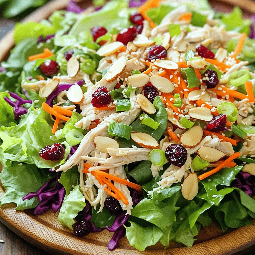 To make this salad, you start with cooked chicken. Shred it into small pieces. In a big bowl, mix the shredded chicken with the greens. Add red cabbage and carrots next. Then, toss in the dried cranberries and sliced almonds. Cover the mix with sesame dressing. Toss gently to coat everything well. Season with salt and pepper to taste. Serve on a platter or in bowls. You can add green onions and sesame seeds on top for a nice touch.