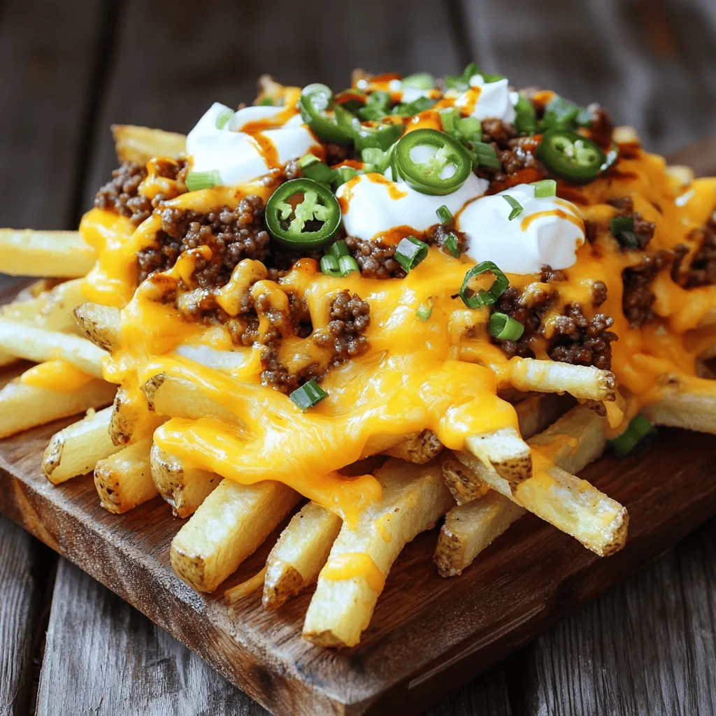 - 4 large russet potatoes - 1 cup shredded cheddar cheese - 1 cup cooked ground beef or turkey - 1/2 cup sour cream - 1/2 cup diced green onions - 1/4 cup sliced jalapeños (fresh or pickled) - 1 teaspoon garlic powder - 1 teaspoon onion powder - Salt and pepper to taste - 2 tablespoons olive oil For Dirty Loaded Fries, you need simple and fresh ingredients. Start with four large russet potatoes. They give the best texture. You'll also need one cup of shredded cheddar cheese. This melts beautifully on top. Next, grab one cup of cooked ground beef or turkey. It adds that meaty flavor we crave. For toppings, sour cream is a must. A half cup will do. You'll also want a half cup of diced green onions for a fresh crunch. If you like spice, add a quarter cup of sliced jalapeños. These can be fresh or pickled, based on your taste. Finally, we have seasonings. You'll need one teaspoon each of garlic powder and onion powder. Don't forget salt and pepper to taste. These bring out the flavors. Use two tablespoons of olive oil to coat the fries before baking. This helps them get crispy and golden. This recipe is fun and easy, making it perfect for gatherings or a cozy night in. You can find the full recipe to make your own delicious Dirty Loaded Fries. - Preheat the oven to 425°F (220°C). - Wash and scrub the russet potatoes. Cut them into fry shapes, about 1/4 inch thick. This size helps them cook evenly. - In a large bowl, toss the cut potatoes with 2 tablespoons of olive oil, 1 teaspoon of garlic powder, 1 teaspoon of onion powder, salt, and pepper. Make sure they are well coated. - Spread the fries in a single layer on a baking sheet lined with parchment paper. Bake for 30-35 minutes, flipping halfway through. This will give you crispy and golden fries. - When the fries are done, take them out of the oven. Immediately add 1 cup of shredded cheddar cheese on top. Return them to the oven for an additional 5 minutes to melt the cheese. - Once the cheese is melted, top the loaded fries with 1 cup of warm cooked ground beef, 1/2 cup of sour cream, 1/2 cup of diced green onions, and 1/4 cup of sliced jalapeños. - If you like some heat, drizzle hot sauce over the top. Enjoy this cheesy, meaty goodness! For the complete recipe, check out the Full Recipe. To make your fries crispy, start with the right cut. Cut the potatoes into even pieces, about 1/4 inch thick. This helps them cook evenly. A sharp knife or a fry cutter works best for uniform fries. For extra crispiness, soak the cut potatoes in cold water for 30 minutes. This removes excess starch. After soaking, dry them well with a towel. Toss the fries in olive oil and seasonings before baking. When baking, spread the fries in a single layer on your baking sheet. This allows hot air to circulate. Flip them halfway through cooking for even browning. Bake at 425°F (220°C) for 30-35 minutes until golden brown. You can add more fun to your dirty loaded fries with toppings. Try crispy bacon bits for a salty crunch. Diced avocado adds creaminess and freshness. For sauces, sour cream is a classic choice. It complements the cheese and beef well. Hot sauce is a great way to add spice. Drizzle it over the top for a kick. Experiment with different flavors to find your favorite combo. Each topping can give your fries a new twist. Enjoy the process of making these loaded fries uniquely yours! {{image_2}} You can switch up the meat on your Dirty Loaded Fries. Instead of ground beef or turkey, try pulled pork or shredded chicken. Both add a juicy and flavorful twist. For a vegetarian option, black beans or chickpeas work great. They offer protein and a hearty texture. Just heat them up and sprinkle them on top. Cheese is key for Dirty Loaded Fries. While cheddar cheese is classic, consider nacho cheese for a creamy texture. Pepper jack cheese adds a spicy kick. If you prefer a dairy-free option, try vegan cheese. Many brands melt well and taste great. This way, everyone can enjoy these loaded fries! You can store leftover dirty loaded fries in the fridge. Use an airtight container for best results. They stay fresh for up to three days. When you want to eat them, reheat in the oven. I recommend setting it to 375°F (190°C). Place the fries on a baking sheet. Bake for about 10-15 minutes. This way, they stay crispy and tasty. You can freeze dirty loaded fries before or after baking them. If you freeze before baking, cut and season the fries first. Spread them on a baking sheet and freeze until solid. Then, transfer the fries to a freezer bag. If you freeze after baking, use a similar method. Just wait until they cool down before packing. When you want to cook frozen fries, add about 5-10 minutes to the baking time. Check for crispiness to make sure they are done. Enjoy your loaded fries anytime! Dirty Loaded Fries are a fun, tasty dish. They start with crispy fries made from large russet potatoes. You add layers of flavor with toppings like: - 1 cup shredded cheddar cheese - 1 cup cooked ground beef or turkey - 1/2 cup sour cream - 1/2 cup diced green onions - 1/4 cup sliced jalapeños (fresh or pickled) You also use seasonings like garlic powder and onion powder. Olive oil helps make the fries crispy. This mix of hot fries and toppings makes each bite full of taste! Yes, you can prep Dirty Loaded Fries in advance. Start by cutting the potatoes into fry shapes. Toss them with olive oil and seasonings. Then, spread them on a baking sheet. Cover the tray with plastic wrap and store it in the fridge. When you are ready to cook, just bake them as directed. This way, you save time and still get crispy fries. Dirty Loaded Fries can be a bit heavy, but there are ways to make them healthier. You can use ground turkey instead of beef. This swaps in less fat. You can also use less cheese or switch to a lighter cheese. Adding veggies like tomatoes or lettuce can boost their nutrition. Enjoy them as an occasional treat, and feel free to make smart swaps! Dirty loaded fri