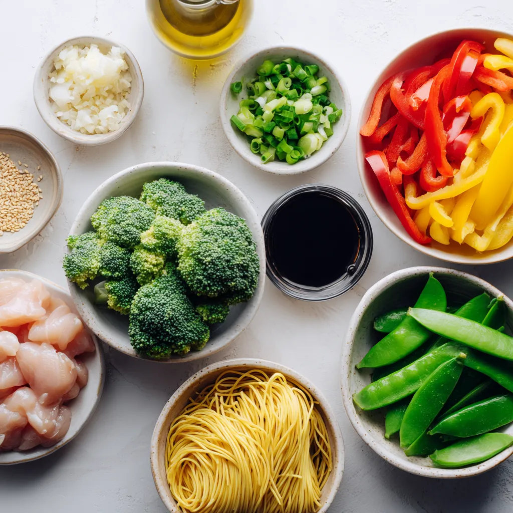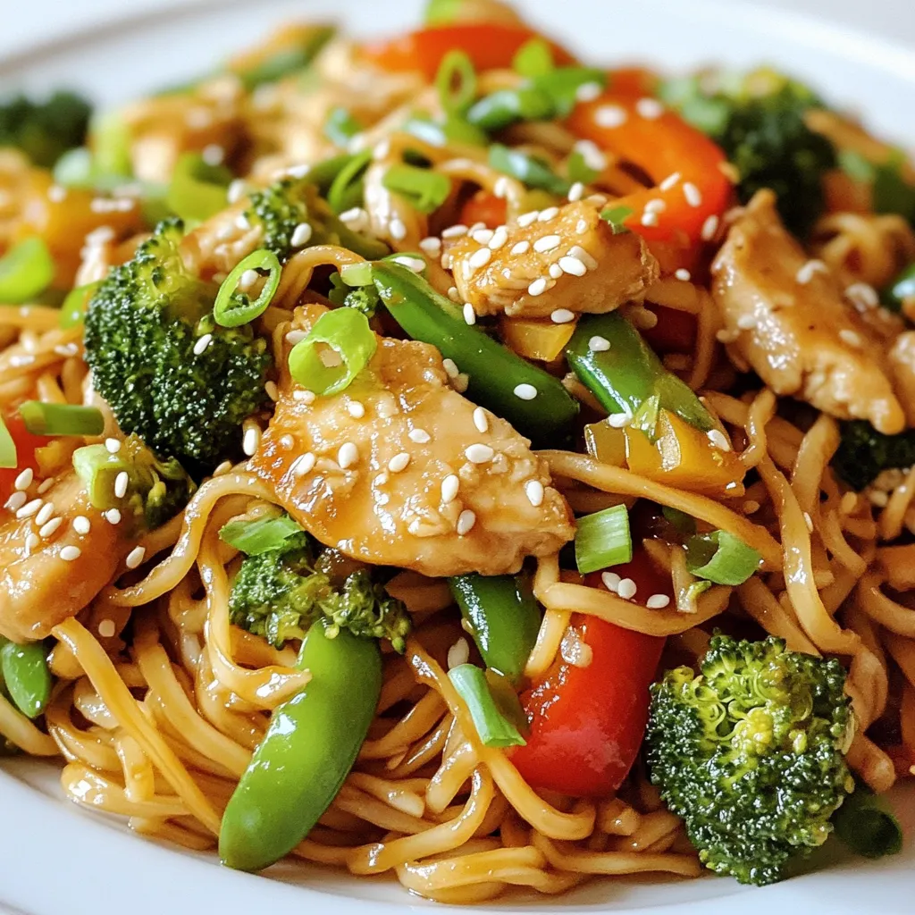 - 8 oz lo mein noodles - 1 lb boneless, skinless chicken breast, sliced thin - 2 tablespoons vegetable oil - 2 cloves garlic, minced - 1 cup broccoli florets - 1 bell pepper, sliced (red or yellow) - 1 cup snap peas - 3 green onions, chopped - 3 tablespoons soy sauce - 1 tablespoon oyster sauce (optional, can substitute with extra soy sauce) - 1 teaspoon sesame oil - Salt and pepper to taste - Sesame seeds for garnish You can swap out lo mein noodles for spaghetti or rice noodles. Chicken can be replaced with tofu or shrimp. For a vegan option, skip the oyster sauce and use more soy sauce. Any mix of vegetables works, like carrots or mushrooms. When picking vegetables, look for bright colors and firm textures. Broccoli should have tight florets and no yellowing. Choose bell peppers that are smooth and shiny. For snap peas, select ones that are crisp. Always smell the produce; it should smell fresh, not sour. {{ingredient_image_1}} Start by boiling a large pot of water. Once the water is boiling, add 8 oz of lo mein noodles. Cook them as per the package instructions. This usually takes about 3-4 minutes. Stir the noodles gently to prevent them from sticking. When they are done, drain them in a colander. Set the noodles aside while you prepare the rest of the dish. Next, take 1 lb of boneless, skinless chicken breast and slice it thin. Heat 2 tablespoons of vegetable oil in a large skillet or wok over medium-high heat. Add the sliced chicken to the skillet. Season it with salt and pepper. Stir-fry the chicken for 5-7 minutes. You want it to be golden brown and cooked through. Once cooked, remove the chicken from the skillet and set it aside. In the same skillet, add 2 cloves of minced garlic. Stir-fry for about 30 seconds until it smells great. Then, add 1 cup of broccoli florets, 1 sliced bell pepper, and 1 cup of snap peas. Cook these veggies for another 3-4 minutes. They should be tender but still crisp. This keeps them bright and fresh. Return the cooked chicken to the skillet with the veggies. Add the cooked lo mein noodles to the mix. Pour in 3 tablespoons of soy sauce, 1 tablespoon of oyster sauce (if you are using it), and 1 teaspoon of sesame oil. Toss everything together well. Make sure the noodles are nicely coated in sauce and heated through. Finally, sprinkle 3 chopped green onions over the top. Toss gently one last time. Serve hot and garnish with sesame seeds for a lovely finish. To make great Chicken Lo Mein, start with the noodles. Use fresh lo mein noodles if you can. If you use dried noodles, boil them until just tender. This usually takes about 4-5 minutes. Drain them well, but do not rinse. Rinsing removes the starch, which helps the sauce stick. You can boost the flavor of your dish in simple ways. Adding ginger can give a nice kick. Try using fresh minced ginger with the garlic. For a bit of heat, add red pepper flakes. You can also mix in some chopped bell pepper. This adds sweetness and color. A splash of lime juice can brighten the dish too. One common mistake is overcooking the chicken. Cook it until it is golden brown. It should be juicy, not dry. Another mistake is not using enough sauce. Make sure to coat the noodles well. If you skip the sesame oil, you lose a lot of flavor. Lastly, don’t overcrowd the pan when cooking. This can steam your food rather than stir-fry it. Pro Tips Prep Your Ingredients: Before you start cooking, make sure to chop and measure all your ingredients. This will streamline your cooking process and ensure everything is ready to go. Use High Heat: For stir-frying, it's essential to use high heat. This helps to quickly sear the chicken and vegetables, preserving their texture and flavor. Don’t Overcook the Vegetables: Keep your vegetables slightly crisp by cooking them just until tender. This adds a nice crunch and vibrant color to your dish. Garnish for Flavor: Don’t skip the sesame seeds and green onions! They add a wonderful flavor and a pop of color to your Chicken Lo Mein. {{image_2}} You can make a tasty vegetarian version of Chicken Lo Mein. Simply swap the chicken for tofu. Use firm tofu for the best texture. Press the tofu to remove excess water. Cut it into cubes and sauté until golden. You can also add more veggies like carrots, mushrooms, or cabbage. This keeps it colorful and nutritious. If you want more protein options, try shrimp or beef. Shrimp cooks quickly and adds a nice flavor. Just sauté them for a few minutes until they turn pink. For beef, use thinly sliced flank steak. Cook it until browned before adding the veggies. Both options give a nice twist to the dish. To spice things up, add chili paste or sriracha. Mix it in with the soy sauce for heat. You can also toss in sliced jalapeños for added flavor. If you love heat, adjust the amount to fit your taste. This version is perfect for those who enjoy a kick in their meal. To keep your Chicken Lo Mein fresh, store it in an airtight container. Make sure the dish is cool before sealing. Refrigerate it within two hours of cooking. Properly stored, it lasts about three days. When you’re ready to eat, reheat your Chicken Lo Mein in a pan. Add a splash of water or soy sauce to help it steam. Stir often over medium heat until hot. You can also use the microwave. Heat in short bursts, stirring in between to avoid hot spots. To freeze Chicken Lo Mein, let it cool completely. Place it in a freezer-safe container, leaving some space for expansion. It can be frozen for up to three months. When ready to enjoy, thaw it overnight in the fridge. Reheat it on the stove or microwave for best results. Yes, you can use other types of noodles. You can try spaghetti, rice noodles, or even egg noodles. Each type offers a unique taste and texture. Just remember to cook them according to the package instructions. Adjust the cooking time for best results. To make Chicken Lo Mein gluten-free, choose gluten-free soy sauce. You can also use rice noodles in place of traditional lo mein