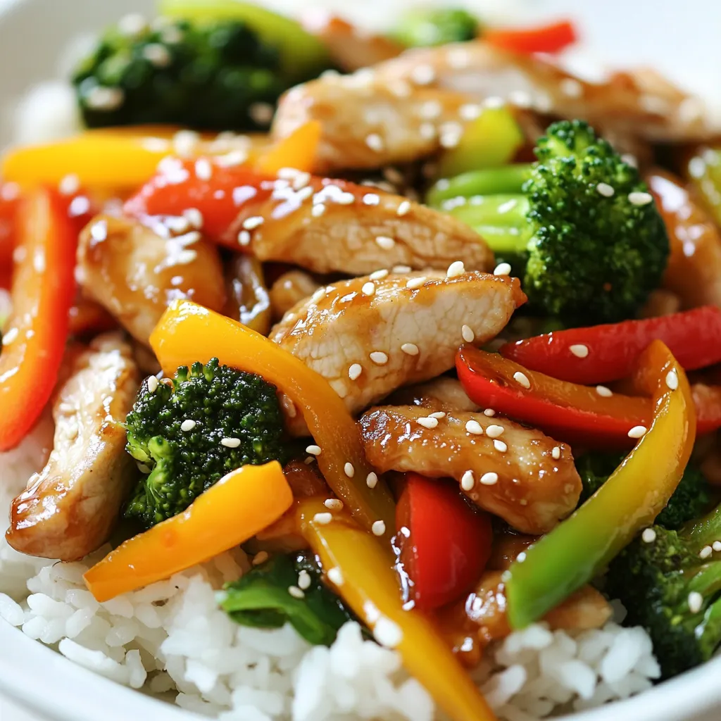 A vibrant and flavorful stir fry featuring tender chicken and a mix of colorful vegetables.