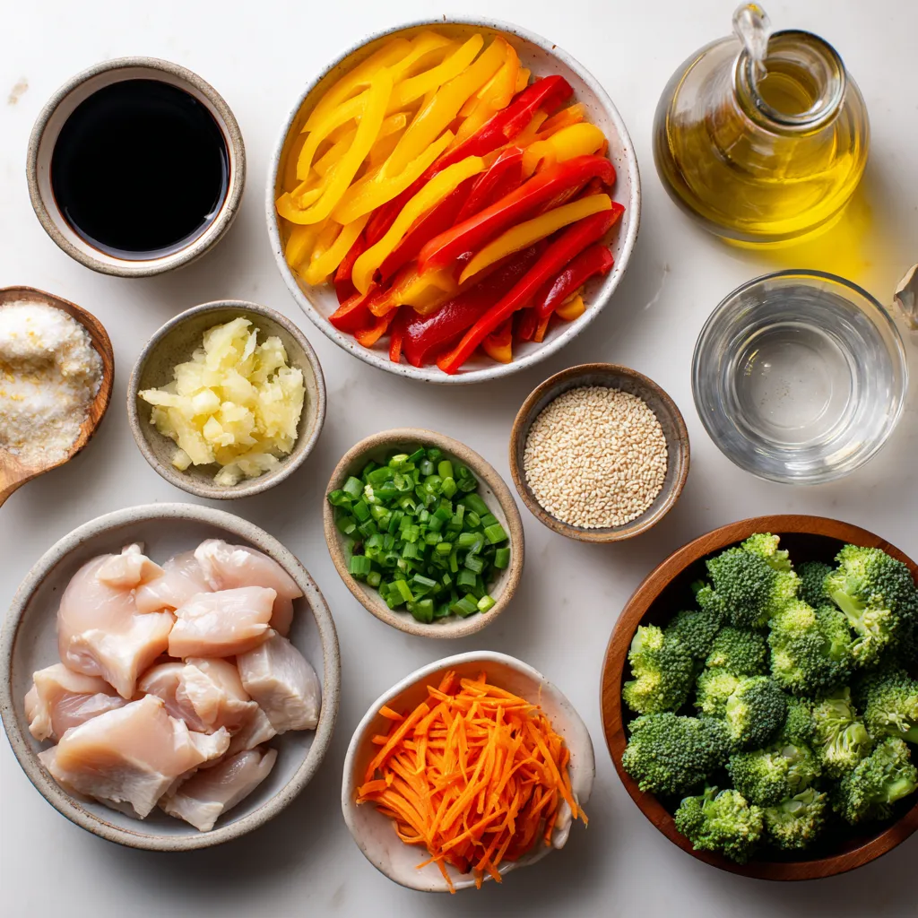 Start by gathering all your ingredients. You need two boneless, skinless chicken breasts. Slice them thin so they cook fast. Next, get two cups of mixed bell peppers. Use red, yellow, and green for color. Cut them into strips. Grab one cup of broccoli florets and two carrots. Julienne the carrots into thin strips. Don’t forget three cloves of garlic. Mince them well. For a kick, you need a one-inch piece of ginger. Grate it finely. Set these aside. In a small bowl, mix two teaspoons of cornstarch with one tablespoon of water. This will help thicken your sauce later.