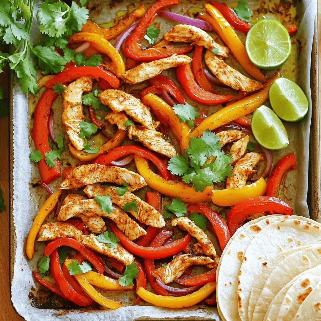 ![For my Easy Sheet Pan Fajitas, you need a few key items. Here’s the list: - 1 pound boneless chicken breast, sliced into thin strips - 1 red bell pepper, sliced - 1 yellow bell pepper, sliced - 1 medium red onion, sliced - 3 tablespoons olive oil - Salt and pepper to taste - Fresh cilantro, for garnish - Flour tortillas, for serving - Lime wedges, for serving These ingredients come together to create a colorful and tasty dish. The chicken adds protein, while the peppers and onion give it a fresh crunch. To make your fajitas pop with flavor, you’ll want to add some seasonings. Here’s what I use: - 2 teaspoons chili powder - 1 teaspoon cumin - 1 teaspoon garlic powder - 1 teaspoon onion powder These seasonings create a warm and zesty taste. Chili powder brings heat, while cumin adds a nice earthy flavor. Garlic and onion powder boost the overall taste without being too overpowering. Serving your fajitas can be fun and creative. I like to wrap them in warm flour tortillas. It makes each bite soft and satisfying. Fresh lime wedges are a must. Squeeze lime juice on top for a zesty kick. You can also add toppings like diced avocado, sour cream, or salsa. Fresh cilantro adds a nice touch, too. With these options, you can customize your meal to fit everyone’s taste. For the complete recipe, check out the [Full Recipe]. It gives you all the steps to make this easy and delicious meal! First, gather all your ingredients. You need one pound of boneless chicken breast. Slice the chicken into thin strips. Next, take one red bell pepper and one yellow bell pepper. Slice them into thin strips too. Then, grab a medium red onion and slice it as well. Add these veggies to a large bowl with the chicken. Now, drizzle three tablespoons of olive oil over the chicken and veggies. Sprinkle two teaspoons of chili powder, one teaspoon of cumin, one teaspoon of garlic powder, and one teaspoon of onion powder. Add salt and pepper to taste. Toss everything together until the chicken and veggies are well coated with the spices. Preheat your oven to 425°F (220°C). Line a large baking sheet with parchment paper. Spread the chicken and veggie mixture in a single layer on the baking sheet. This helps them cook evenly. Bake in the preheated oven for 20 to 25 minutes. Stir the mixture halfway through for even cooking. The chicken should be cooked through, and the veggies should be tender. Once the timer goes off, carefully remove the baking sheet from the oven. Let the fajitas rest for a few minutes. This helps the flavors blend together. To serve, warm your flour tortillas in the oven or microwave. Spoon the chicken and veggie mix onto the tortillas. Garnish with fresh cilantro for a pop of color and flavor. Squeeze some fresh lime juice over the top for extra zest. Enjoy your easy sheet pan fajitas with friends or family. For the complete recipe, check out the Full Recipe section. To cook chicken and veggies just right, use thin strips. This helps them cook evenly. When roasting, space them out on the pan. Crowding the pan can lead to steaming instead of roasting. Stir halfway through to ensure all pieces get the heat. Look for the chicken to reach 165°F. The vegetables should be tender and slightly charred. To amp up the taste, try adding lime juice and zest before serving. Fresh herbs, like cilantro, make a big difference. You can also add a dash of smoked paprika for a smoky kick. If you like heat, toss in some sliced jalapeños. For a sweet touch, add a bit of honey or agave to your spice mix. A large baking sheet is key for even cooking. Use one that is rimmed to catch any juices. Parchment paper helps with easy clean-up and prevents sticking. A good mixing bowl makes it easy to toss ingredients with oil and spices. If you have a meat thermometer, it’s a handy tool to check chicken doneness. For serving, grab some warm flour tortillas and lime wedges to complete your meal. For the full recipe, check the notes above. {{image_2}} You can make sheet pan fajitas without meat. Replace chicken with hearty veggies. Try using mushrooms, zucchini, or chickpeas. These options give you great texture and flavor. Season them just like the meat version. Use the same spices for a tasty meal. Serve with warm tortillas and fresh toppings. Add avocado or guacamole for creaminess. Switching proteins can bring fun twists. Use shrimp, beef, or pork for different tastes. If you want leaner options, turkey works well too. Each protein will soak up the spices nicely. Adjust cooking times based on what you choose. Shrimp cooks quickly, while beef may need more time. Keep an eye on them to avoid overcooking. Exploring flavors can make your fajitas unique. For a smoky taste, add chipotle powder. If you prefer a sweet touch, include some paprika or cinnamon. Fresh herbs like oregano or thyme can brighten the dish. You can also experiment with citrus zest for a fresh kick. Don't hesitate to mix and match spices from what you have at home. Each batch can be a new adventure! For the full recipe, check the Easy Sheet Pan Fajitas section. After you enjoy your sheet pan fajitas, store any leftovers right away. Place them in an airtight container. Make sure to cool them down first before sealing. This step keeps your fajitas fresh and tasty. Store them in the fridge for up to three days. When it's time to eat your leftovers, you can reheat them easily. The best way is to use your oven. Preheat the oven to 350°F (175°C). Spread the fajitas on a baking sheet and heat for about 10-15 minutes. This method keeps the chicken juicy and the veggies crisp. You can also microwave them, but the oven gives better results. If you want to save your fajitas for later, freezing is a great option. First, let the fajitas cool completely. Then, place them in a freezer-safe bag or container. Squeeze out any air and seal it tightly. They can last in the freezer for up to three months. When you're ready to enjoy them, thaw in the fridge overnight and rehea
