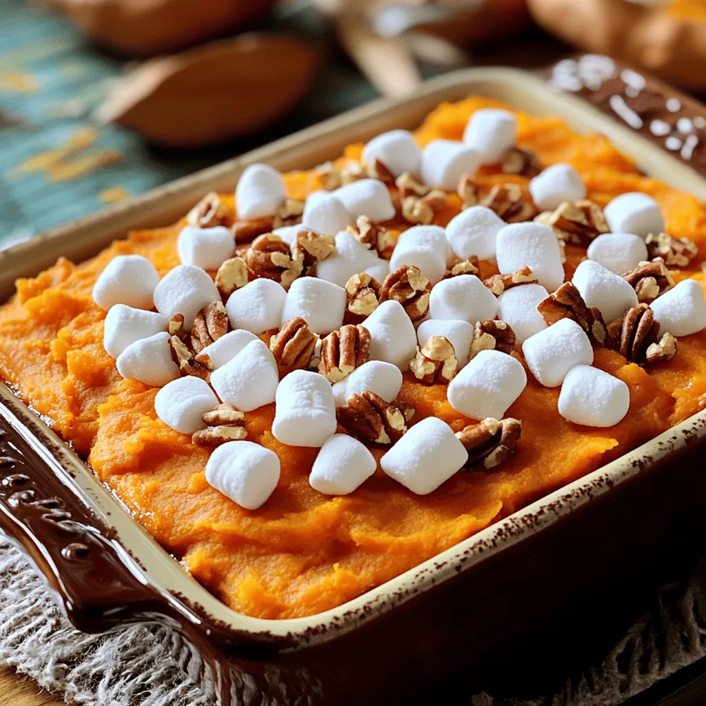 To create a delicious sweet potato casserole, you'll need the following key ingredients: - 4 medium sweet potatoes, peeled and cubed - 1/2 cup brown sugar - 1/4 cup unsalted butter, melted - 1/2 cup milk - 1 teaspoon vanilla extract - 1/2 teaspoon ground cinnamon - 1/4 teaspoon nutmeg - 1 cup mini marshmallows - 1/2 cup chopped pecans (optional) These ingredients form the base of your casserole. The sweet potatoes provide a creamy texture. The brown sugar adds sweetness, while the butter makes everything rich and smooth. Cinnamon and nutmeg give it that warm, cozy flavor we love. If you want to add your twist, consider these optional ingredients: - Use maple syrup instead of brown sugar for a deeper flavor. - Substitute almond milk for a dairy-free version. - Add crushed ginger snaps or graham crackers on top for crunch. - Mix in some diced apples or pears for extra sweetness. These variations can give your casserole a unique touch and make it your own. To make this casserole, you need a few handy tools: - A large pot for boiling the sweet potatoes - A mixing bowl for combining ingredients - A potato masher or fork to mash the sweet potatoes - A 9x13-inch baking dish for baking - An oven for cooking Having the right tools makes cooking easier. They help you stay organized and keep your kitchen tidy. Make sure you have everything ready before you start. This way, you can enjoy making your Easy Sweet Potato Casserole. For the full recipe, check out Sweet Potato Delight Casserole. Start by peeling and cubing four medium sweet potatoes. You want them to be about the same size. This helps them cook evenly. Next, place the cubes in a large pot and cover them with water. Bring the water to a boil. Once boiling, let the sweet potatoes cook for 15 to 20 minutes. They should be tender when you poke them with a fork. After boiling, drain the sweet potatoes and let them cool for a few minutes. Now, take the cooled sweet potatoes and mash them in a mixing bowl. You want them smooth and creamy. Add in half a cup of brown sugar, a quarter cup of melted unsalted butter, and half a cup of milk. Next, mix in one teaspoon of vanilla extract, half a teaspoon of ground cinnamon, and a quarter teaspoon of nutmeg. Stir everything together until it is well combined. This mixture should be rich and flavorful. Spread the sweet potato mixture evenly in a greased 9x13-inch baking dish. Then, sprinkle one cup of mini marshmallows on top. If you like, you can add half a cup of chopped pecans for some crunch. Preheat your oven to 350°F (175°C). Bake the casserole for 25 to 30 minutes. Look for the marshmallows to turn golden brown. This indicates that it’s heated through. Once done, take it out of the oven and let it cool for a few minutes before serving. Enjoy your delicious sweet potato delight! For the complete instructions, check the Full Recipe. To make your sweet potato casserole great, watch out for a few things. First, don’t overcook the sweet potatoes. If they are too soft, they will become watery. You want them tender but firm enough to mash. Next, measure your ingredients carefully. Too much sugar can make it overly sweet, while too little can leave it bland. Lastly, don’t skip greasing the baking dish. This helps with easy serving later. Choosing the right sweet potatoes is key to success. Look for firm, smooth skin without any bruises or soft spots. The color can vary from orange to purple, but I prefer the classic orange for its sweetness. When choosing, pick medium-sized potatoes. They cook evenly and blend well in the casserole. Spices can really elevate your casserole. Ground cinnamon and nutmeg add warmth and depth. I like to add a pinch of salt, too. It brings out the natural sweetness of the potatoes. You might also try adding a bit of ginger for a spicy kick. If you want to go a step further, consider mixing in some maple syrup. It adds a rich flavor that pairs well with sweet potatoes. For the best results, start with the Full Recipe and adjust to your taste! {{image_2}} You can make a vegan sweet potato casserole by swapping a few ingredients. Instead of milk, use almond or coconut milk. Replace butter with coconut oil or vegan butter. For sweetness, maple syrup works well in place of brown sugar. These options keep the dish rich and creamy while being plant-based. To make this casserole gluten-free, simply check your labels. Most sweet potatoes are gluten-free. Use gluten-free butter or oil for the same effect. You can also choose gluten-free marshmallows. These small changes help you enjoy this dish without worry. Experimenting with toppings can take your casserole to a new level. You might try crushed graham crackers for a crunchy layer. Another fun option is adding a sprinkle of cacao nibs for a chocolate kick. If you want something savory, consider adding crumbled feta or goat cheese. Each topping brings its own flair, making your casserole special. For the complete recipe, see the Full Recipe. To keep your sweet potato casserole fresh, store it in an airtight container. Let it cool before covering. If you leave it out, it can spoil quickly. It’s best to store leftovers in the fridge for up to four days. When you're ready to enjoy leftovers, preheat your oven to 350°F (175°C). Place the casserole in an oven-safe dish. Cover it with foil to keep it moist. Heat for about 20 minutes or until it’s warm throughout. If you're in a hurry, you can use the microwave. Just heat it in short bursts, stirring in between. You can freeze sweet potato casserole for future meals. First, let it cool completely. Then, place it in a freezer-safe container. It should last for about three months. When you're ready to eat it, thaw it overnight in the fridge. After that, follow the reheating instructions. This way, you can enjoy this simple and flavorful dish anytime! For the full recipe, check out Sweet Potato Delight Casserole. Yes, you can make Sweet Potato Casserole ahead of time. Prepare the dis