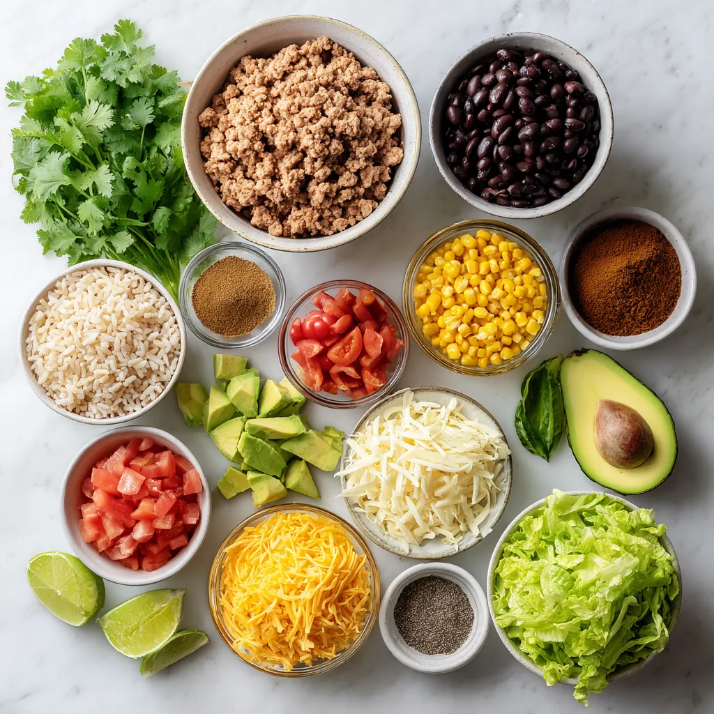 A delicious and hearty taco rice bowl featuring ground turkey or beef, black beans, corn, and fresh toppings.