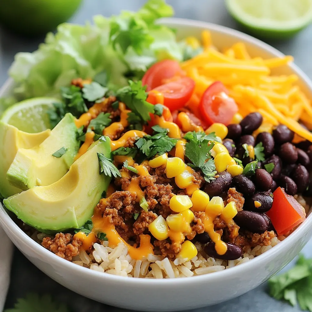 Presentation matters. Layer the rice first in your bowl. Then, add your taco meat mixture. Top it off with fresh avocado, lettuce, and cheese. Use a sprinkle of cilantro for color. Serve lime wedges on the side for that refreshing squeeze. A well-presented bowl makes the meal more inviting and fun!