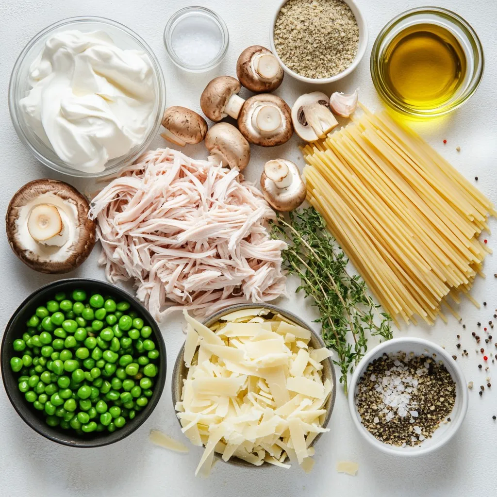 A comforting and creamy pasta dish featuring turkey, mushrooms, and cheese.
