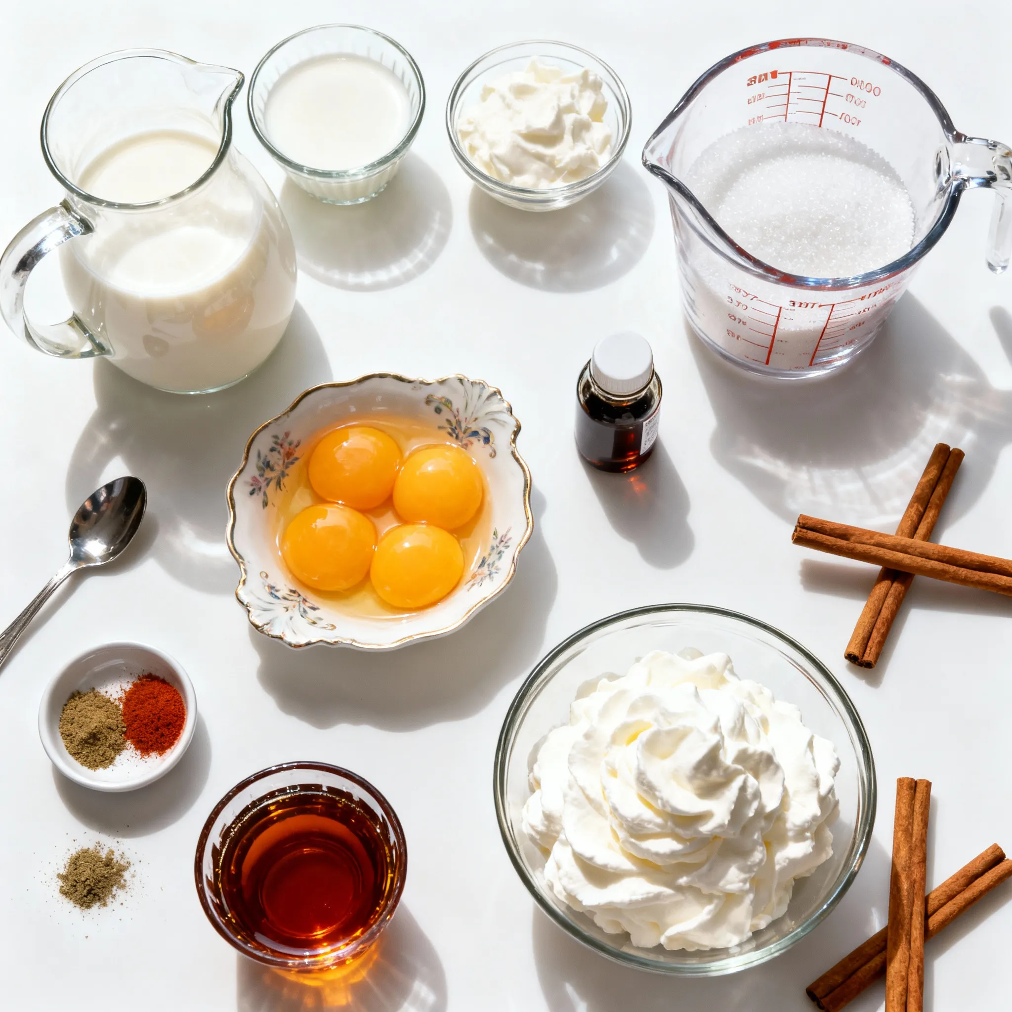To make the Fireball Eggnog, start by gathering your ingredients. You need whole milk, heavy cream, egg yolks, sugar, vanilla extract, and spices.