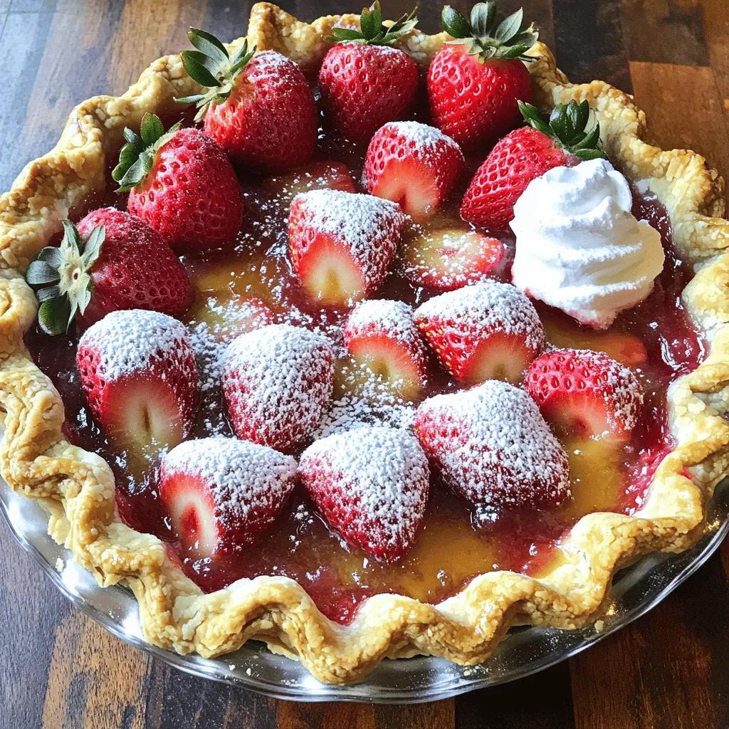 For this fresh strawberry pie, you need: - 2 cups fresh strawberries, hulled and halved - 1 cup granulated sugar - 1 tablespoon fresh lemon juice - 1/4 teaspoon salt These fresh strawberries shine in this pie. They add a sweet and tangy taste. Choose ripe, juicy strawberries. They should be bright red and firm. This ensures the best flavor and texture. To enhance the taste of your pie, gather these extra ingredients: - 1 tablespoon cornstarch - 1/2 teaspoon vanilla extract The cornstarch helps thicken the filling. It keeps the pie from being runny. Vanilla adds warmth and depth to the flavor. The lemon juice brightens the overall taste. You can choose between these pie crust options: - 1 pre-made pie crust (store-bought or homemade) Store-bought crusts save time. They are often flaky and delicious. If you prefer, make your own crust. A homemade crust can be more flavorful. It allows you to control the ingredients. This pie is simple and fun to make. You can find the full recipe easily. Enjoy the process and the tasty results! Start by washing your strawberries. Use fresh, ripe berries for the best taste. Remove the green tops and cut them in half. This helps the strawberries mix well with the other ingredients. Place the berries in a medium bowl and set them aside. This simple step ensures a sweet and juicy pie. In a medium saucepan, combine the halved strawberries, sugar, lemon juice, and salt. Stir gently over medium heat until the strawberries begin to release their juices, which takes about 3 to 4 minutes. This process softens the berries and brings out their flavor. In a small bowl, mix cornstarch with 2 tablespoons of water to make a slurry. This helps thicken the filling. Add the slurry to the saucepan and stir constantly until it thickens, about 2 to 3 minutes. Remove the pan from heat, then stir in the vanilla extract. Your filling is now ready! Pour the strawberry mixture into your pre-made pie crust. Spread it evenly for a nice look. Preheat your oven to 425°F (220°C) before baking. Place the pie in the oven and bake for 15 to 20 minutes, or until the crust turns golden brown and the filling bubbles. After baking, let the pie cool for at least 1 hour. This time allows the filling to set. Enjoy your delicious pie, served with whipped cream if you like! For the full recipe, refer to the recipe section above. Always choose ripe strawberries. Look for bright red color and a sweet smell. Avoid berries with dark spots or mold. Wash them gently under cold water. Pat them dry with a clean towel. Hull the strawberries carefully to keep them whole. Halving them creates beautiful, even pieces for your pie. A good pie crust is key to great pie. Use cold butter for a flaky texture. If you make your own crust, chill it before rolling. This helps keep the butter solid. If using a store-bought crust, follow the package directions. Pre-bake the crust for a few minutes to prevent sogginess. Serve your fresh strawberry pie with whipped cream on top. You can add a sprinkle of powdered sugar for flair. Garnish with whole strawberries for a pop of color. Place the pie on a pretty plate. This makes it look even more appetizing. Enjoy your pie as a sweet treat after dinner! {{image_2}} You can mix strawberries with rhubarb for a tart twist. Rhubarb adds a nice zing. Just use equal parts of each fruit. Prepare the filling as usual, but adjust the sugar. Rhubarb is more tart, so you may need a little extra sugar. This mix brings a unique flavor to your pie. It is fresh, sweet, and sour. If you need a gluten-free pie, choose a gluten-free pie crust. You can find these in stores or make your own. Use almond flour or coconut flour for the crust. The filling stays the same. Just ensure your ingredients, like cornstarch, are gluten-free. This way, everyone can enjoy this tasty dessert. You can also play with other fruits in your pie. Try adding blueberries, raspberries, or blackberries. Each fruit gives a different taste and color. Combine strawberries with peaches for a sweet summer pie. Use equal amounts of strawberries and the other fruit. This keeps the balance and flavor just right. Mixing fruits can lead to new favorite recipes. To store your leftover pie, cover it well. Use plastic wrap or foil to keep it fresh. If you have a pie dish with a lid, that works great too. Place the pie in the fridge. It will stay good for about 2 to 3 days. If you notice any moisture, it may affect the crust. Freezing your pie is easy and smart. First, let the pie cool completely. Wrap it tightly in plastic wrap, then in foil. This helps prevent freezer burn. You can freeze it for up to 3 months. When you are ready to enjoy it, thaw it in the fridge overnight. To reheat your pie, preheat your oven to 350°F (175°C). Remove the pie from the fridge and unwrap it. Bake it for about 10-15 minutes. This warms the pie and keeps the crust crisp. If you want a quick fix, you can use the microwave. Heat it in short bursts, about 15-20 seconds each. Check often to avoid overheating. Yes, you can use frozen strawberries. However, the pie may be a bit watery. Frozen strawberries have more moisture than fresh ones. Make sure to thaw and drain them well before using. This will help keep your pie from being too soggy. Fresh Strawberry Pie lasts about 3 to 4 days in the fridge. To keep it fresh, cover it well with plastic wrap. The longer it sits, the softer the crust may get. So, it's best to enjoy it within a few days. The best way to serve Strawberry Pie is chilled, with a dollop of whipped cream on top. You can also add a sprinkle of powdered sugar for a sweet touch. For a fun twist, serve it with a scoop of vanilla ice cream. This adds a creamy taste that pairs well with the sweet strawberries. Here’s a simple recipe for fresh strawberry pie. This pie shines with bright flavors and is easy to make. You will need some basic ingredients to bring it to life. - 2 cups fresh strawberries, hulled and halved - 1 cup granulated sugar 