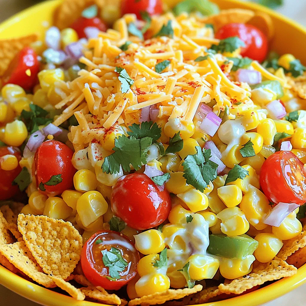 ![For this Frito Corn Salad, fresh corn is best. You can use two cups of corn kernels. If fresh corn is not available, a can of corn works too. Just make sure to drain it well. Fresh corn gives a sweet and crunchy taste. It adds a pop of color and nutrition. This salad needs some bright veggies. Use one cup of cherry tomatoes, halved. They add sweetness and color. Choose a bell pepper of any color and dice it. You will need half a red onion, finely chopped. This gives a nice bite to the salad. Don't forget the cheese! Add one cup of shredded cheddar cheese. It melts in your mouth and gives a rich flavor. The dressing is key for this dish. You will need half a cup of mayonnaise. This makes the salad creamy. Add one tablespoon of lime juice for a tangy kick. One teaspoon of chili powder brings in some spice. Finally, use salt and pepper to taste. Mix all these ingredients well for a smooth dressing. It ties all the flavors together perfectly. You can check out the Full Recipe for more details. Start by gathering your fresh corn. You can use two cups of corn kernels or one can of corn. If using fresh corn, cut the kernels from the cob. Next, take one cup of cherry tomatoes and slice them in half. Then, grab one bell pepper of any color and dice it. Finally, chop half a red onion finely. Place all these veggies in a large mixing bowl. This colorful mix gives your salad a fresh taste. In a separate bowl, add half a cup of mayonnaise. Then, mix in one tablespoon of lime juice and one teaspoon of chili powder. Next, sprinkle in salt and pepper to taste. Whisk these ingredients together until the dressing is smooth. This creamy dressing adds flavor and ties the salad together perfectly. Now, pour the dressing over the bowl of vegetables. Stir gently to combine everything. Be careful not to mash the veggies. Just before serving, fold in one and a half cups of Fritos corn chips and one cup of shredded cheddar cheese. This adds a great crunch. Taste the salad and adjust the seasoning if needed. Transfer it to a serving bowl and garnish with fresh cilantro. For extra flair, serve with lime wedges on the side. For the full recipe, check out the details above. I love to serve Frito Corn Salad at parties and picnics. It looks colorful and tastes great. You can serve it in a big bowl or on a platter. Add extra Fritos on top for a fun crunch. A few lime wedges on the side also add a nice touch. This salad pairs well with grilled meats and sandwiches. You can swap ingredients based on what you have. If you can’t find fresh corn, use canned corn. You can also try black beans instead of corn for a different flavor. If you want a lighter option, Greek yogurt works well in place of mayonnaise. Use mozzarella cheese instead of cheddar for a milder taste. To make Frito Corn Salad even better, add a pinch of cayenne pepper for heat. Fresh herbs like parsley or dill can brighten the dish. You can also toss in avocado for creaminess. A splash of vinegar can balance the flavors too. These small changes can make your salad pop! For the full recipe, visit the link above. {{image_2}} You can switch up the Frito Corn Salad ingredients for fun flavors. Try adding black beans for protein. You can use sweet bell peppers or even spicy jalapeños for heat. Swap the cheddar cheese with pepper jack for a kick. If you like crunch, add diced cucumbers or radishes. You can also use Greek yogurt instead of mayonnaise for a lighter touch. Make this salad fit your event theme. For a barbecue, add grilled corn or smoked paprika. If it’s a fiesta, mix in diced avocados and serve with tortilla chips. For a picnic, use mini Fritos bags as fun serving options. You can even serve the salad in a watermelon bowl for summer parties. This salad can meet many dietary needs. For a vegan option, skip the cheese and mayo. Use avocado or a vegan dressing instead. If you want it gluten-free, choose gluten-free Fritos or corn chips. You can also make it low-carb by omitting the chips and using cauliflower rice. This makes it flexible for all your guests. After enjoying your Frito corn salad, store any leftovers in an airtight container. Keep it in the fridge for up to three days. Make sure to separate the Fritos if you want them crispy. If you mix them in, they may get soft. You don’t need to reheat this salad. Frito corn salad is best served cold. If you must warm it, do so gently in a pan over low heat. Avoid a microwave to keep the texture nice. To keep your Frito corn salad fresh, add the Fritos right before serving. This helps them stay crunchy. If you store the salad, you can also add extra lime juice to keep the corn and veggies zesty. Always check for freshness before eating. Yes, you can make Frito Corn Salad ahead of time. I suggest mixing the corn, veggies, and dressing. Keep the Fritos separate until you serve. This way, they stay crispy. If you mix them too early, the chips will get soggy. You can store the salad in the fridge for up to a day. Just remember to add the Fritos just before serving. To spice up Frito Corn Salad, consider adding jalapeños. Fresh or pickled jalapeños both work well. You can also use a spicier chili powder or hot sauce. Another great option is to mix in some diced green chiles. These additions give the salad a nice kick. Just be careful not to add too much spice at once. You want to keep the balance of flavors. Yes, you can make a gluten-free version of Frito Corn Salad. Look for gluten-free corn chips as a substitute for regular Fritos. Many brands offer gluten-free options that taste great. Always check the label to be sure. The rest of the salad is naturally gluten-free. Fresh corn, veggies, and cheese are all safe. Enjoy the same great taste without the gluten! For the full recipe, check out the [Full Recipe]. This blog post covers all you need for a tasty Frito Corn Salad. We explored fresh ingredients, easy steps, and great tips. You learned how to prepare veggies, make a simple dressing, and mi