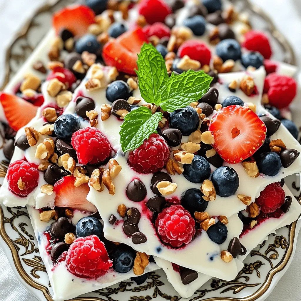 To make frozen yogurt bark, you need a few key ingredients: - 2 cups Greek yogurt (plain or flavored) - 1 tablespoon honey or maple syrup (optional) - 1/2 cup mixed berries (strawberries, blueberries, raspberries) - 1/4 cup chopped nuts (almonds, walnuts, or pistachios) - 2 tablespoons dark chocolate chips (optional) These ingredients create a creamy and tasty treat. The Greek yogurt gives it a rich base. You can use any flavor of yogurt you like. If you want your bark a bit sweeter, try adding honey or maple syrup. Just one tablespoon will do. This step is optional, so feel free to skip it if you prefer less sweetness. The berries and other toppings add their own natural sweetness too. You can get creative with your toppings! Here are some fun ideas: - Fresh fruits like banana slices or kiwi - Nuts such as pecans or hazelnuts - Granola for a crunchy texture - Coconut flakes for extra flavor Mix and match these options to find your favorite combination. Each topping adds a new twist to your frozen yogurt bark. To start, gather your ingredients. You will need Greek yogurt, mixed berries, nuts, and more. Line a baking sheet with parchment paper. This helps with easy removal later. In a bowl, mix Greek yogurt with honey or maple syrup. Stir until smooth and creamy. Then, spread the yogurt mixture on the lined baking sheet. Aim for about 1/4 inch thick. This thickness helps it freeze well. Next, sprinkle your mixed berries over the yogurt. Press them in gently so they stick. Then, add your chopped nuts and dark chocolate chips. Spread them evenly for a nice crunch. Use a spatula to spread the yogurt. Start from the center and push out to the edges. This method helps to keep the layer even. If you want a smooth top, use the back of the spatula. Make sure there are no holes or gaps. These could lead to uneven freezing. Once you have everything spread out, place the baking sheet in the freezer. Freeze it for at least 4 hours. This time allows the yogurt to become solid. If you want to check if it’s ready, poke it gently. If it feels firm, it’s done. After freezing, take it out and peel off the parchment paper. Now you can break the bark into pieces. Serve right away or store in an airtight container in the freezer. You can find the full recipe above for more details. To get that ideal texture in your frozen yogurt bark, use full-fat Greek yogurt. This yogurt is rich and creamy, giving a nice bite. If you choose a low-fat version, it may freeze too hard. Mix in honey or maple syrup for a touch of sweetness. This makes the bark softer and easier to break apart. Spread the yogurt about 1/4 inch thick on the baking sheet. A thicker layer may take longer to freeze, so keep it even. You can make frozen yogurt bark your own! Try using different fruits like mango or kiwi. Each fruit adds a special taste and color. For nuts, use what you love—almonds, walnuts, or pistachios work great. Want more fun? Add dark chocolate chips or coconut flakes. Be creative! You can even mix in spices like cinnamon or vanilla for extra flavor. Just ensure you balance the flavors with the yogurt base. When it’s time to serve, break the bark into pieces of any size. Arrange them on a nice plate for a fun look. Add fresh mint leaves on top for a pop of green. A drizzle of honey over the bark makes it even more appealing. You can also pair it with fresh fruit on the side. This gives a nice touch and adds to the fun. Enjoy your frozen yogurt bark as a cool snack or a light dessert! For a full recipe, check the Full Recipe. {{image_2}} You can use various yogurts for your bark. Greek yogurt is thick and creamy. It offers a rich taste. You can also try flavored yogurts like vanilla or strawberry. These add a fun twist. For a lighter option, use regular yogurt. Each choice gives a unique flavor to your treat. Seasonal fruits make great toppings. In summer, choose fresh berries like strawberries and blueberries. In fall, add sliced apples or pumpkin spice. Winter calls for citrus fruits like oranges or pomegranates. Each season brings new tastes. Don’t forget to add nuts for crunch. They add a nice texture and flavor contrast. You can easily make this treat vegan. Use coconut yogurt or almond yogurt instead of dairy. These options are creamy and delicious. For sweetening, use maple syrup or agave nectar. They blend well with plant-based yogurts. This way, everyone can enjoy Frozen Yogurt Bark without dairy. To keep your frozen yogurt bark fresh, place it in an airtight container. I prefer using a glass or plastic container with a tight lid. This helps keep moisture out and flavor in. If you made a big batch, you can also wrap the bark pieces in plastic wrap before placing them in the container. Make sure to layer parchment paper between the pieces to avoid sticking. If you have leftovers, you can re-freeze them easily. Just ensure the bark is in an airtight container. When you're ready to enjoy it again, take it out and let it sit for a few minutes. This softens it slightly, making it easier to break into pieces. If it was not fully thawed before, it may have a little ice. Just give it a gentle squeeze or tap to break it apart. Frozen yogurt bark can last up to two months in the freezer. After this time, it may lose some flavor and texture. To enjoy it at its best, eat it within the first month. The yogurt may become icy but should still taste good. When you pull it out, check for any off smells or changes in color. If it looks good, it’s still safe to eat. For the best experience, serve it fresh or within a few weeks of making it. Frozen yogurt bark is a fun, tasty treat. It is made from yogurt that you freeze. You can add fruits, nuts, and chocolate to it. When frozen, you can break it into pieces. Each bite is cool and creamy. It’s a great way to enjoy yogurt in a new form. You can make it with Greek yogurt for a thicker texture or use flavored yogurt for more taste. The best part? You can customize it however you