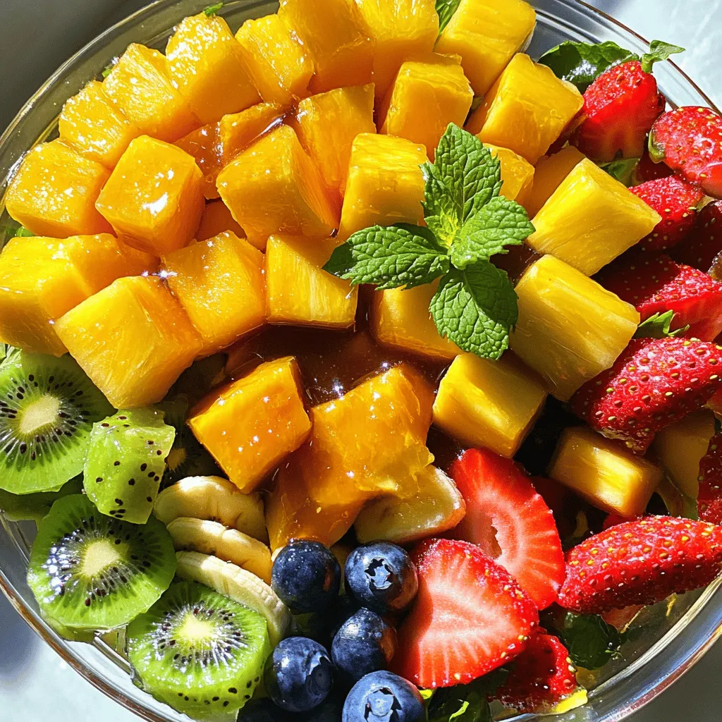 ![To make a tasty fruit salad, gather these fresh fruits: - 1 cup diced pineapple - 1 cup diced mango - 1 cup hulled and halved strawberries - 1 cup blueberries - 1 kiwifruit, peeled and diced - 1 banana, sliced These fruits add color and flavor. Pineapple brings a sweet and tangy taste. Mango adds a tropical twist. Strawberries are juicy and bright. Blueberries are small and packed with nutrients. Kiwifruit gives a lovely texture. Finally, banana adds creaminess. For a zesty and sweet dressing, use: - 2 tablespoons honey - 2 tablespoons lime juice - Zest of 1 lime - Fresh mint leaves for garnish The honey adds sweetness, while lime juice gives a refreshing kick. Lime zest enhances the flavor with its bright notes. Mint leaves add a lovely aroma and look great on top. This salad is not only tasty but healthy, too. - Calories per serving: about 120 - Macronutrient breakdown: - Carbohydrates: 30g - Protein: 1g - Fat: 0.5g The fruits are rich in vitamins, fiber, and antioxidants. Pineapple and mango boost your immune system. Strawberries help with heart health. Blueberries are good for your brain. Kiwifruit aids digestion, and bananas provide energy. Enjoy this salad for a healthy treat! Check out the Full Recipe for more details. To make the fruit salad, start by washing all the fruits. You want them clean and ready. Here’s how to dice and slice each fruit: - Pineapple: Cut off the top and bottom. Stand it up and slice off the skin. Cut the fruit into long strips, then dice into small pieces. - Mango: Stand the mango upright. Slice along the pit on both sides. Dice the flesh into cubes. - Strawberries: Remove the green tops. Slice the strawberries in half or quarters, depending on size. - Blueberries: These are easy! Just rinse and they’re ready to go. - Kiwifruit: Peel the kiwi with a knife. Cut it in half and then slice it into small pieces. - Banana: Simply peel and slice it into rounds. Make sure to keep each fruit in its own bowl until you mix them together. The dressing adds a nice zing! To make it, grab a small bowl. Here’s how to mix your honey lime dressing: 1. Add 2 tablespoons of honey to the bowl. 2. Squeeze in 2 tablespoons of lime juice. 3. Grate the zest of 1 lime and add it to the mix. Whisk everything together until it’s smooth and well combined. You can taste it to see if you need more honey or lime. Now, it’s time to bring everything together. Here are some tips on how to toss the fruit without mashing: - Gently add all the prepared fruits to a large mixing bowl. - Pour the honey lime dressing over the fruits. - Use a large spoon to carefully toss the fruit and dressing together. Start from the bottom, lifting the fruit up rather than stirring aggressively. Let the salad sit for about 10 minutes. This helps the flavors mix nicely. Transfer it to a serving bowl or cups for a pretty display. Don’t forget to add fresh mint leaves for garnish! For the full recipe, check out the details above. Enjoy your refreshing fruit salad! To make a great fruit salad, pick fresh, ripe fruits. I love using seasonal fruits because they taste the best. In summer, try peaches, berries, or watermelon. In fall, apples, pears, and grapes shine. Always wash your fruits well to remove dirt and pesticides. You can boost the taste of your fruit salad with spices or herbs. Try adding a pinch of cinnamon for warmth. A sprinkle of nutmeg can add depth. Fresh herbs, like basil or mint, can brighten the dish. Just a little can make a big difference. Make your fruit salad look stunning for gatherings. Use a clear bowl to show off the colors. You can also serve in individual cups for a nice touch. Garnish with mint leaves on top for a pop of green. This makes your salad not just tasty, but beautiful too. For more ideas, check out the Full Recipe! {{image_2}} You can make this fruit salad even more fun by adding tropical fruits. Consider using papaya, which adds a sweet touch. Coconut flakes also bring a nice crunch and flavor. Other great options include kiwi, passion fruit, or even dragon fruit. These fruits add vibrant colors and unique tastes to your salad. Mix and match your favorites for a delightful twist. If you want a vegan option, use agave syrup instead of honey. This keeps the sweetness without using any animal products. For a sugar-free dressing, try a sugar substitute like stevia. You can also skip the dressing altogether and use fresh lime juice alone. This makes it refreshing and light. To make your salad exciting, think about adding some crunch. Nuts like chopped almonds or walnuts work well. They add a nice texture and healthy fats. You can also sprinkle in some chia seeds or sunflower seeds. These are nutritious and give a satisfying crunch. Adding these elements can elevate your fruit salad. For the full recipe, see [Full Recipe]. To keep your fruit salad fresh longer, store it in an airtight container. This helps reduce air exposure, which can cause the fruit to brown. Place a piece of plastic wrap directly on the salad before sealing it. This creates another layer of protection. Always keep the salad in the fridge until you are ready to eat. Fresh fruit can last about three days in the fridge. Can you freeze fruit salad? Freezing fruit salad is not the best idea. Many fruits get mushy after thawing. If you want to freeze it, use fruits that hold up well, like pineapple or mango. However, you may lose some texture and flavor. It's best to enjoy your salad fresh! Can this salad be made ahead of time? Yes, you can make this salad a few hours in advance. Just remember to add the honey lime dressing right before serving. This keeps the fruit crisp and flavorful. If you prep it too early, the fruits may release juices and become soggy. Keeping the dressing separate helps maintain the salad's fresh taste. For the full recipe, check out the Tropical Bliss Fruit Salad! Fruit salad lasts about 2 to 3 days in the fridge. To keep it fresh, store it in an airtight container. This helps