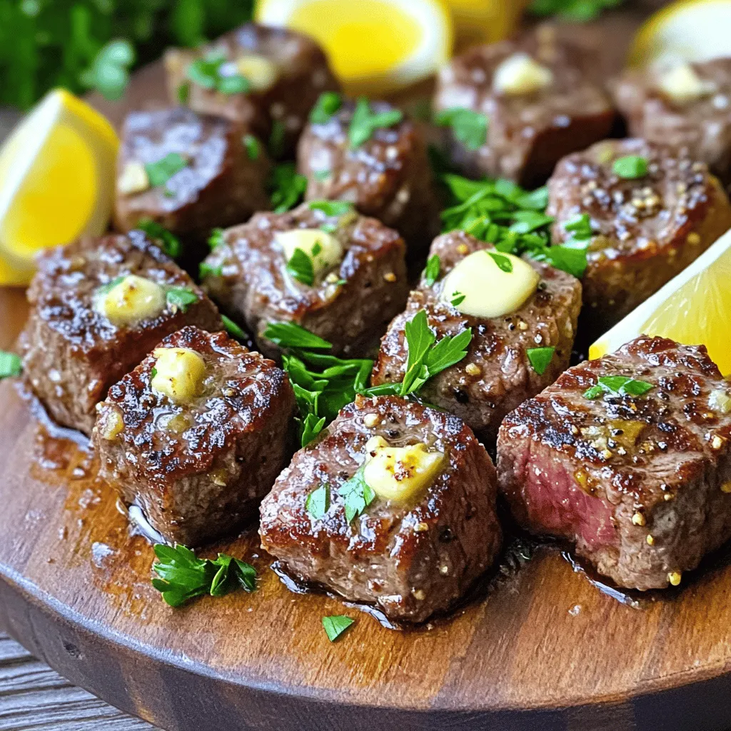![- 1 lb sirloin steak - Salt and black pepper - 4 tablespoons unsalted butter - 4 cloves garlic, minced - Fresh parsley - Fresh rosemary (or dried) - 1 teaspoon lemon juice - A pinch of red pepper flakes - Large skillet - Tongs - Serving platter To make Garlic Butter Steak Bites, you will need some key ingredients. First, choose a good cut of steak. I prefer sirloin because it's tender and full of flavor. You can also use ribeye or filet mignon if you want to be fancy. Next, season the steak with salt and black pepper. This simple step adds a lot of taste. You will also need unsalted butter and garlic. Garlic brings a rich, savory taste that pairs well with the steak. Mince the garlic into small pieces for the best flavor. You can add optional ingredients for extra flavor. Fresh parsley and rosemary give a nice herbal touch. Lemon juice adds brightness, while red pepper flakes bring heat. These are all great ways to customize your dish. For tools, a large skillet is a must. It helps cook the steak bites evenly. Use tongs to flip the steak without losing any juices. Lastly, have a serving platter ready to show off your yummy dish. This combination of ingredients and tools makes for a quick, easy, and flavorful meal. For the full recipe, check out the details above to start your cooking adventure! Seasoning the steak cubes First, take your sirloin steak and cut it into 1-inch cubes. This size helps them cook evenly. Next, season the steak cubes well with salt and black pepper. Make sure every piece is coated. This seasoning adds flavor and enhances the taste of the beef. Properly heating the pan Now, grab a large skillet and place it over medium-high heat. Add 2 tablespoons of unsalted butter and let it melt. You want the butter to sizzle, signaling that the pan is hot enough. A hot pan is key to getting a nice sear on the meat. Searing the steak bites Once the pan is ready, add the seasoned steak cubes. Make sure to place them in a single layer. Do not overcrowd the pan; this lets them sear nicely. Cook one side for 2-3 minutes until it turns golden brown. Then, flip the cubes and cook for another 2 minutes, or until they reach your desired doneness. Medium-rare is usually the best choice for steak bites. Adding garlic and herbs After searing, lower the heat to medium. It’s time to add flavor! Toss in minced garlic, chopped parsley, and fresh rosemary. Stir them around for 1-2 minutes. You want the garlic to become fragrant but not burnt, as burnt garlic can taste bitter. Incorporating butter and lemon Next, add the remaining 2 tablespoons of butter to the skillet. Squeeze in some lemon juice, and if you like spice, add a pinch of red pepper flakes. Toss the steak bites in this buttery mixture. Cook until the sauce is bubbling, which takes just a minute. Serving suggestions When ready, remove the skillet from heat. Let the steak bites sit for a minute to soak up the flavors. Serve them on a platter, garnished with more parsley and some lemon wedges. This adds color and a fresh touch. For gatherings, consider using toothpicks for easy serving. Enjoy your Garlic Butter Steak Bites! For the full recipe, refer to the earlier section. To get the best doneness, start with a hot pan. Heat your skillet until it shimmers. This helps create a nice sear on the steak. For medium-rare, cook the steak bites for 2-3 minutes on each side. Use a meat thermometer if you want precision; aim for 130°F. Do not overcrowd the pan. If you add too many steak bites, they will steam instead of sear. This will make them less tasty. Work in batches if needed. You want each piece to get that golden crust. To boost flavor, consider adding spices and herbs. Fresh thyme or oregano can add depth. You can mix and match to find your favorite. A pinch of red pepper flakes also brings a nice kick. Adjust the amount based on your heat preference. It can turn a good dish into a great one. For plating, arrange the steak bites on a wide platter. This gives them space and looks inviting. Add a sprinkle of parsley on top for a pop of color. Lemon wedges on the side also add brightness. They look great and give a fresh taste. You can even use toothpicks for easy serving at parties. This adds a fun touch for your guests. {{image_2}} You can switch the sirloin steak for chicken or pork. Both meats work well with garlic butter. For chicken, use chicken breast cut into small pieces. For pork, pork tenderloin is a great choice. These options will give you delicious bites with a different taste. If you prefer vegetarian options, try mushrooms or tofu. Use portobello mushrooms for a hearty bite. You can also cube firm tofu for a protein-rich dish. Both options soak up the garlic butter flavor nicely. Mix up the herbs for more flavor. Try basil, thyme, or even oregano. Each herb adds a unique taste to the dish. You can also use a blend of herbs for an exciting twist. Adding sauces or marinades before cooking can change the flavor too. Consider using soy sauce or teriyaki sauce. These sauces add depth and make the steak bites even more tasty. Pair garlic butter steak bites with sides like rice, mashed potatoes, or salads. These sides complement the rich flavors of the steak. They also help create a balanced meal. You can also transform the steak bites into a wrap or sandwich. Use a soft tortilla or crusty bread. Add your favorite toppings like lettuce, tomatoes, or cheese for a fun and easy meal. For the full recipe, check out [Full Recipe]. To store leftover garlic butter steak bites, let them cool down first. Place them in an airtight container. Make sure to seal it well to keep the moisture in. They will stay fresh in the fridge for up to three days. To keep them tasty, do not store them with sides, as they can absorb flavors. When you’re ready to enjoy your steak bites again, the best way to reheat them is in a skillet. Heat the skillet over medium heat and add a little butter or oil. Place the steak bites in the skillet and cook f