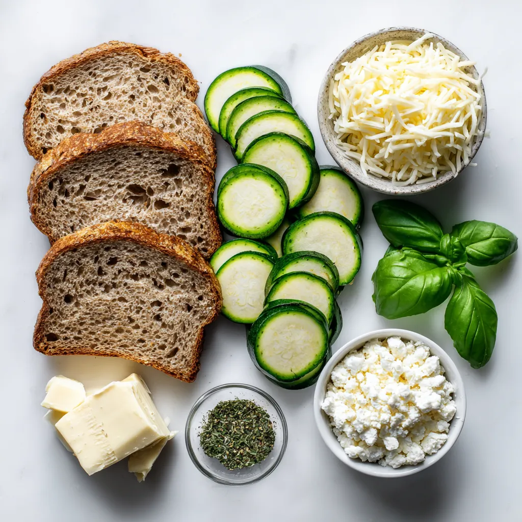 Each ingredient plays a key role in this dish. Whole-grain bread gives a hearty base. Zucchini adds a fresh taste and texture. Unsalted butter creates a rich flavor, while garlic elevates the taste. Mozzarella offers a melty, gooey goodness. Feta adds a tangy kick. Dried oregano brings in warmth, while salt and pepper balance the flavors. Fresh basil is a perfect finishing touch.